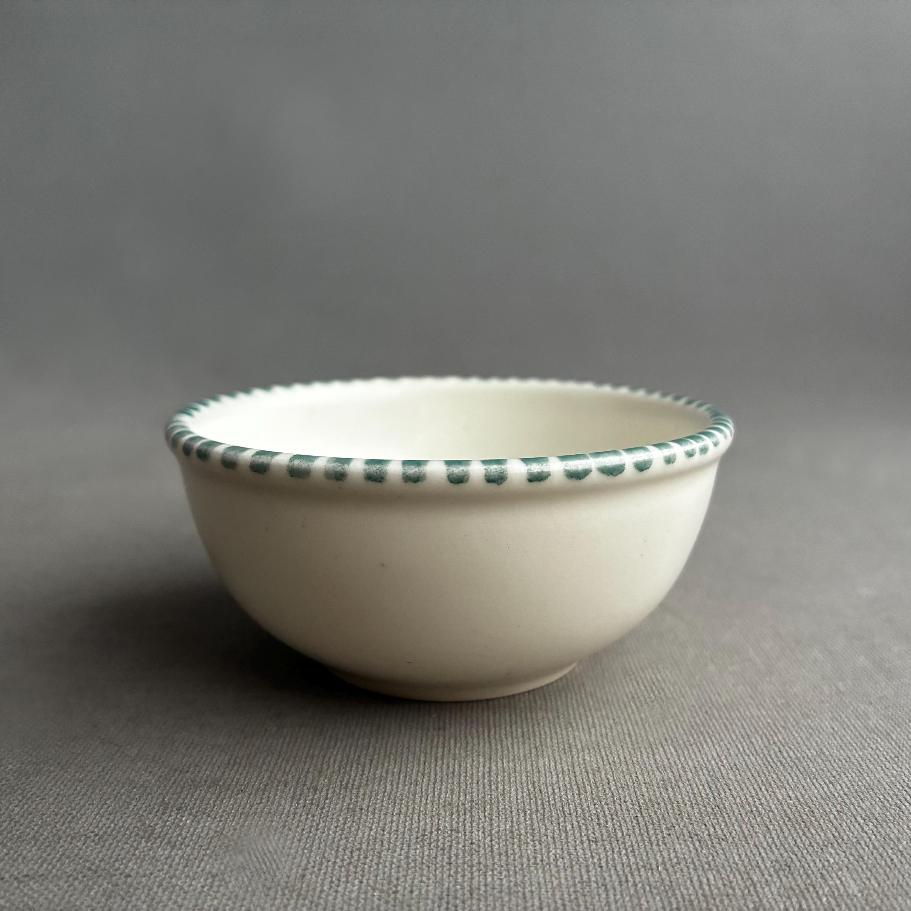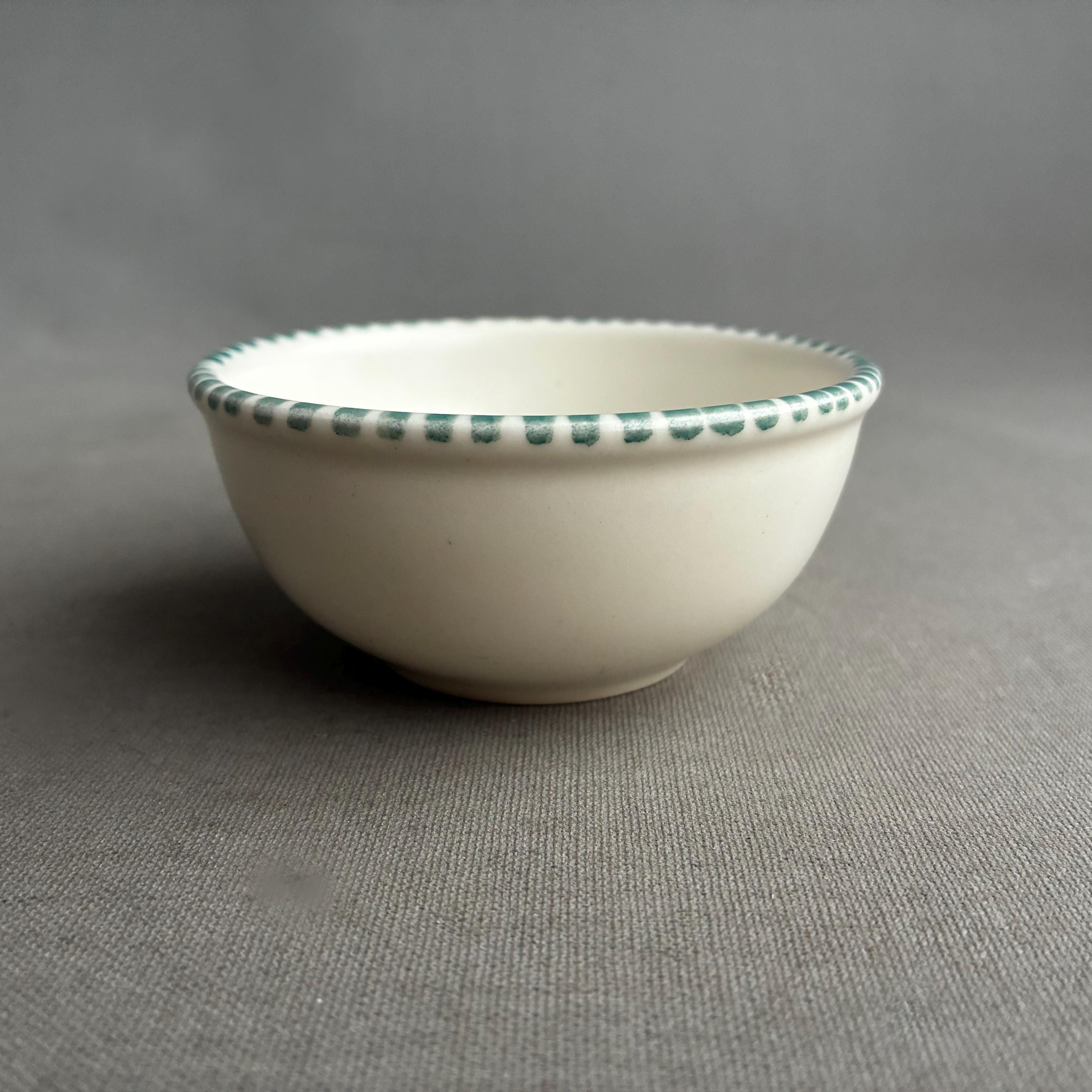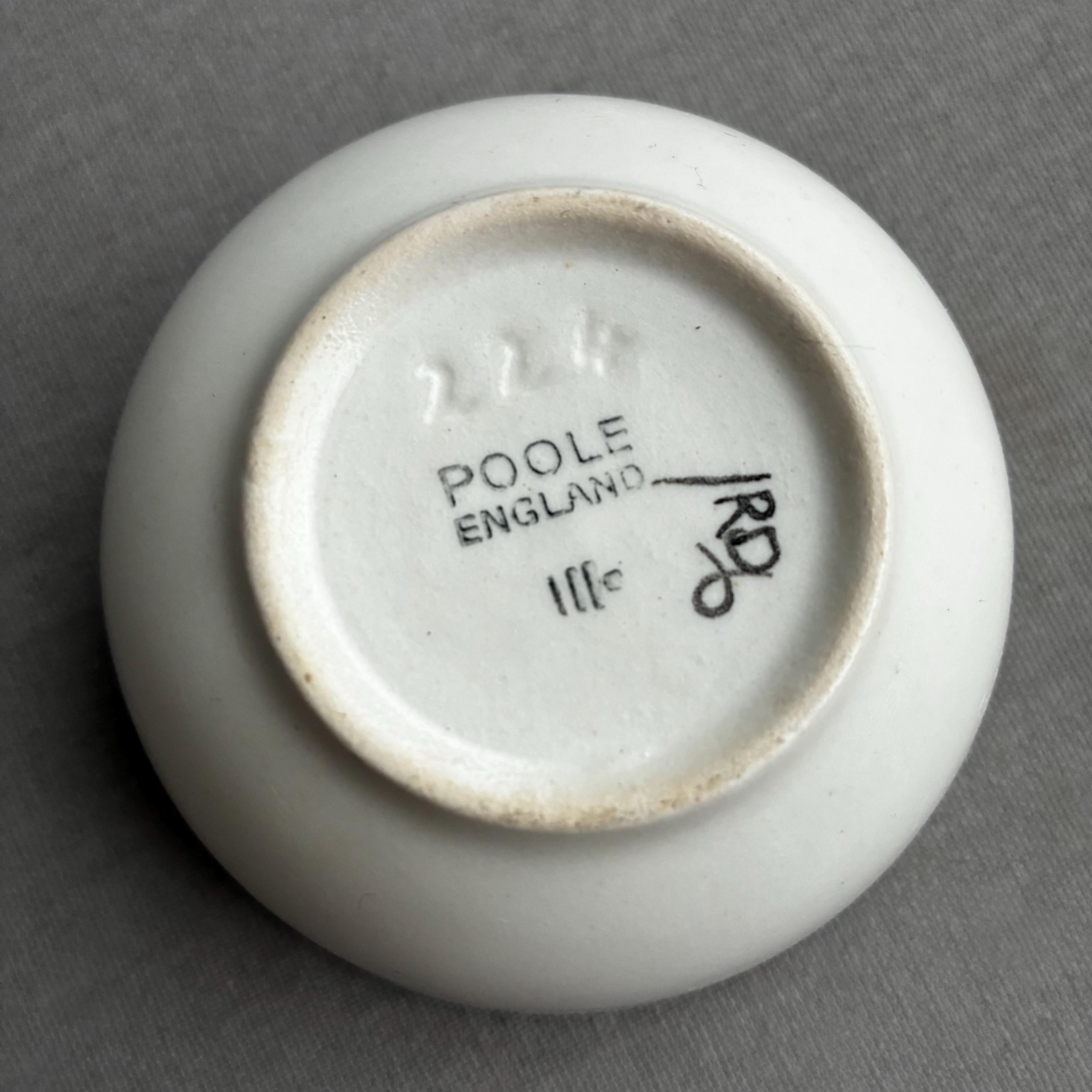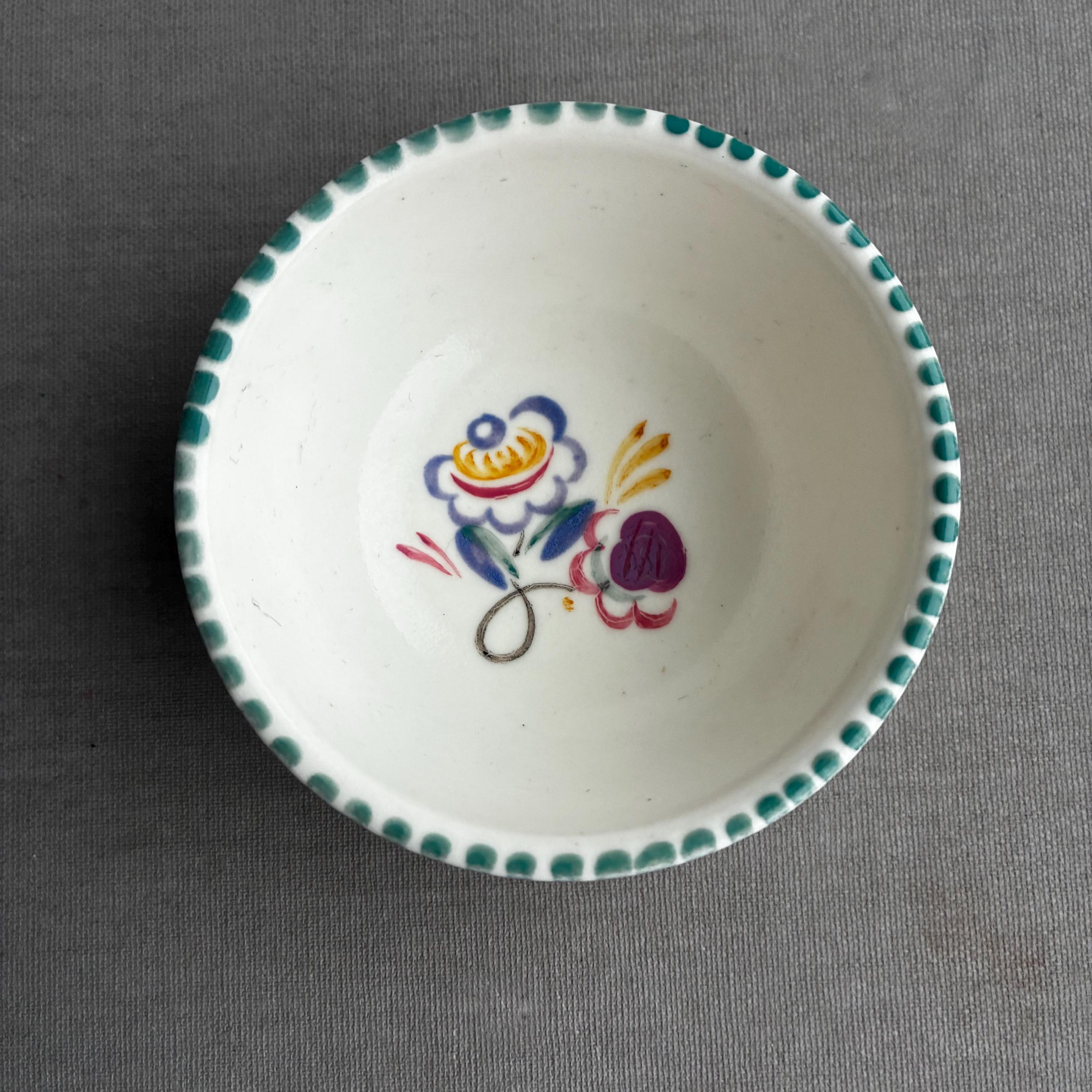A vintage Poole Pottery traditional ware small dish / pin tray, featuring the floral 'RL' pattern -a hand-painted floral motif with a teal or green dotted rim on a Ceramic with a matte finish.