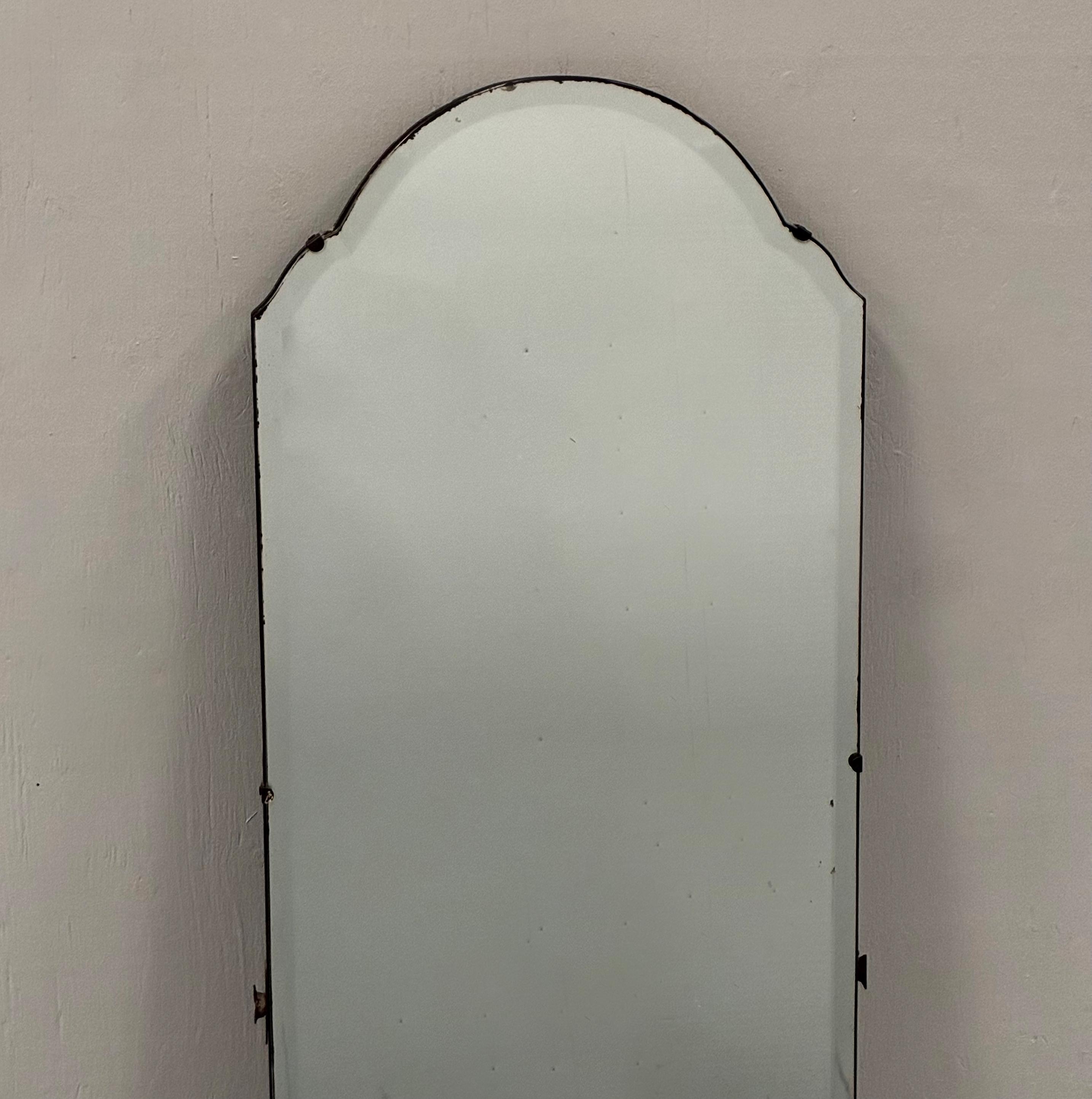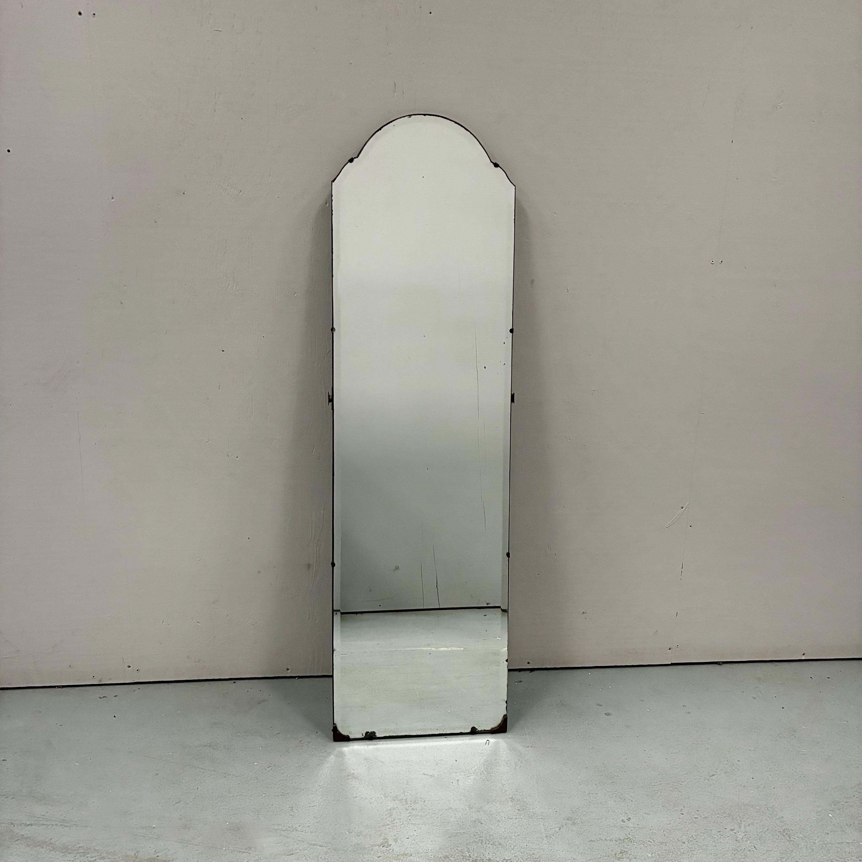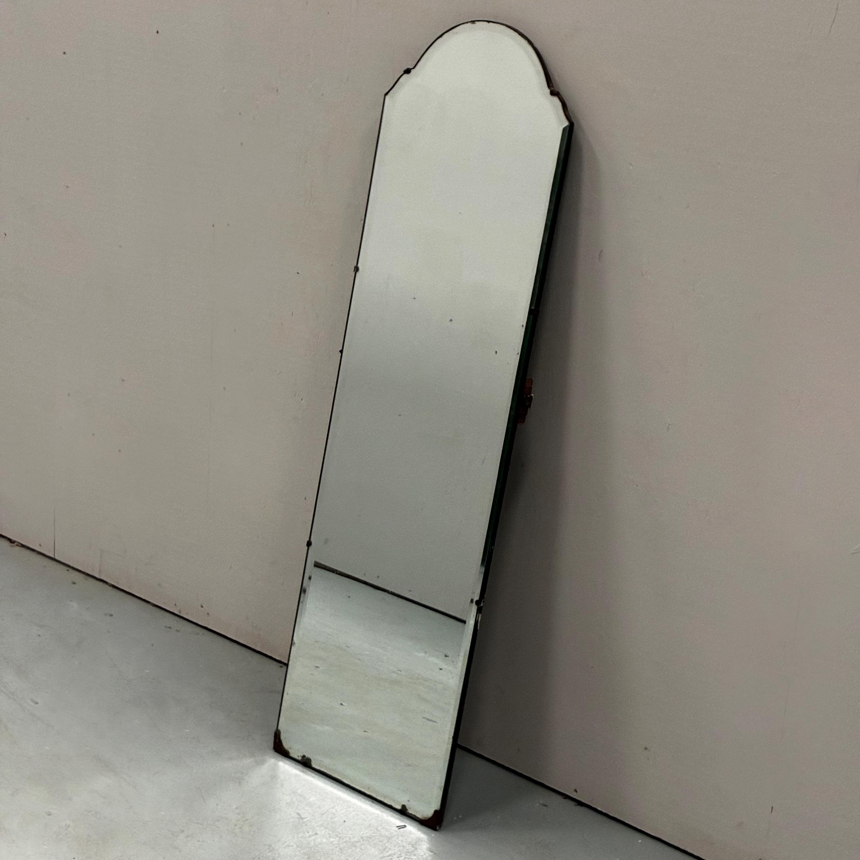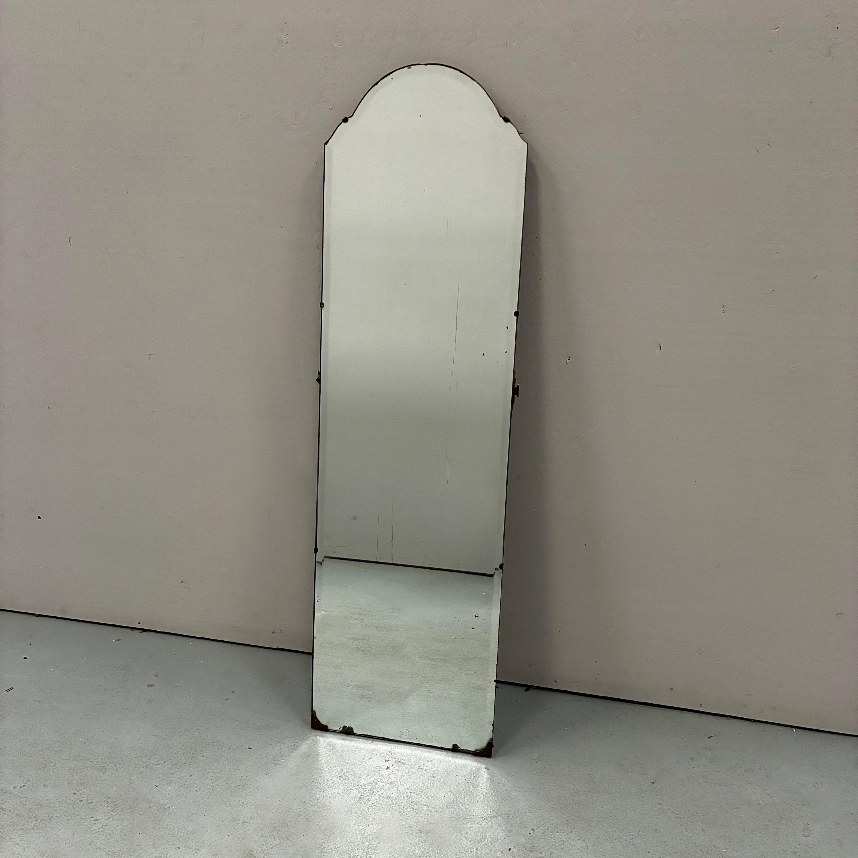 Art Deco style beveled full length wall mirrorcirca 1930s/1940s Tall and narrow with a arched shape at the top of the mirror. Mirror is attached to wooden back and is rather weighty . It has lovely foxing and patina on the mirror which is hard to photograph and describe . A vintage deco style mirror with very practical uses as well .Measures 122 cm tall x 35.5 cm wide x 1.5 cm deep. Uk delivery only ( delivery fee is an estimate please email with post code for exact postage cost )