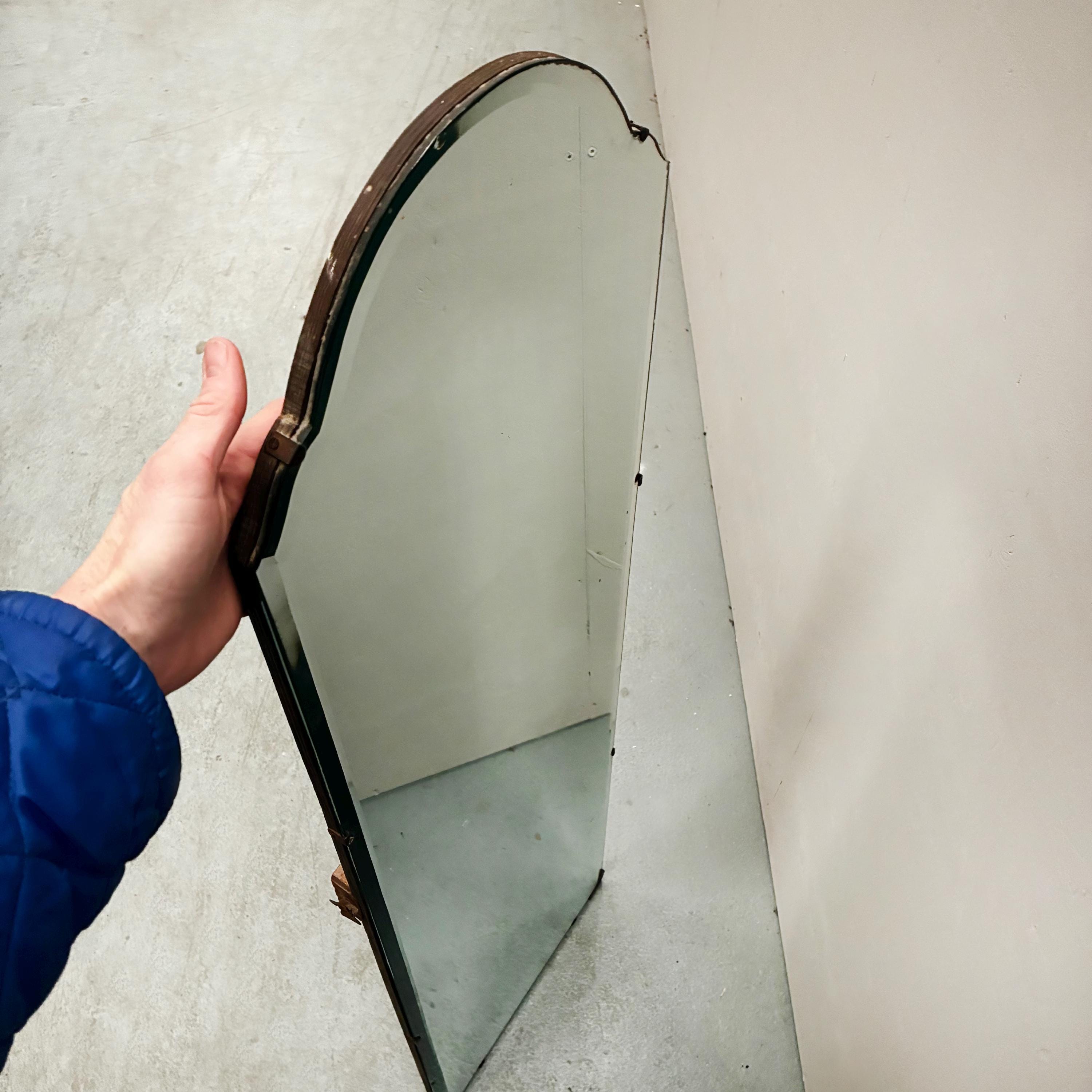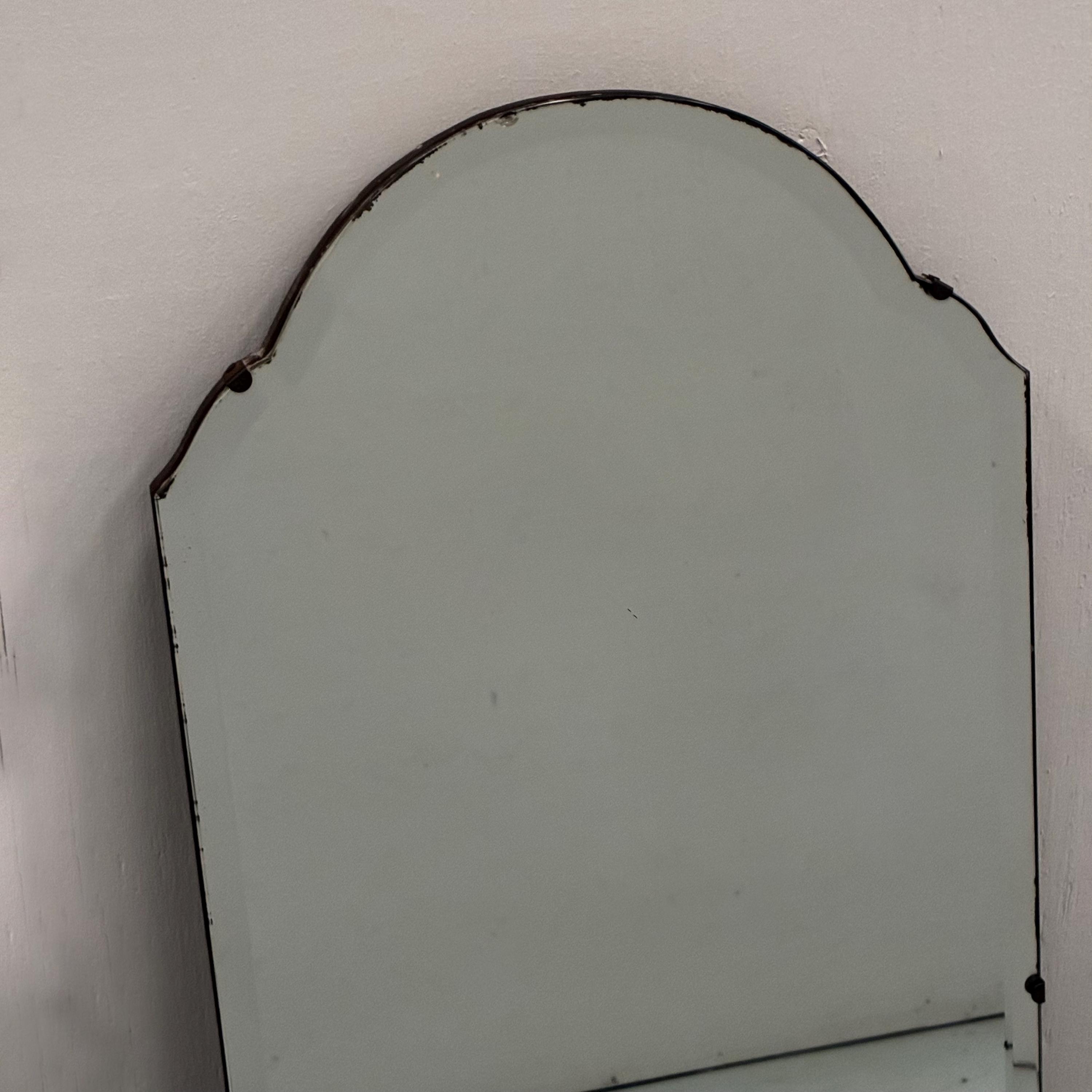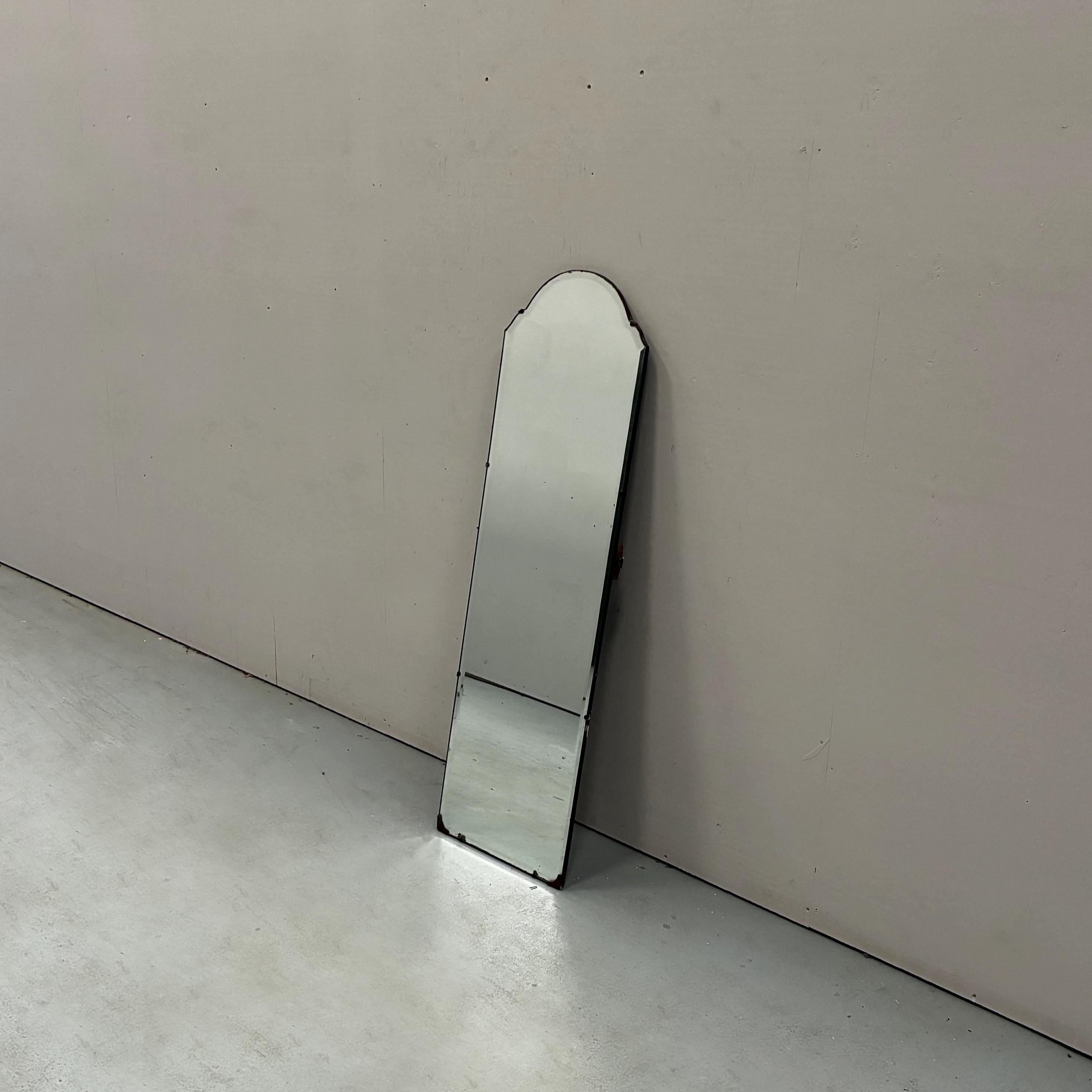 Art Deco style beveled full length wall mirrorcirca 1930s/1940s Tall and narrow with a arched shape at the top of the mirror. Mirror is attached to wooden back and is rather weighty . It has lovely foxing and patina on the mirror which is hard to photograph and describe . A vintage deco style mirror with very practical uses as well .Measures 122 cm tall x 35.5 cm wide x 1.5 cm deep. Uk delivery only ( delivery fee is an estimate please email with post code for exact postage cost )