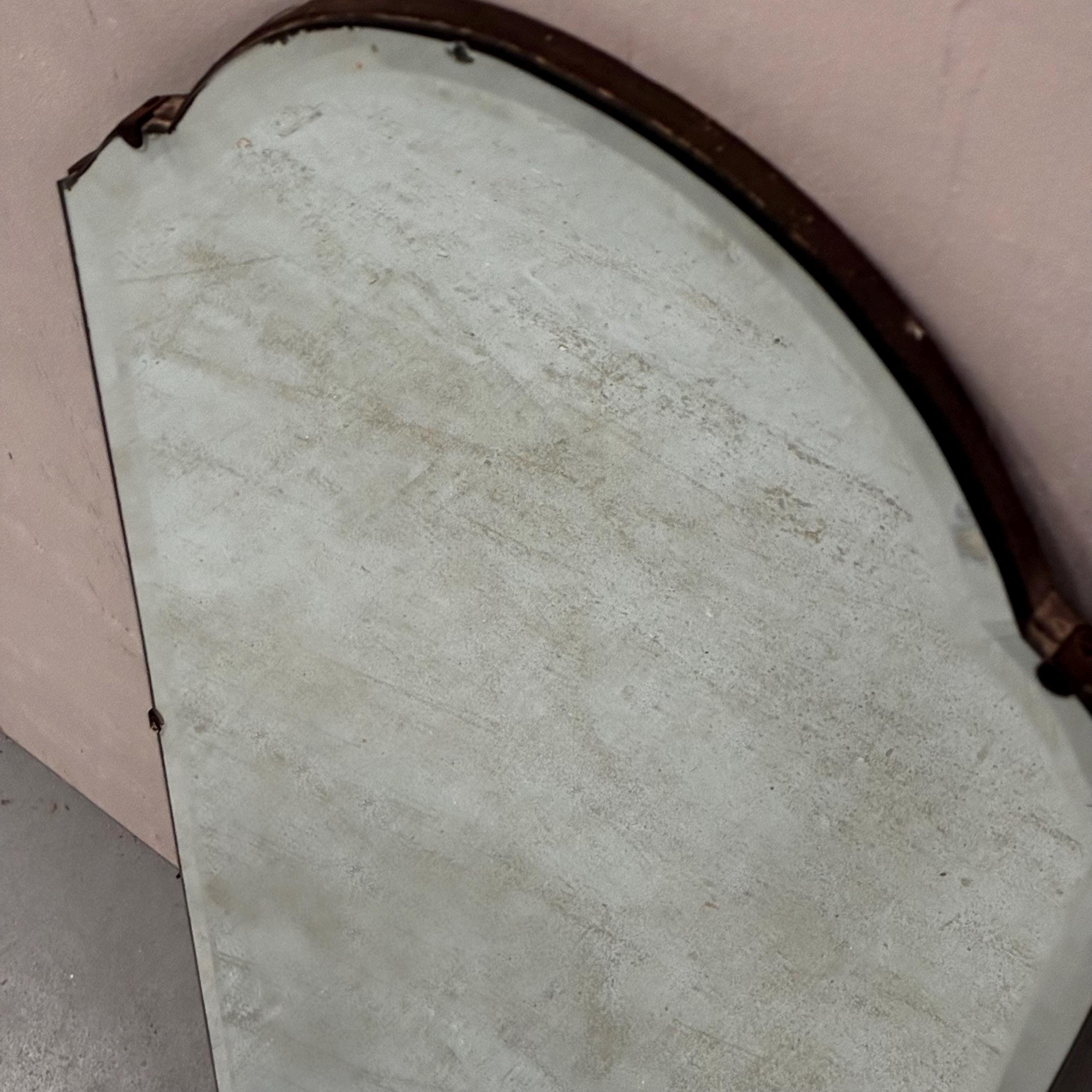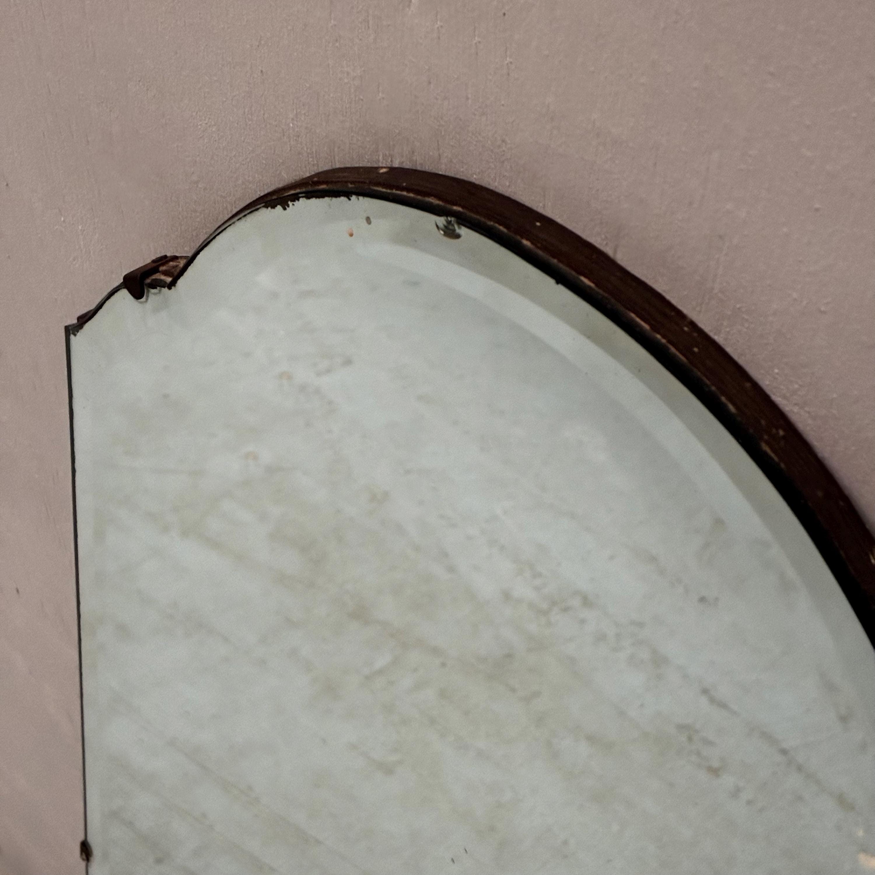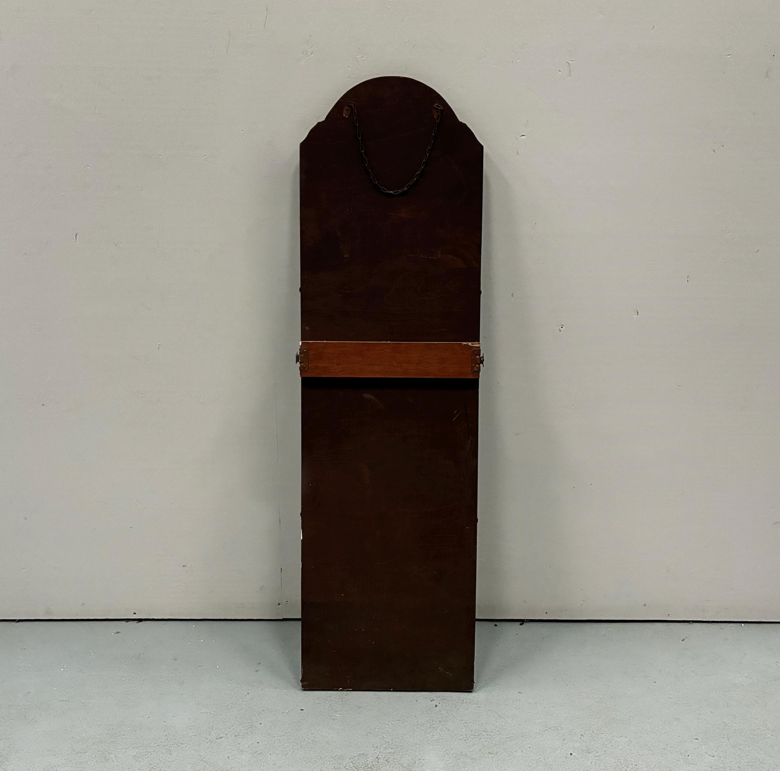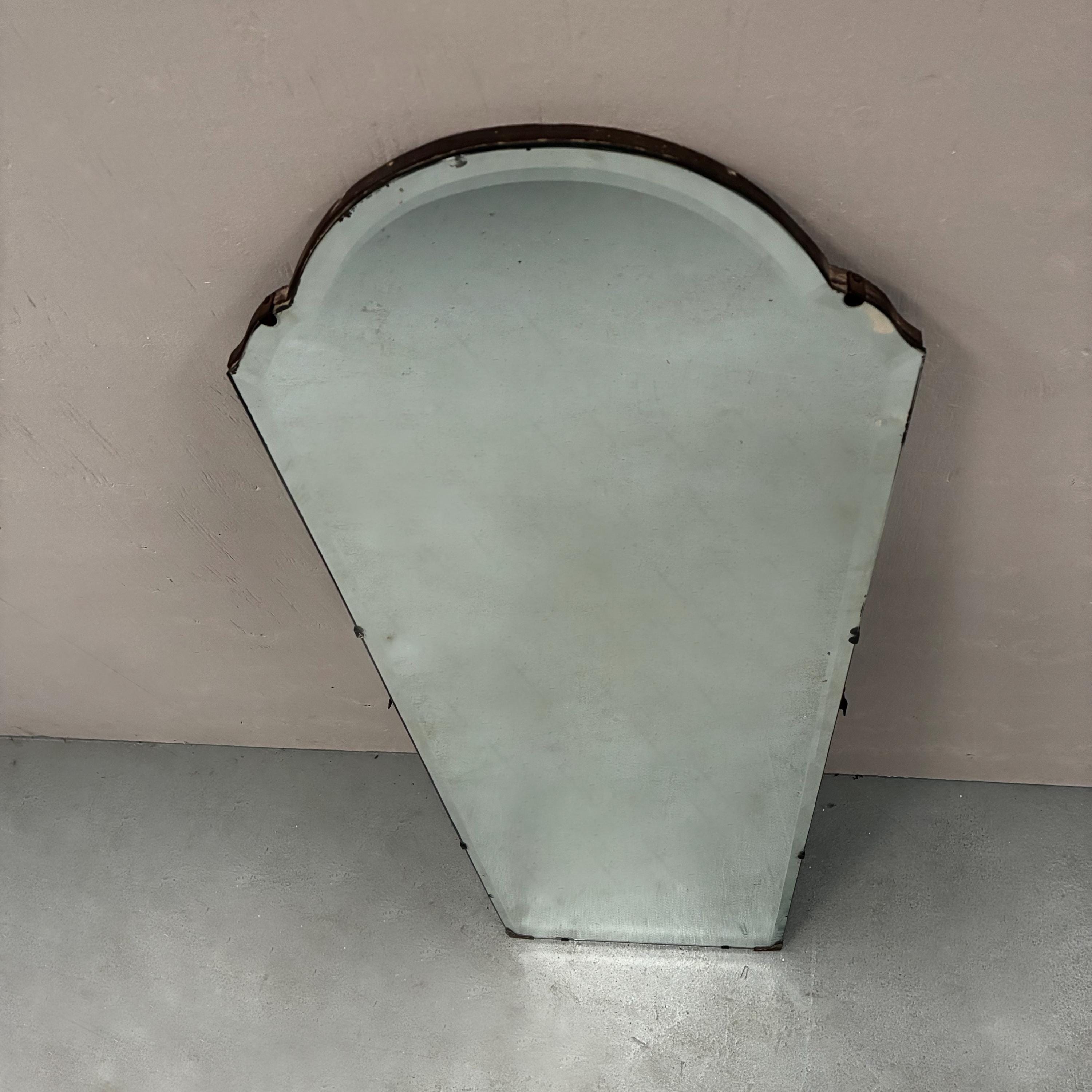 Art Deco style beveled full length wall mirrorcirca 1930s/1940s Tall and narrow with a arched shape at the top of the mirror. Mirror is attached to wooden back and is rather weighty . It has lovely foxing and patina on the mirror which is hard to photograph and describe . A vintage deco style mirror with very practical uses as well .Measures 122 cm tall x 35.5 cm wide x 1.5 cm deep. Uk delivery only ( delivery fee is an estimate please email with post code for exact postage cost )
