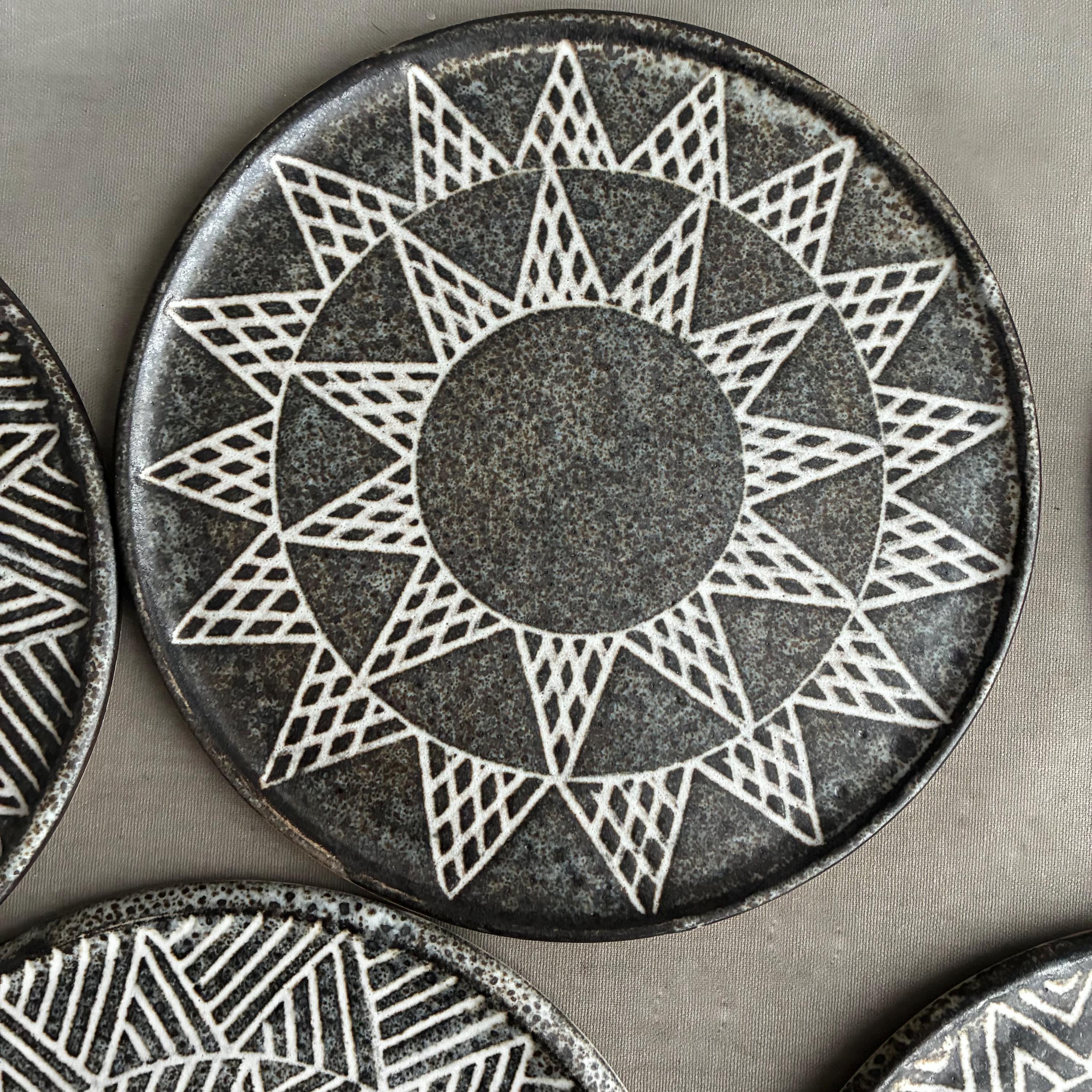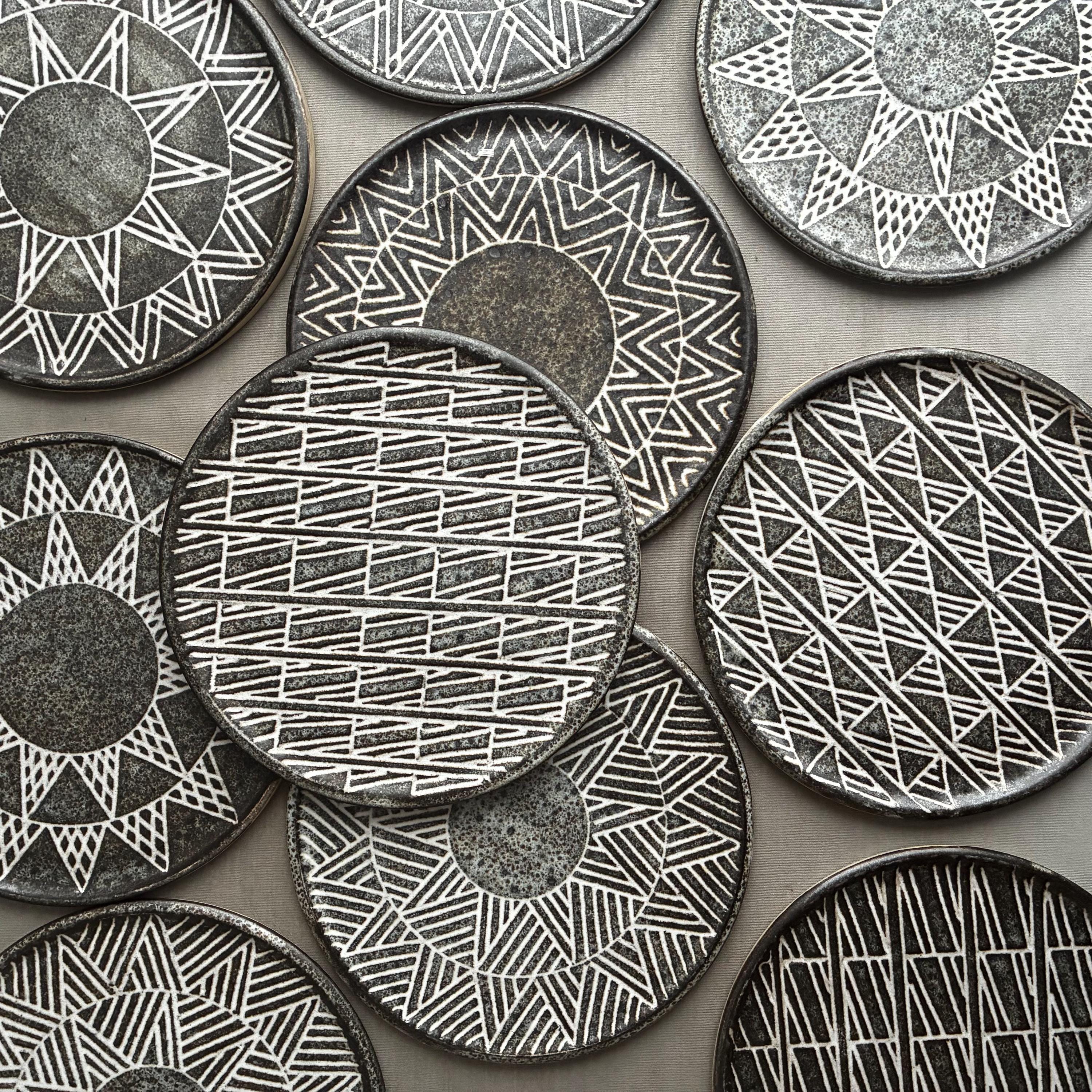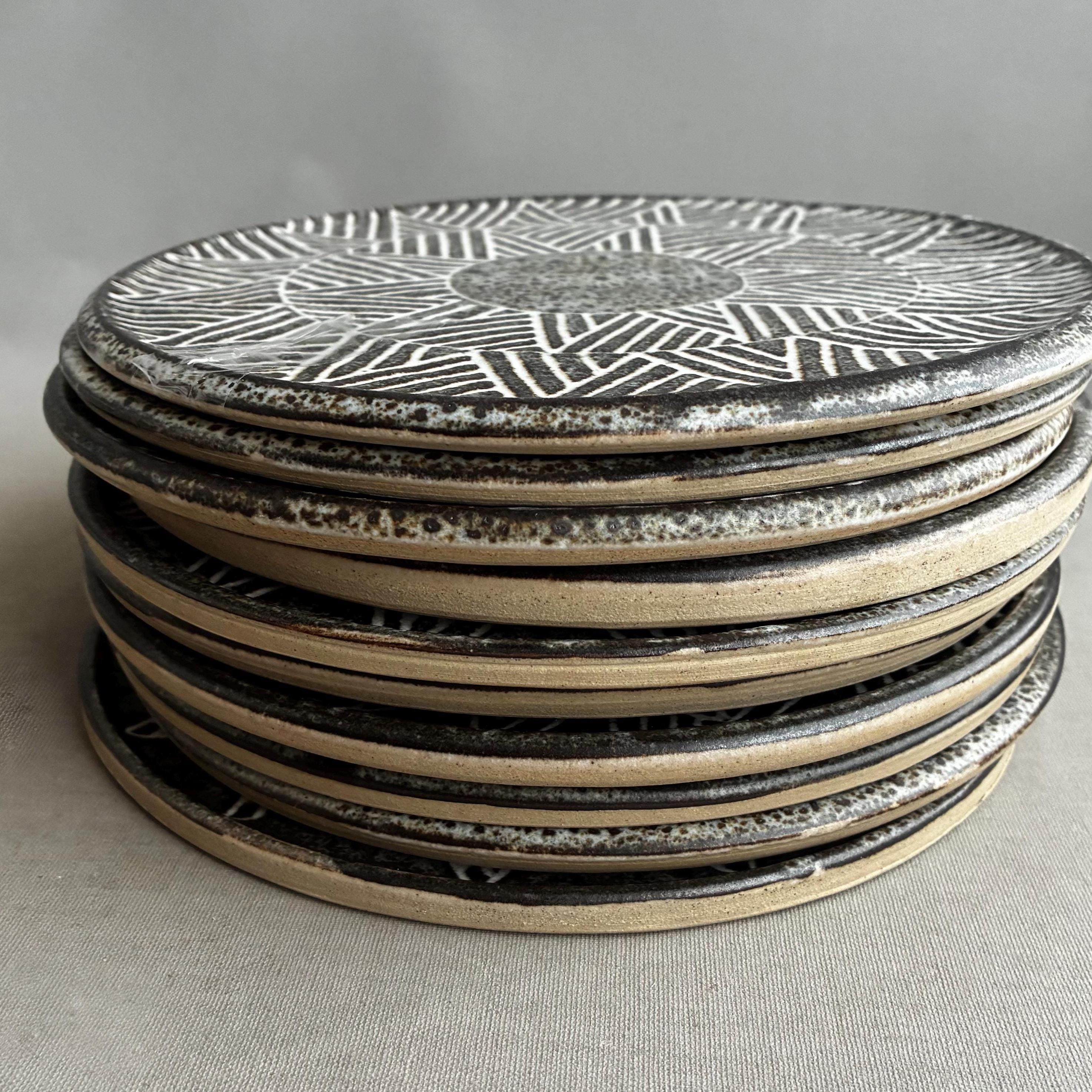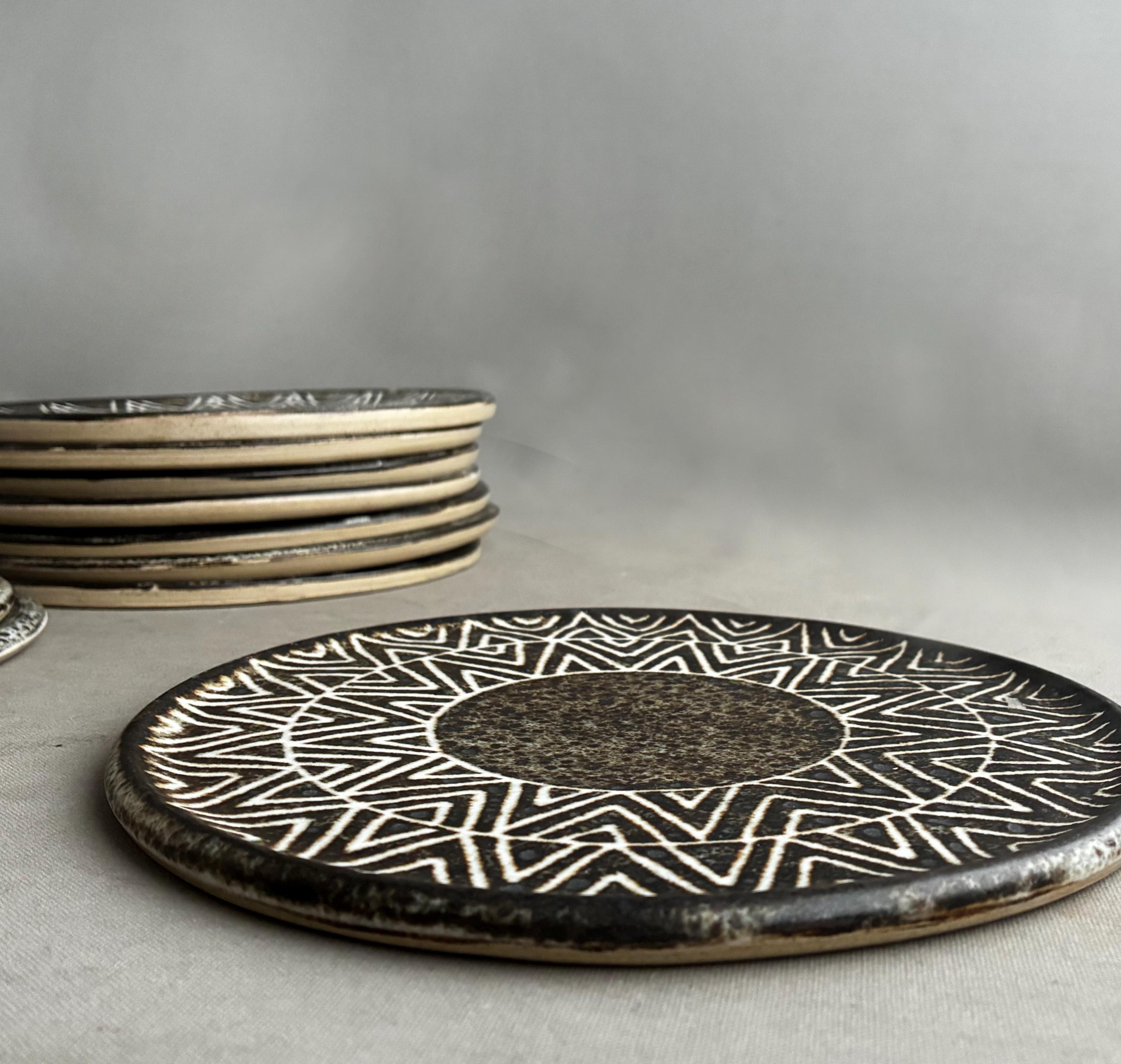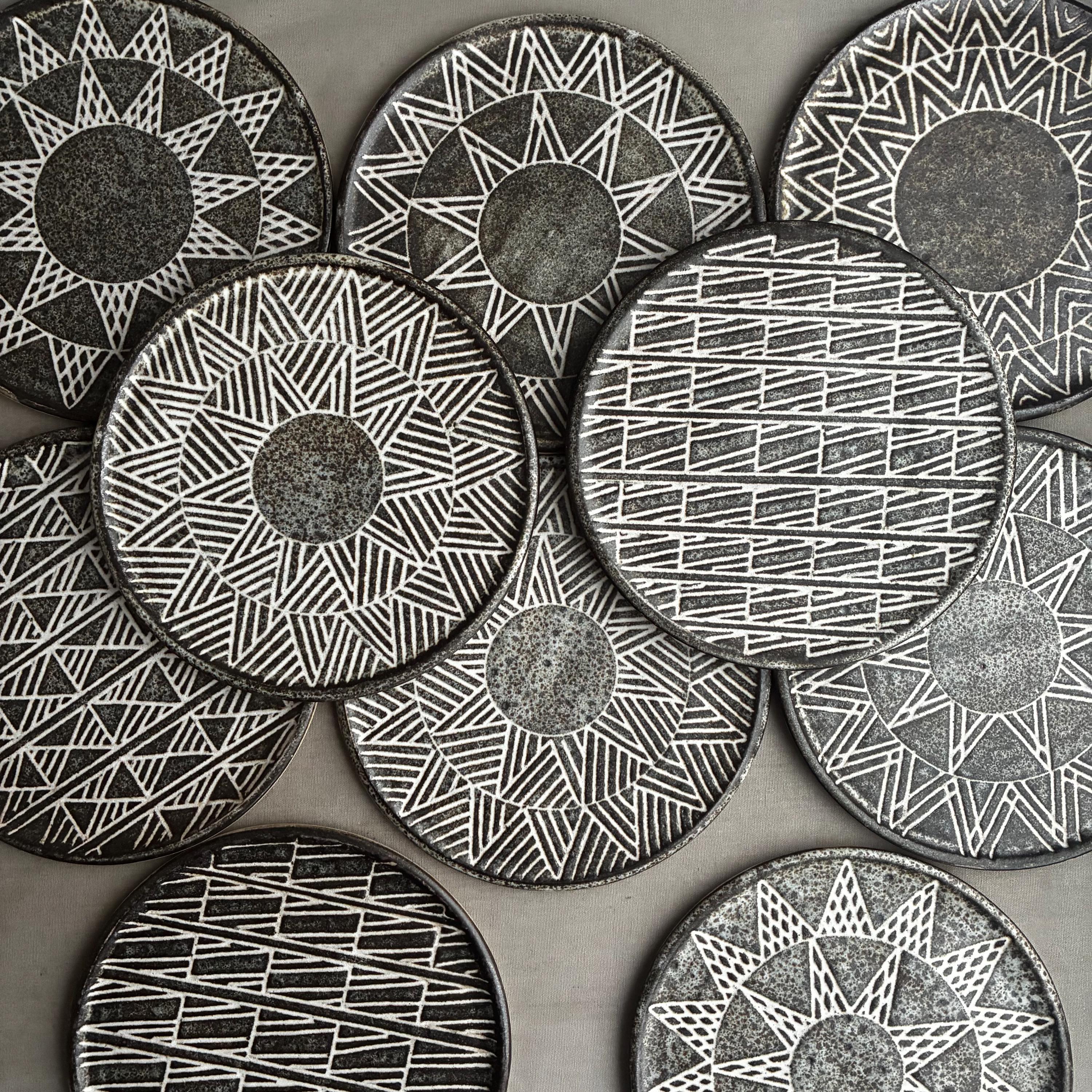 A beautiful set of Hand made studio pottery side plates . With a decorative sgraffito glaze technique finish. handmade so each plate truly unique . Set of 10 in various designs sold as a set . Will also be listing dinner plates soon. Heavy parcel so hefty postage fee. viewings and collection welcome at our north London workshop