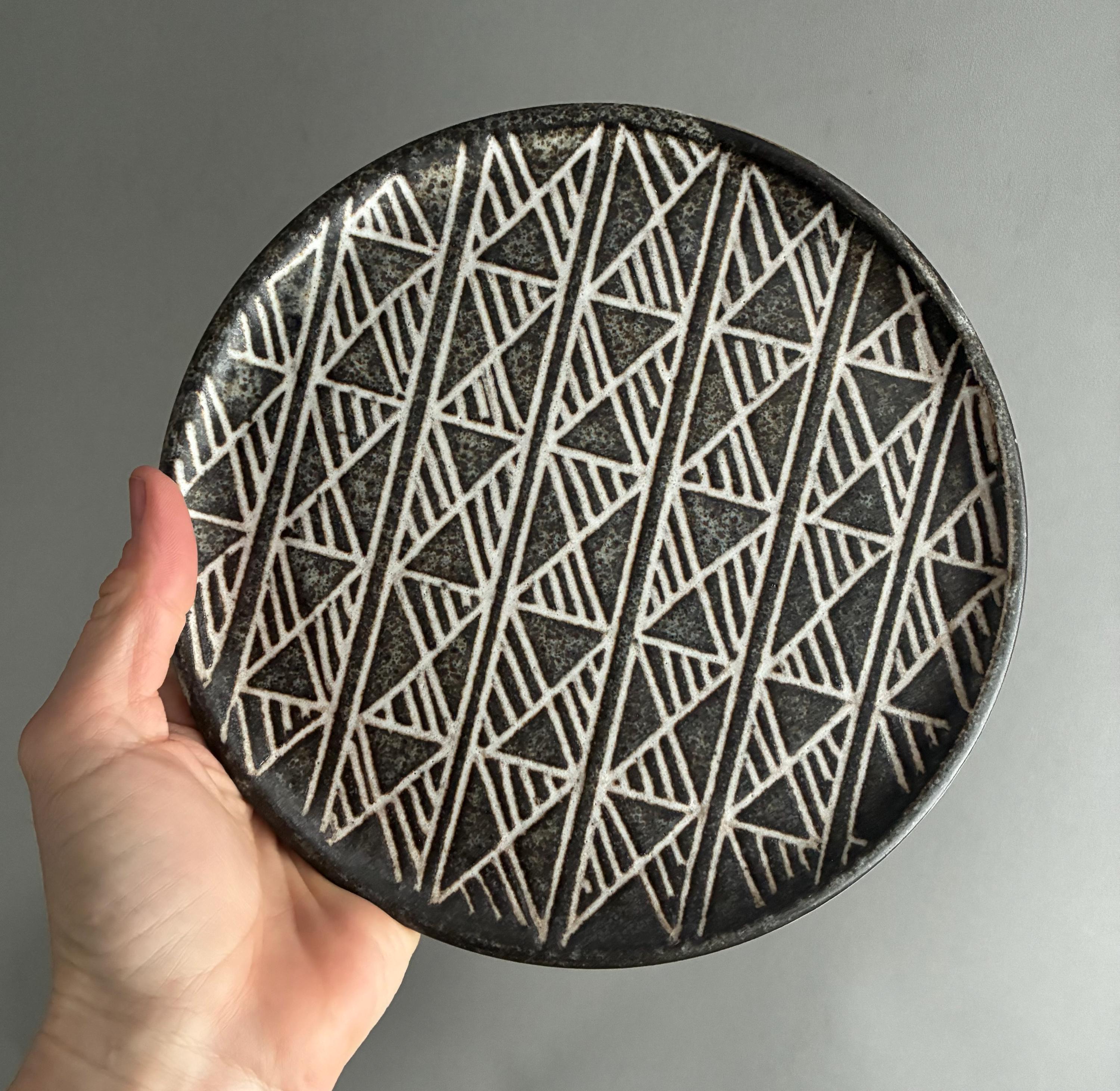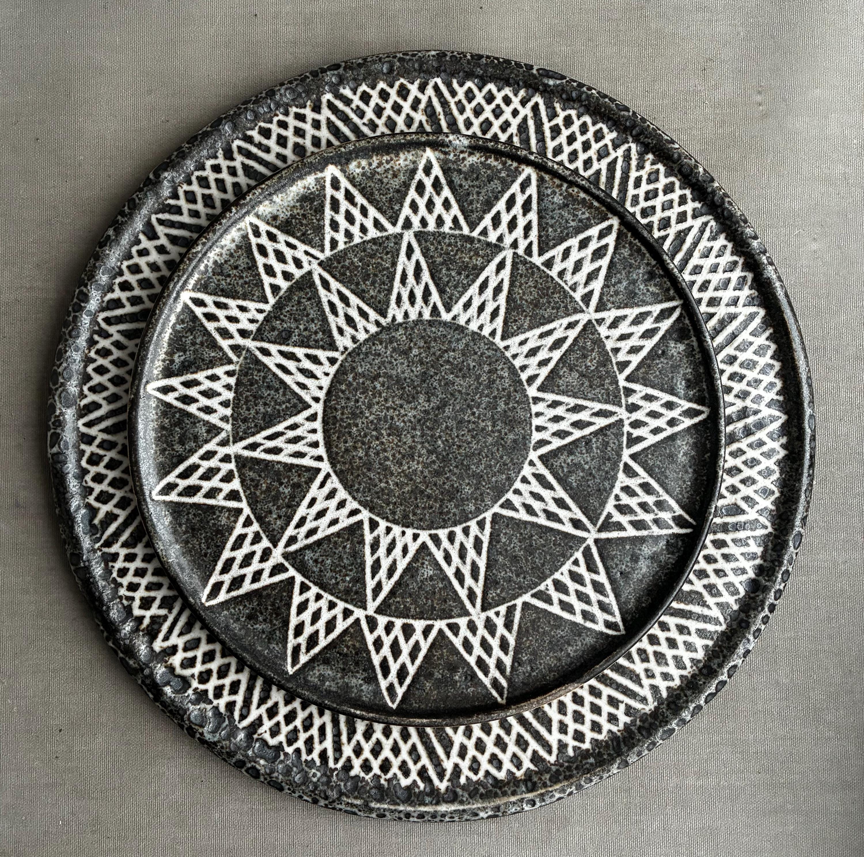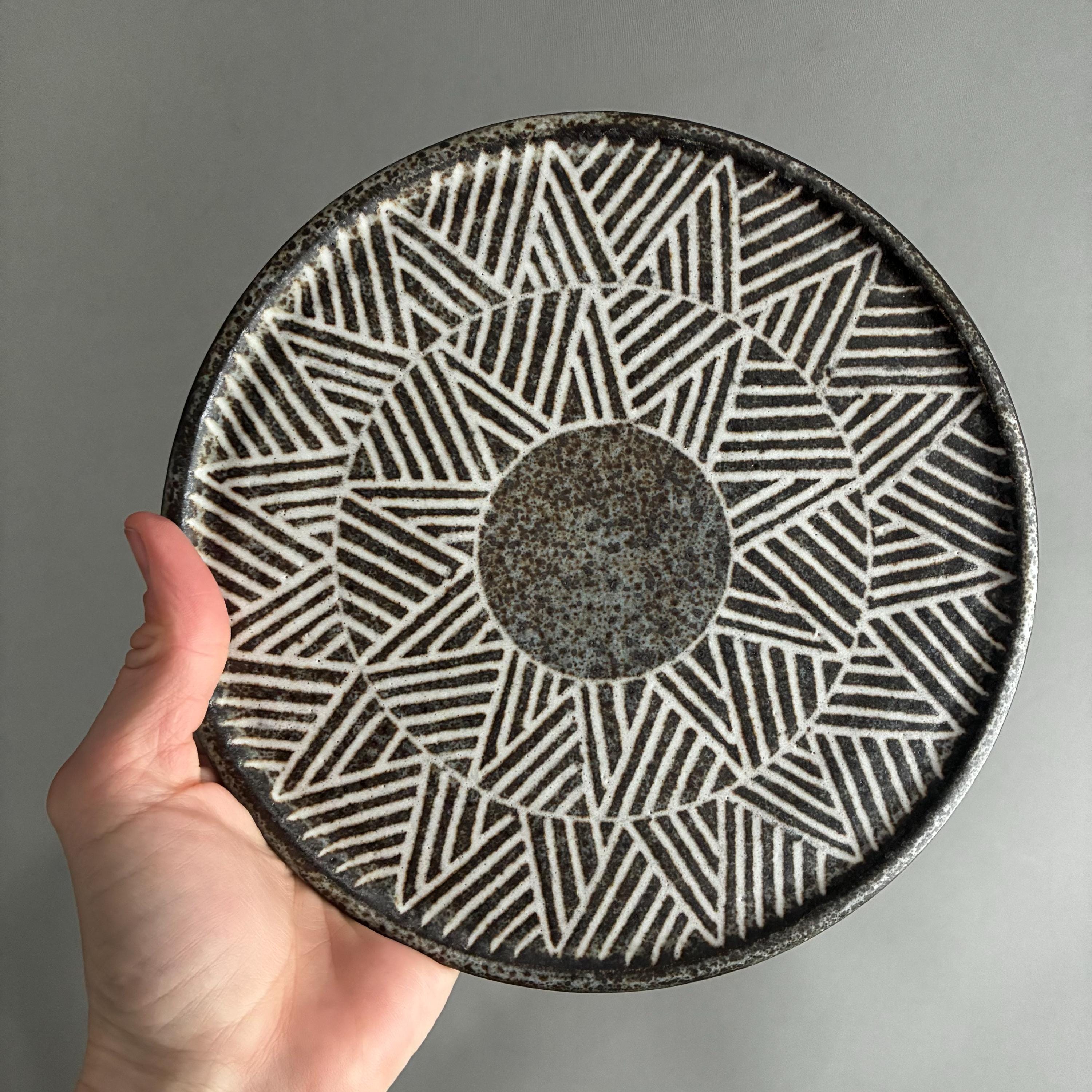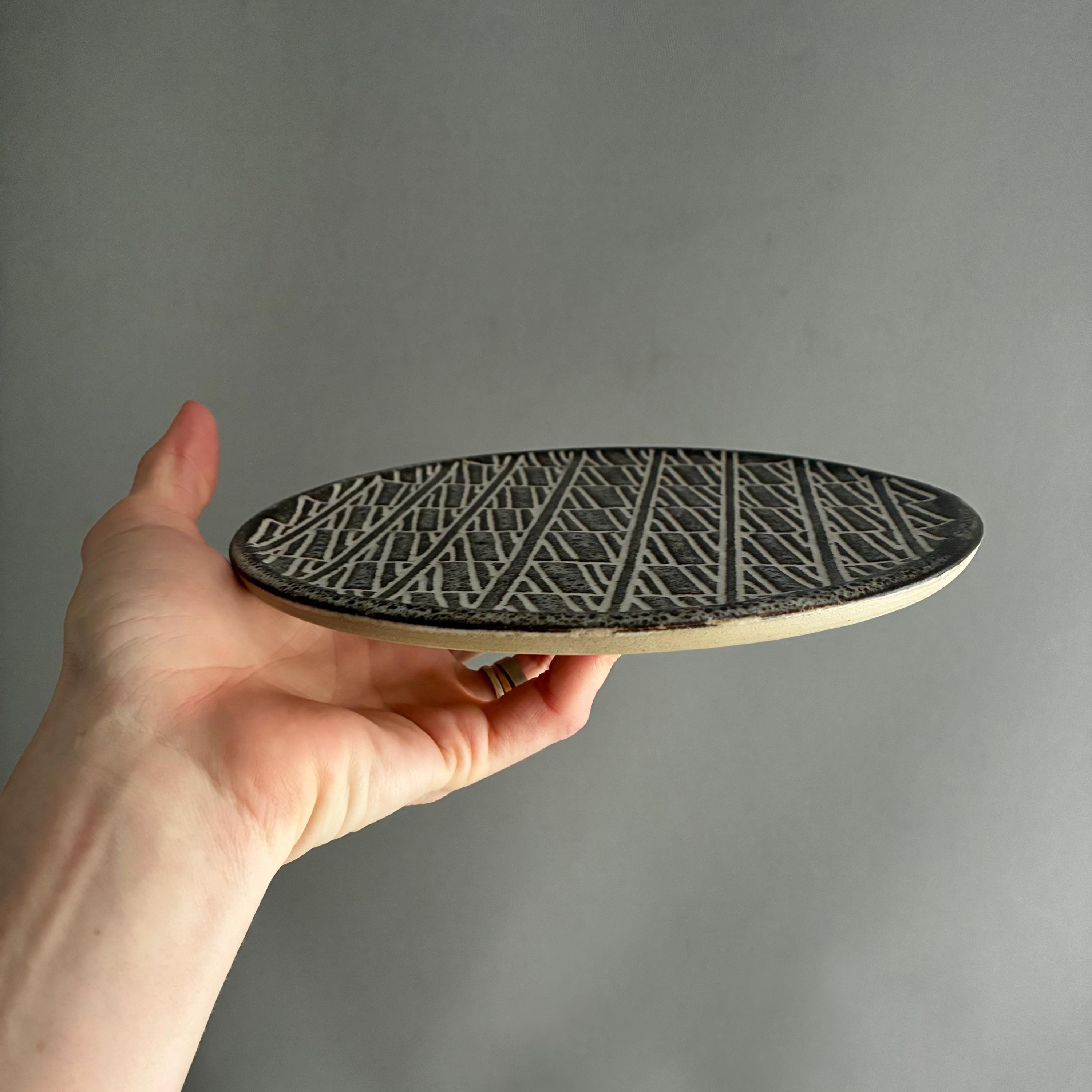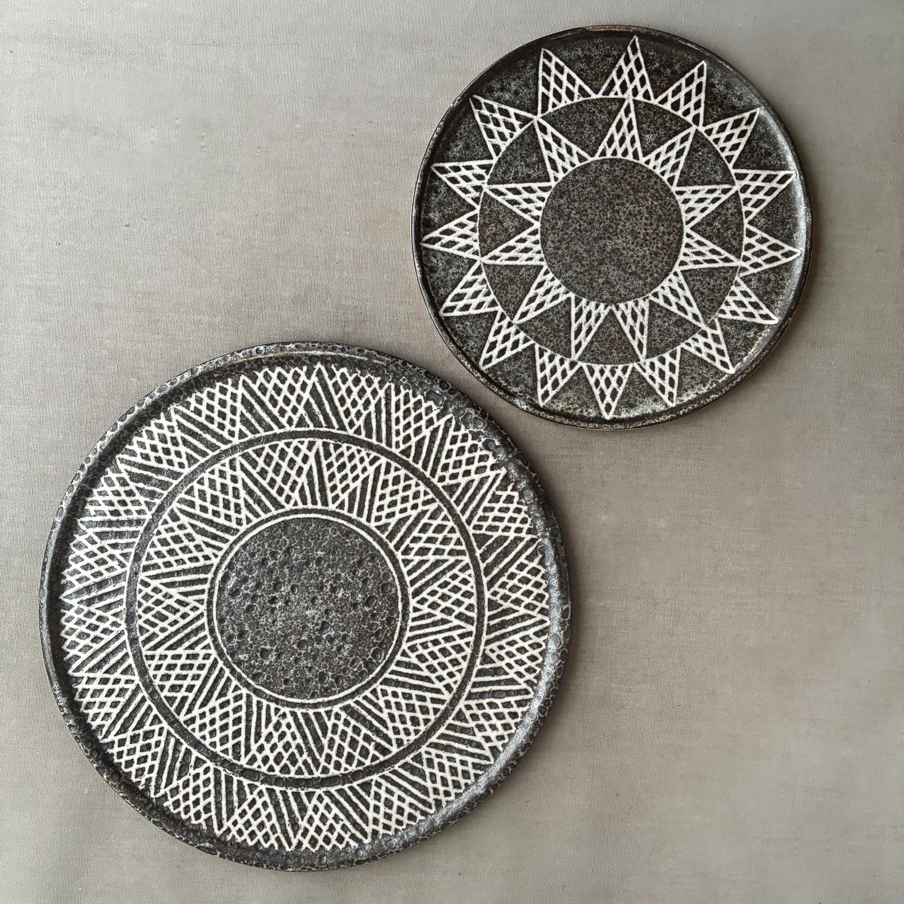 A beautiful set of Hand made studio pottery side plates . With a decorative sgraffito glaze technique finish. handmade so each plate truly unique . Set of 10 in various designs sold as a set . Will also be listing dinner plates soon. Heavy parcel so hefty postage fee. viewings and collection welcome at our north London workshop