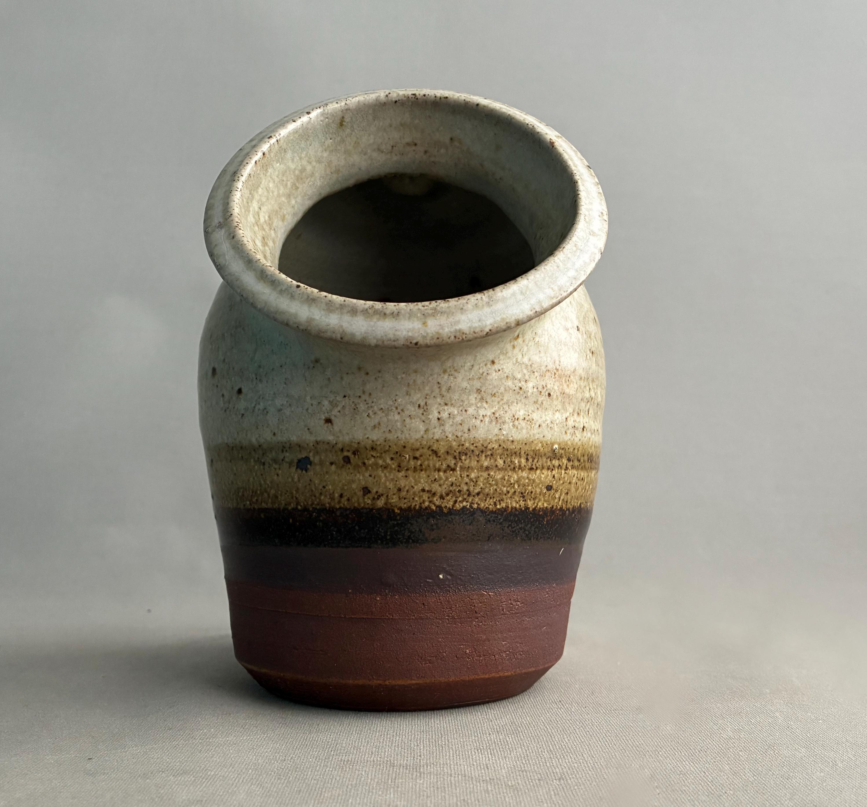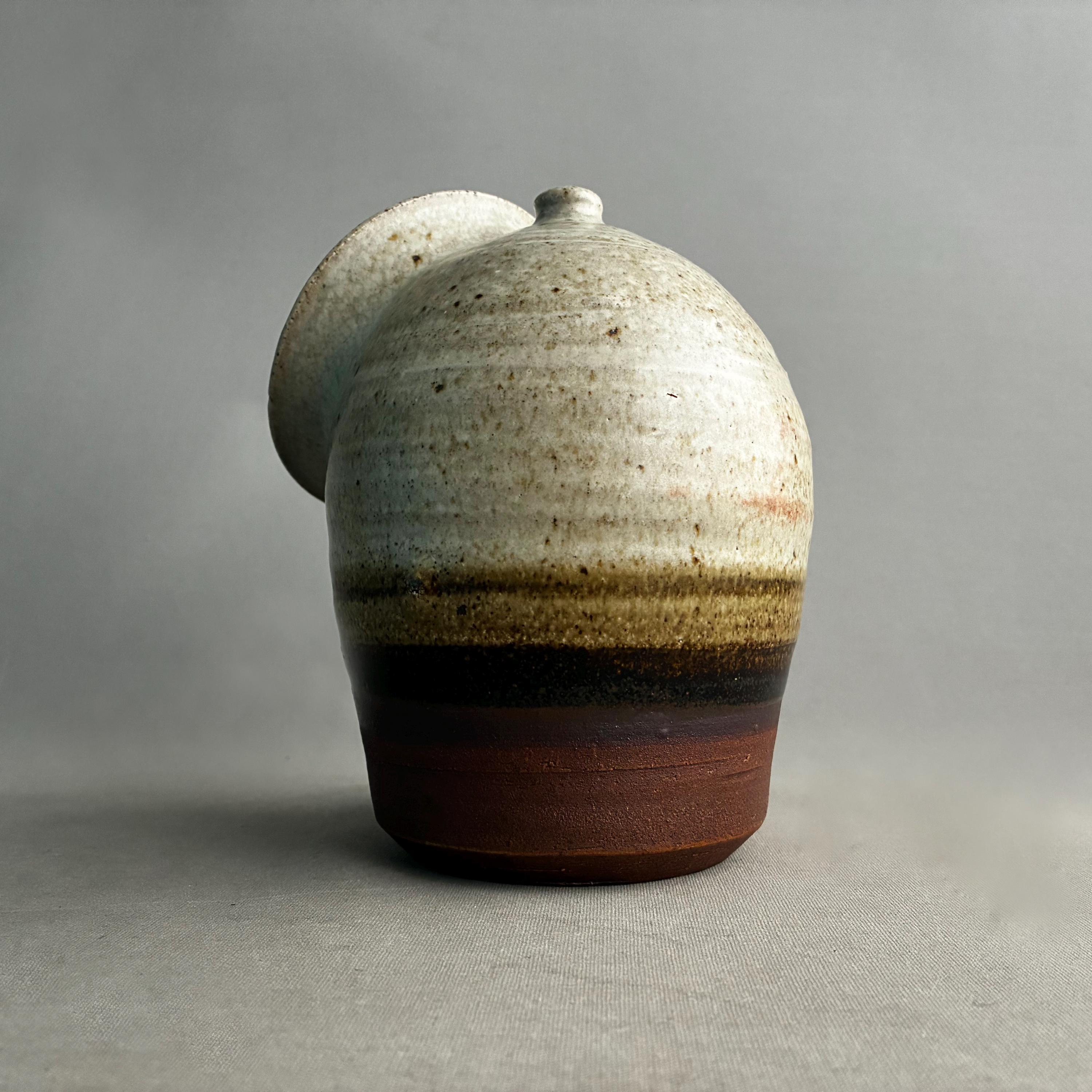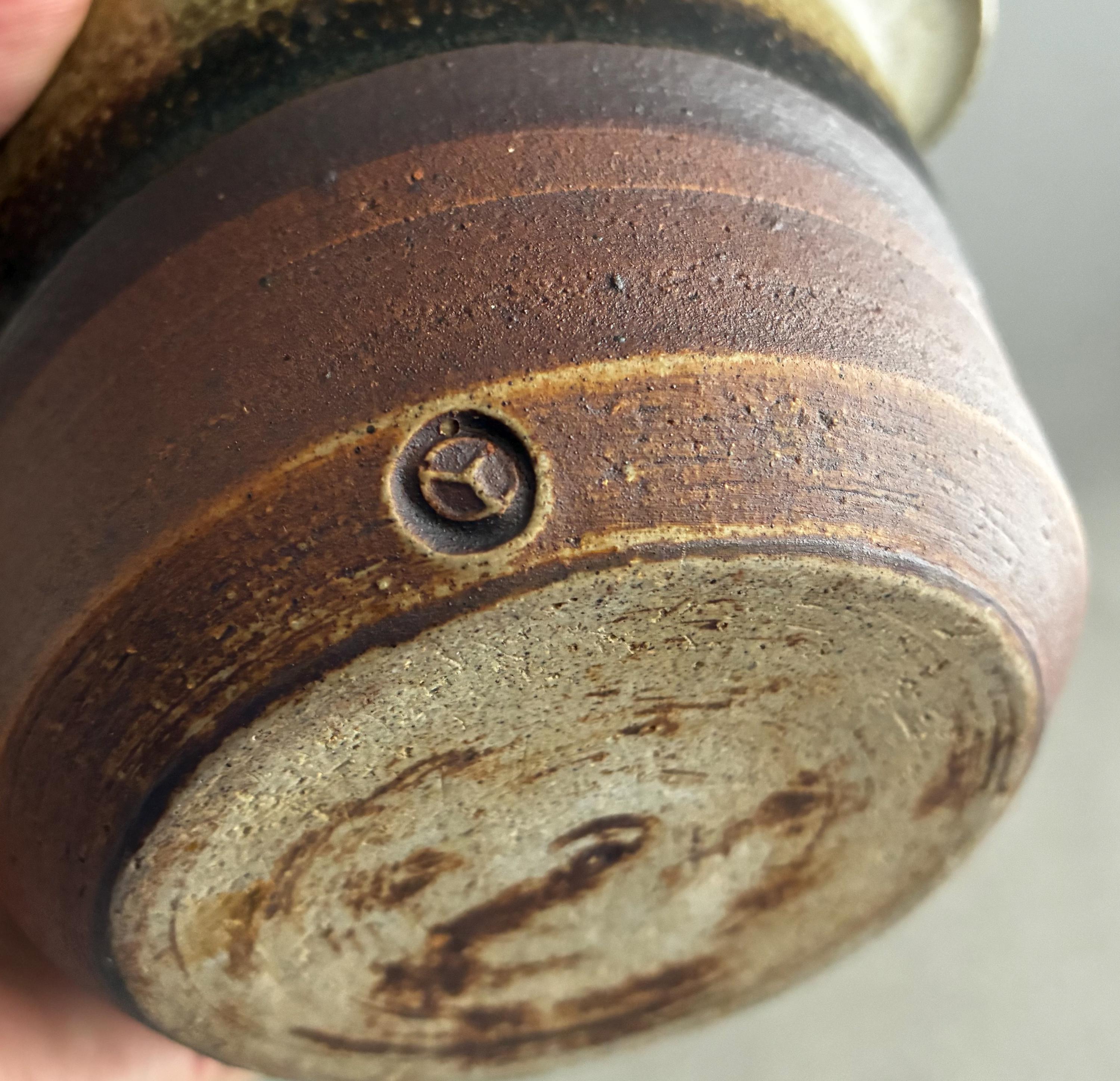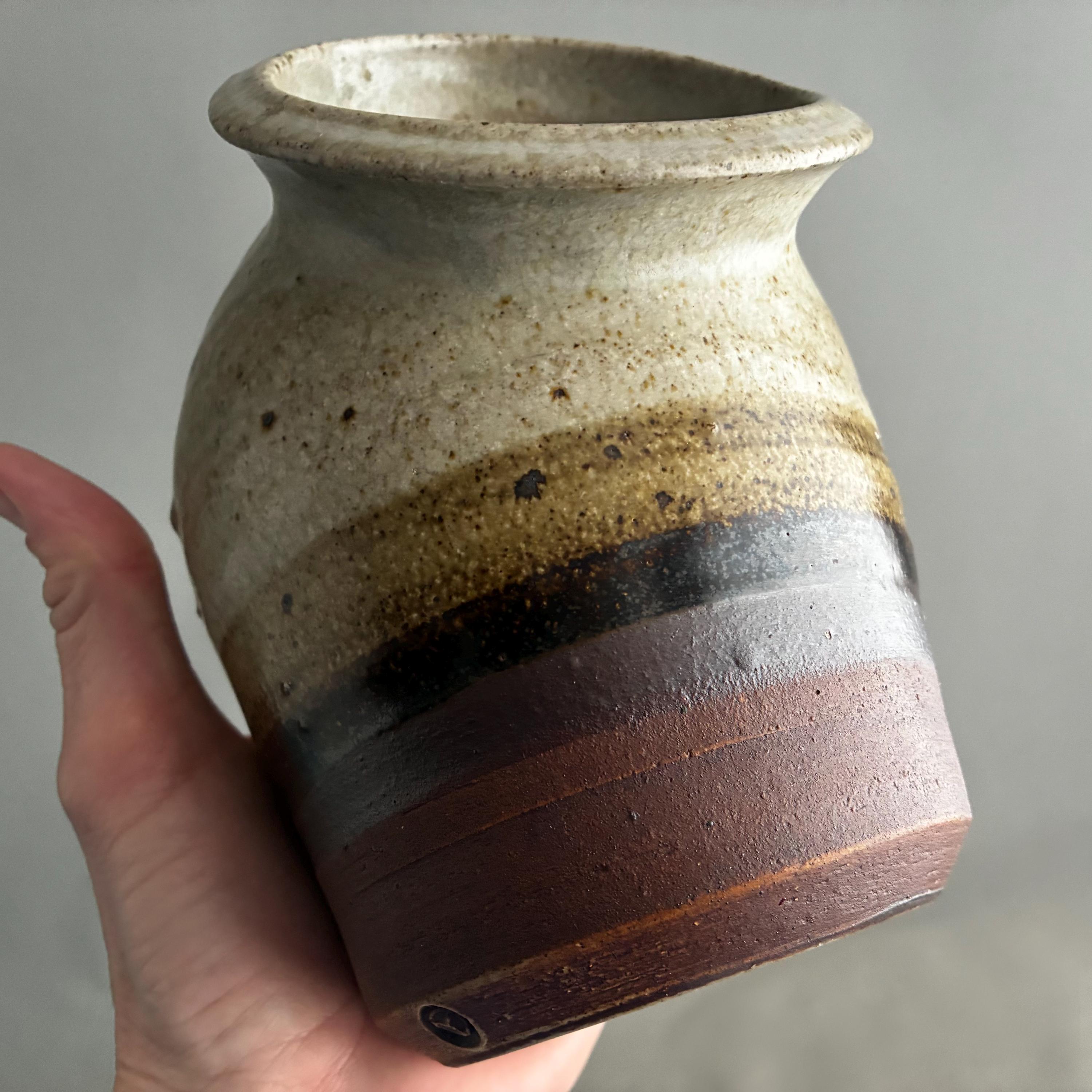A nice sized studio pottery salt pig. hand made. Distinctive two-tone drip glaze, with a cream-colored top transitioning through brown to a raw clay base. with good weight