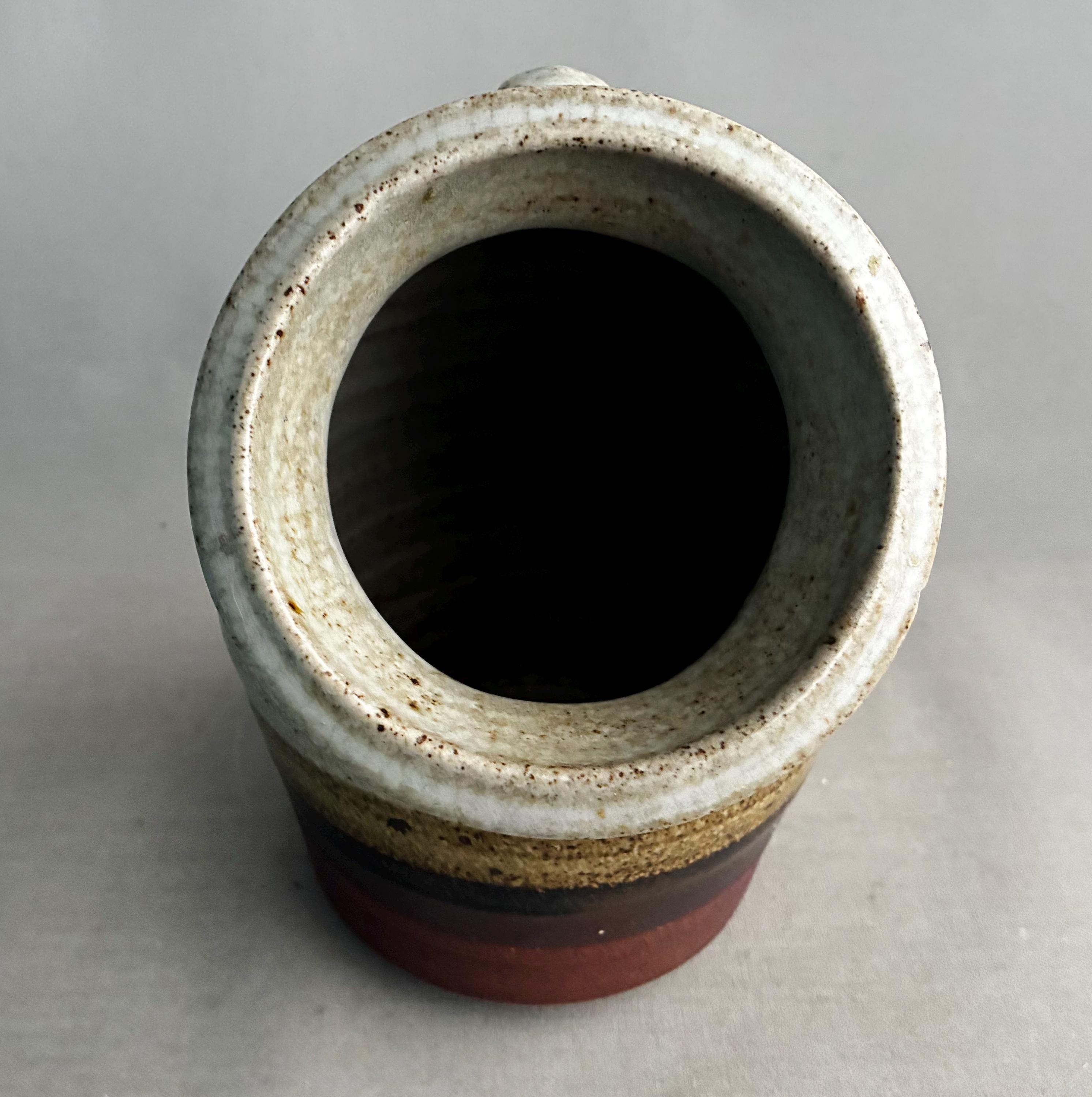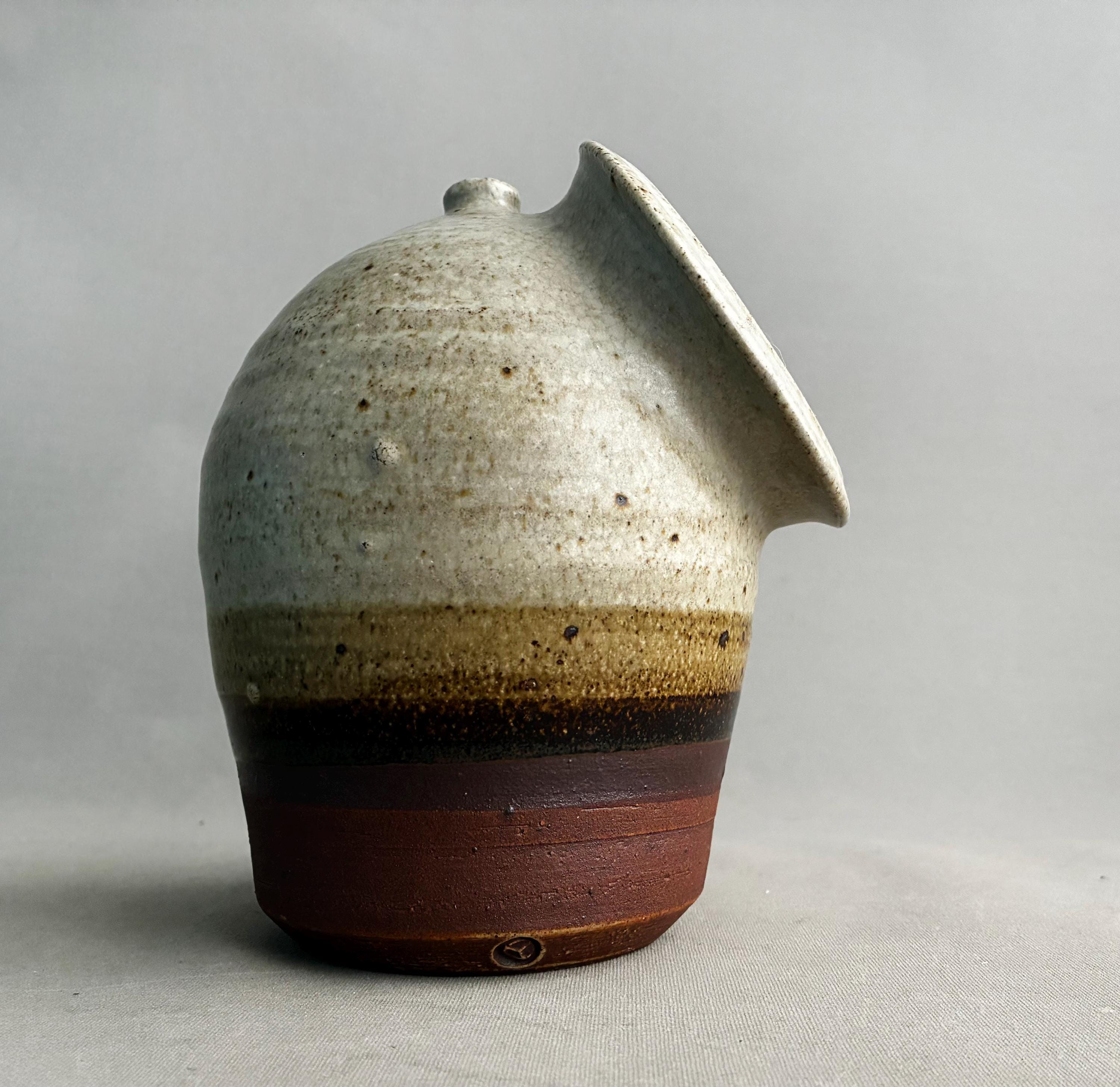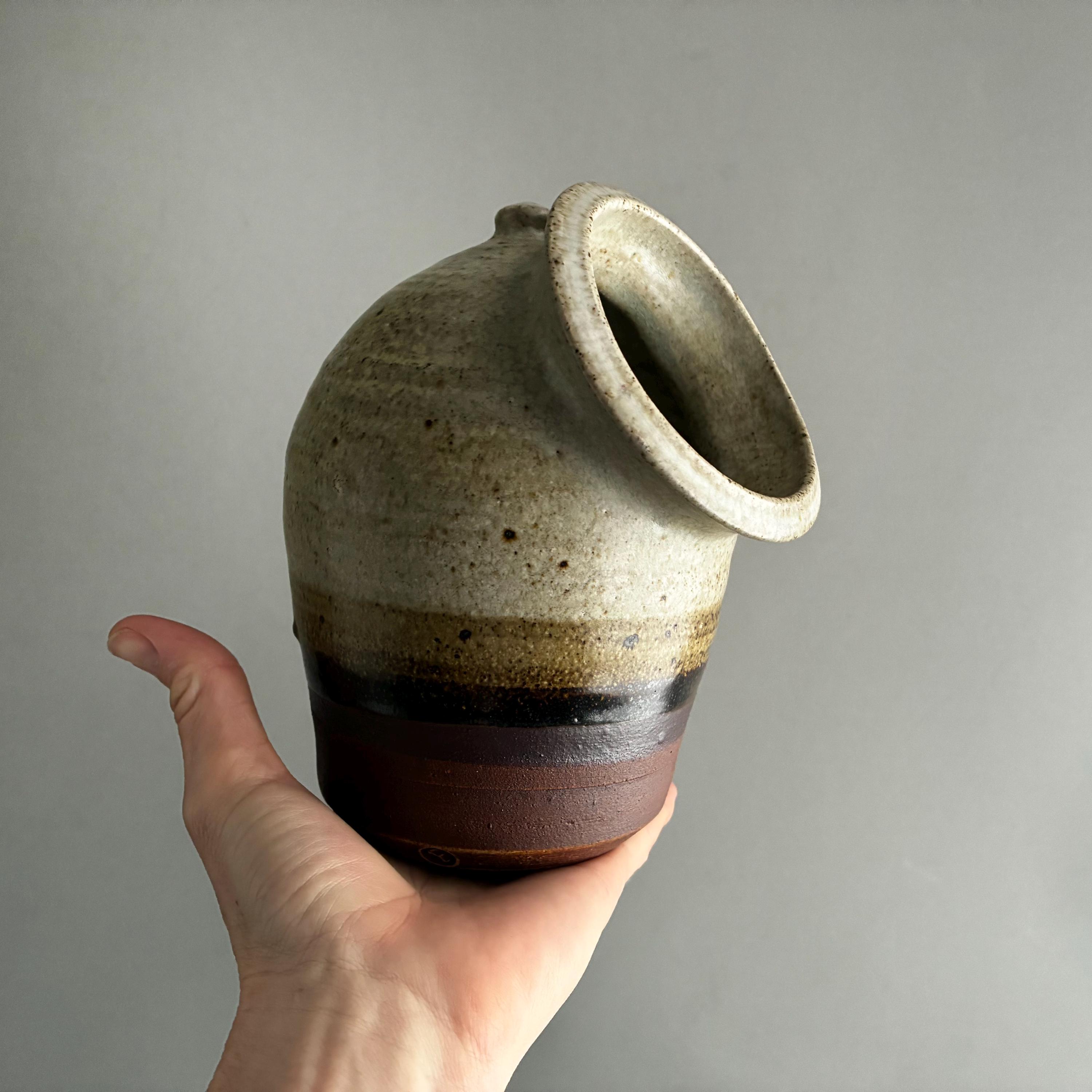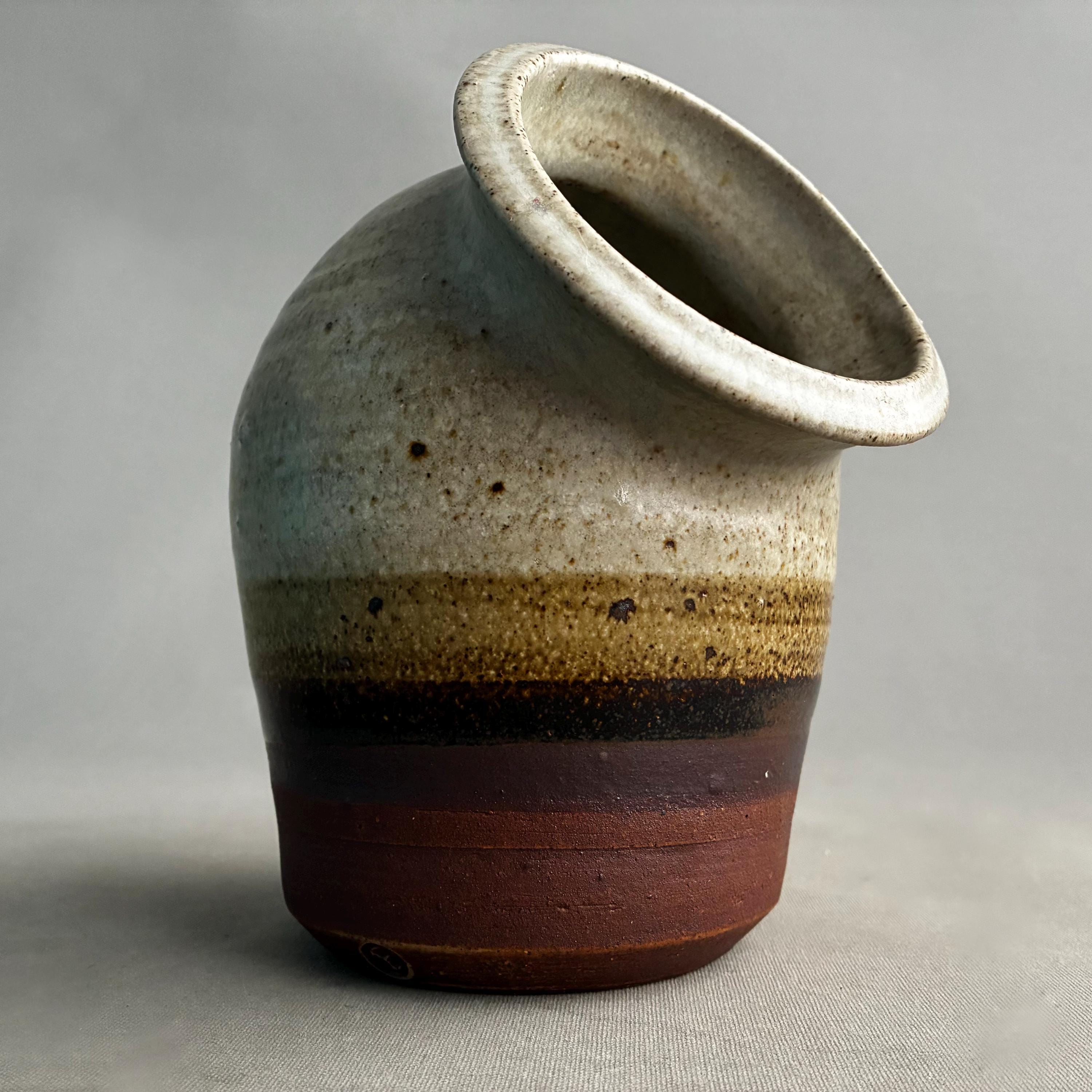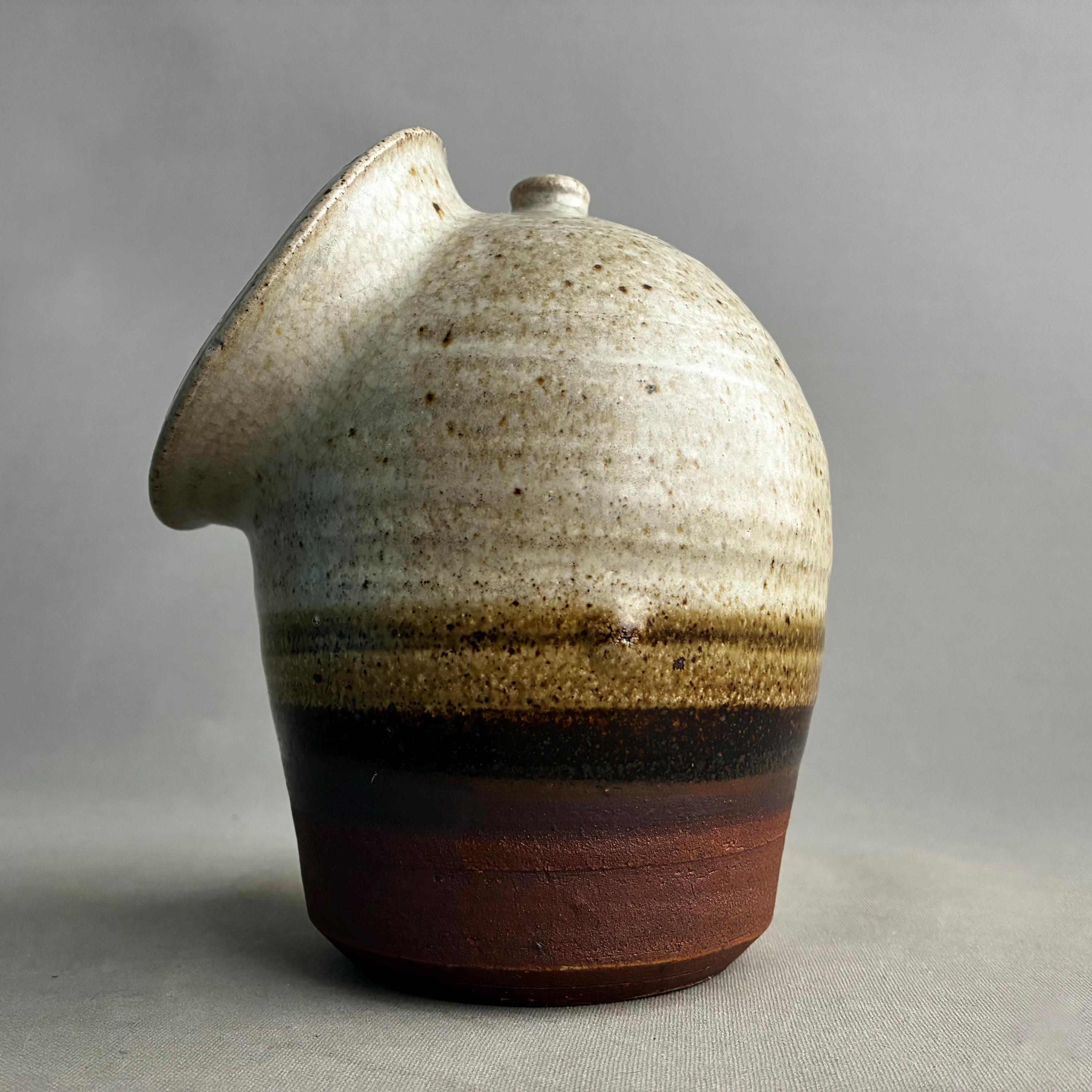 A nice sized studio pottery salt pig. hand made. Distinctive two-tone drip glaze, with a cream-colored top transitioning through brown to a raw clay base. with good weight