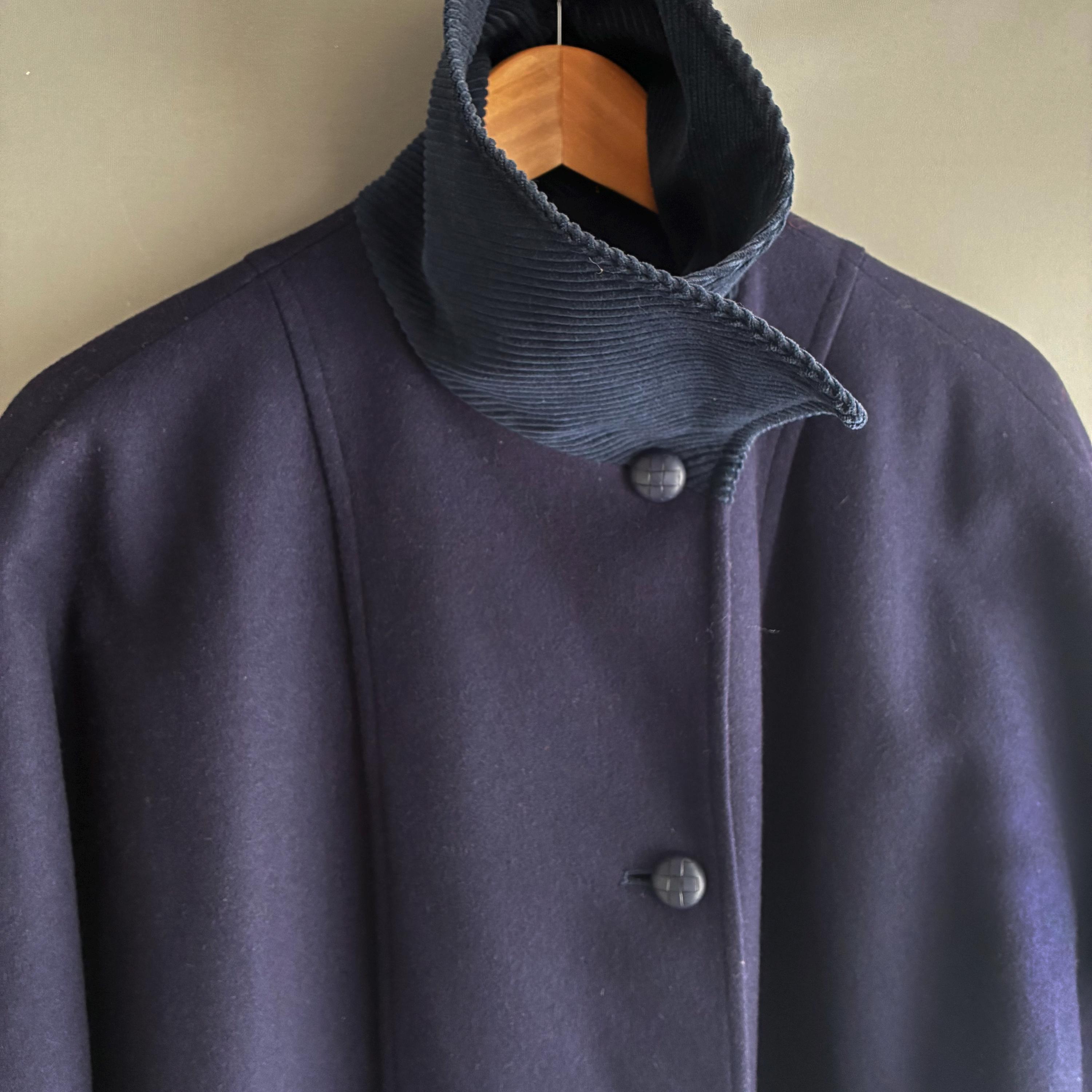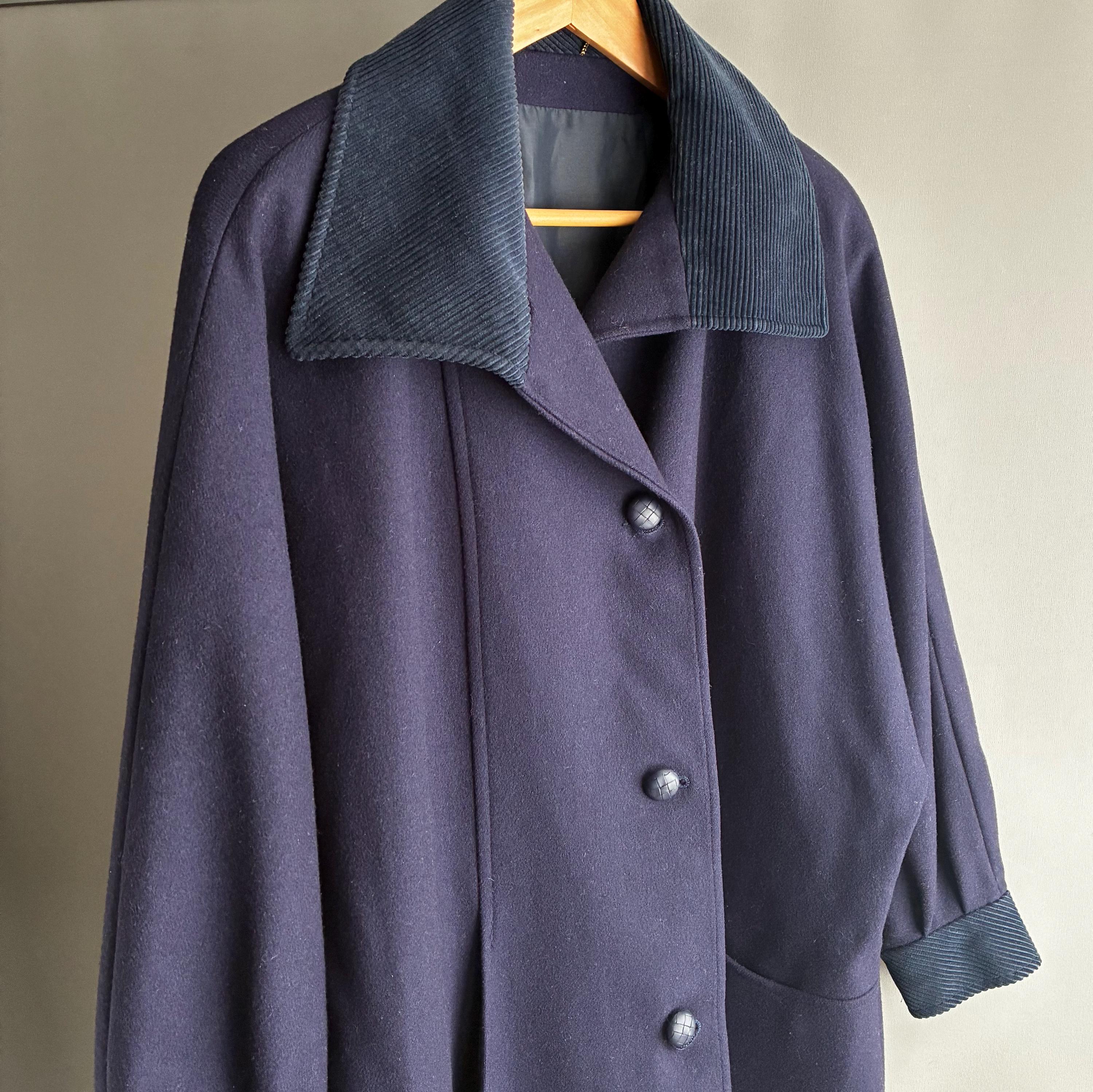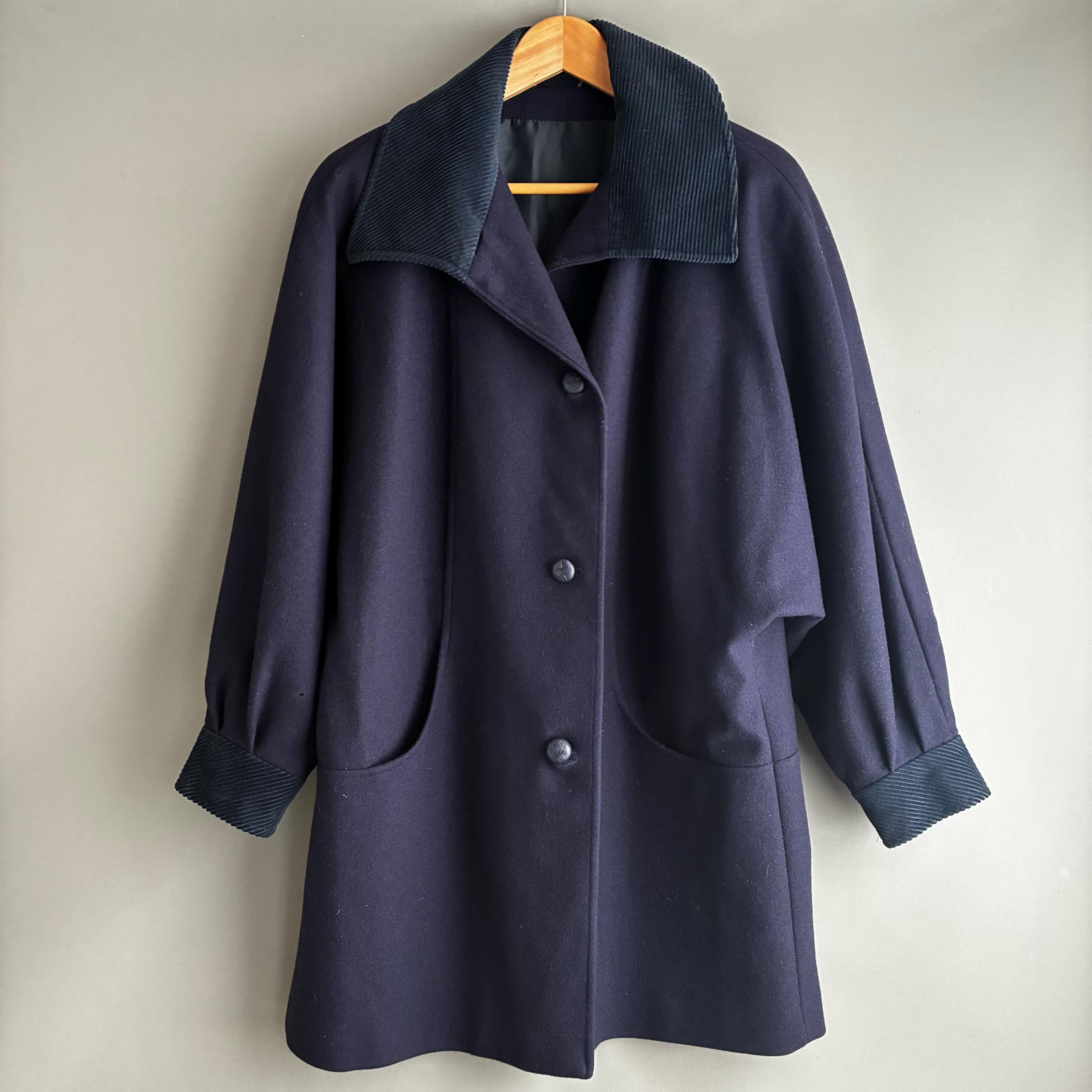 This is a fantastic Pure wool 1980s coat with corduroy collar and cuffs. Featuring gentle A- line shape with bat wing cuffed sleeves