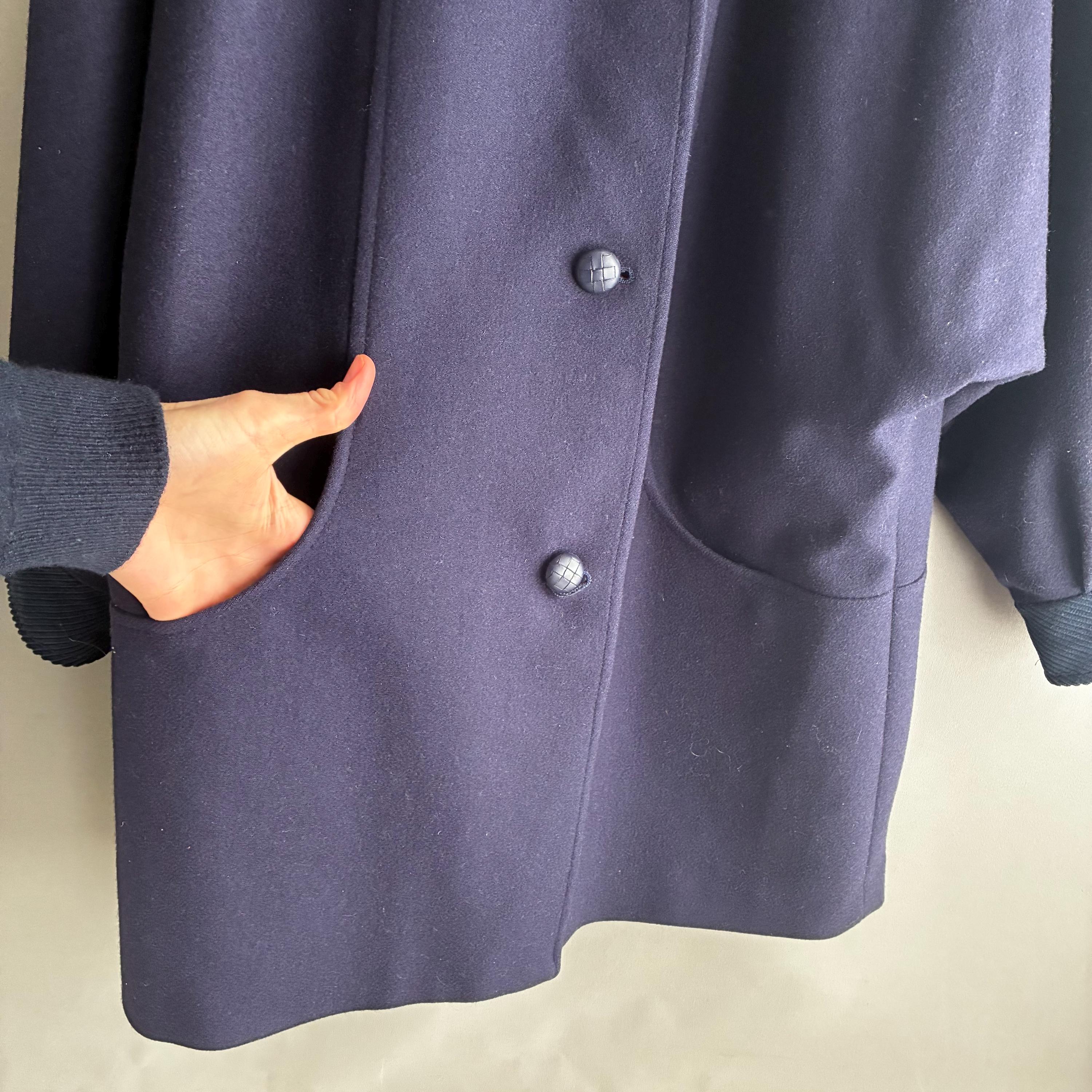 button upto collar .2 front pockets. Fully lined . A modern uk size 10-12. Such a lovely cut in a very practical and classic navey blue