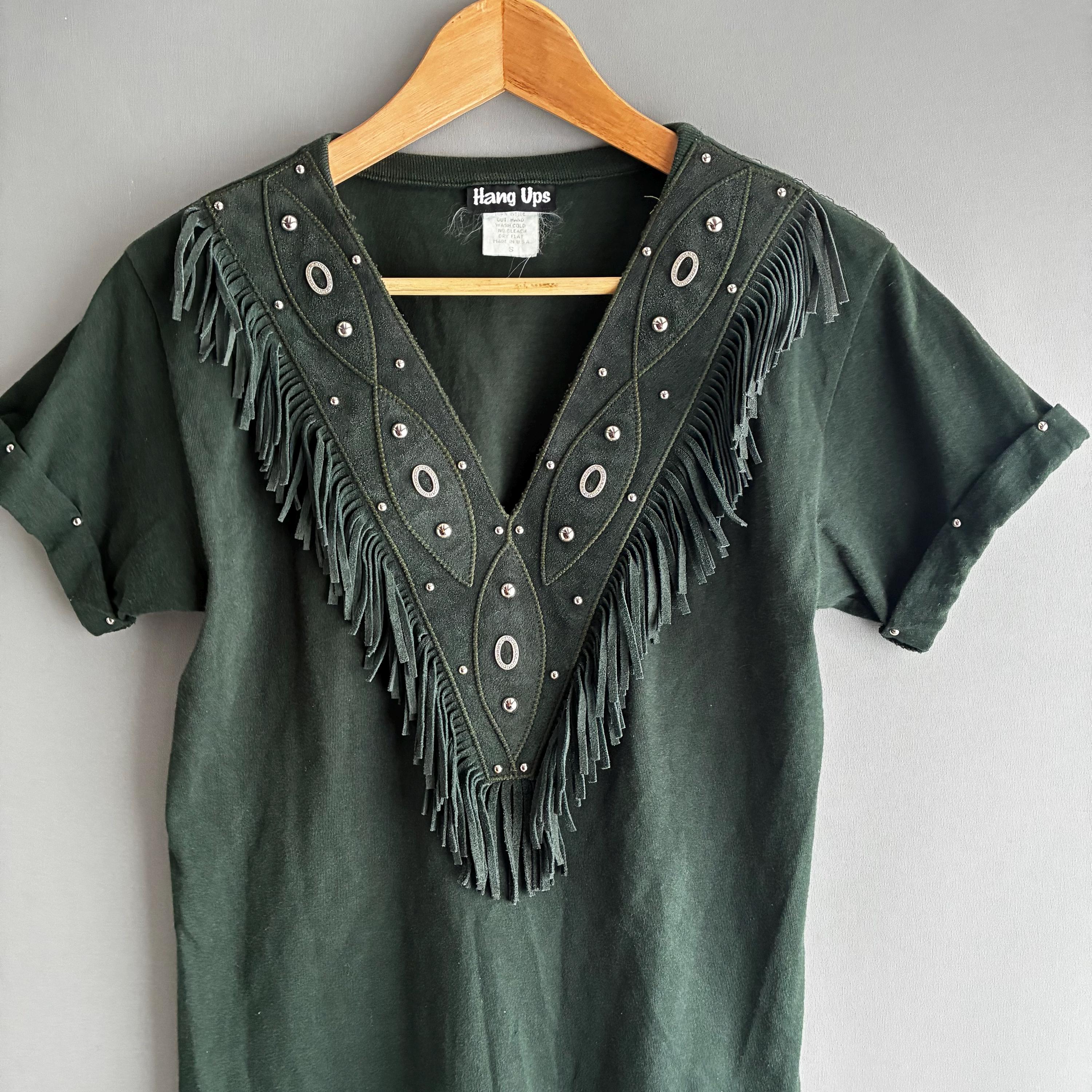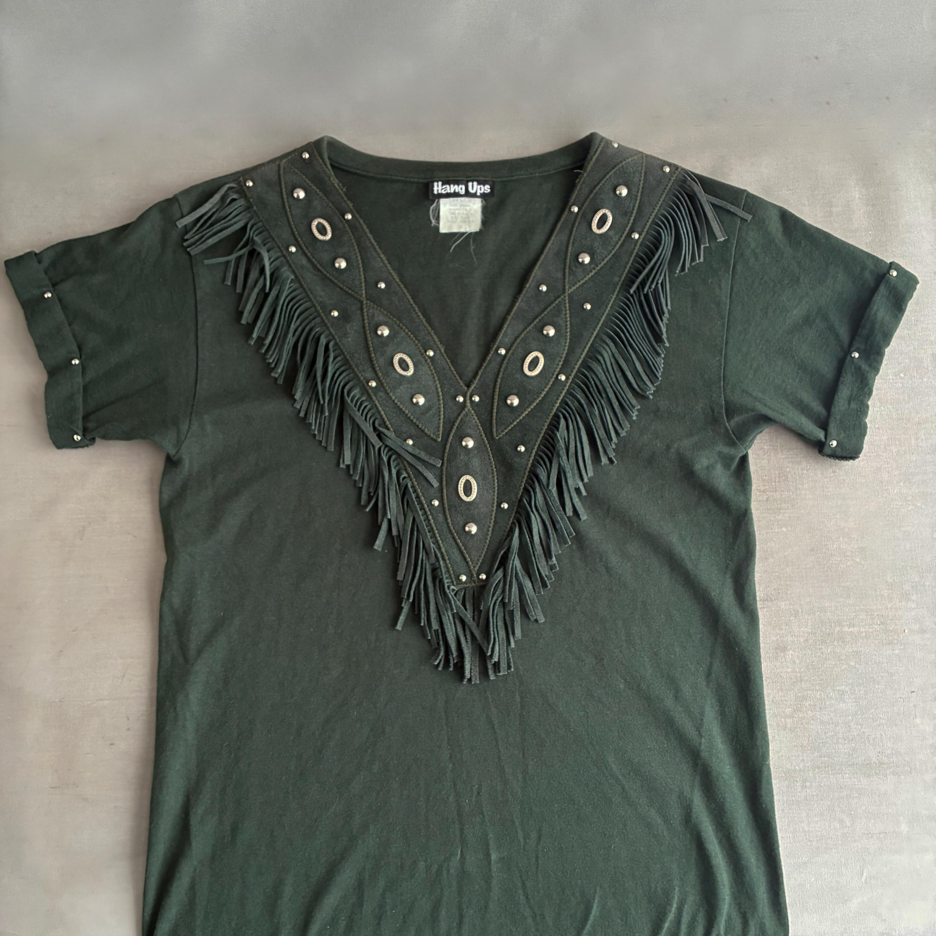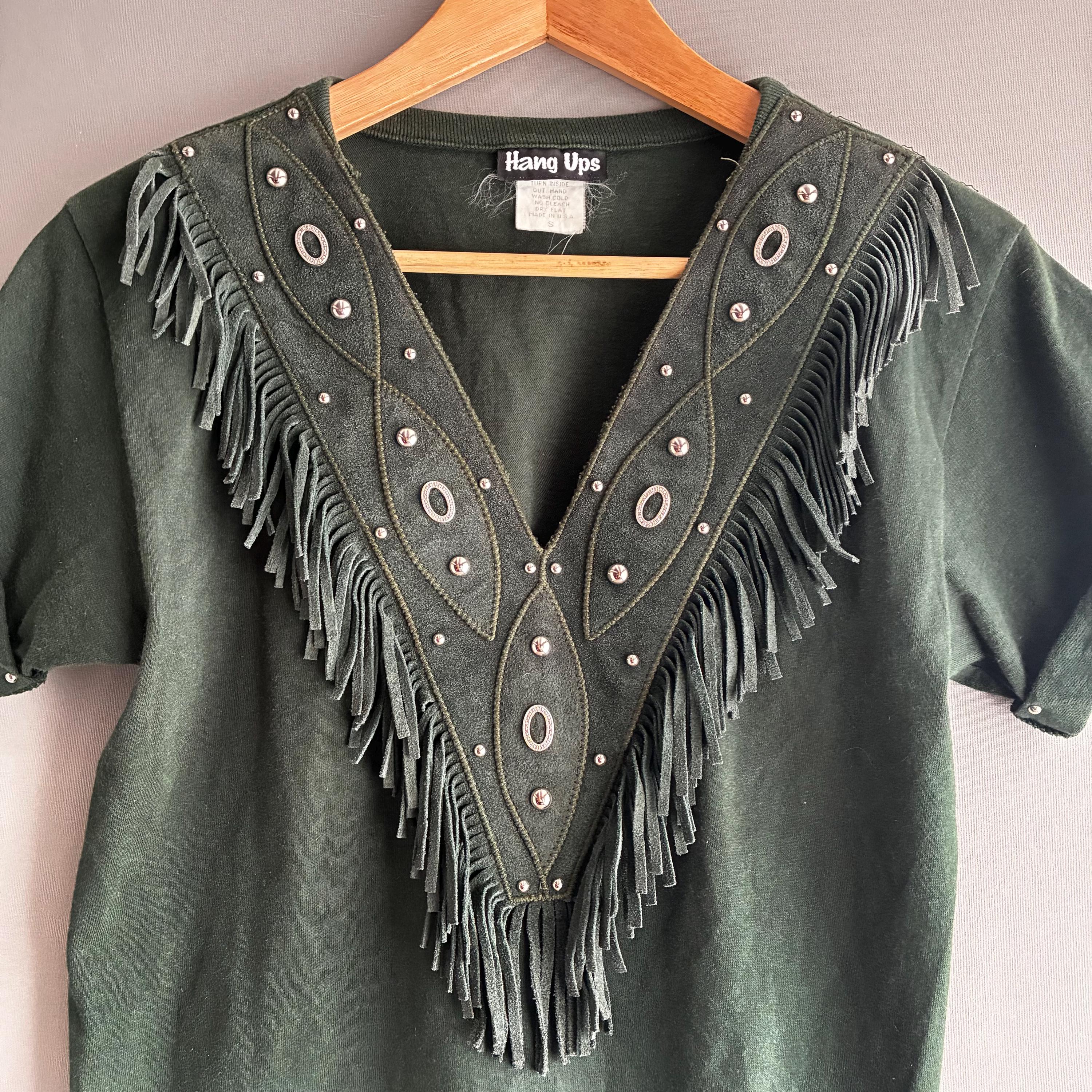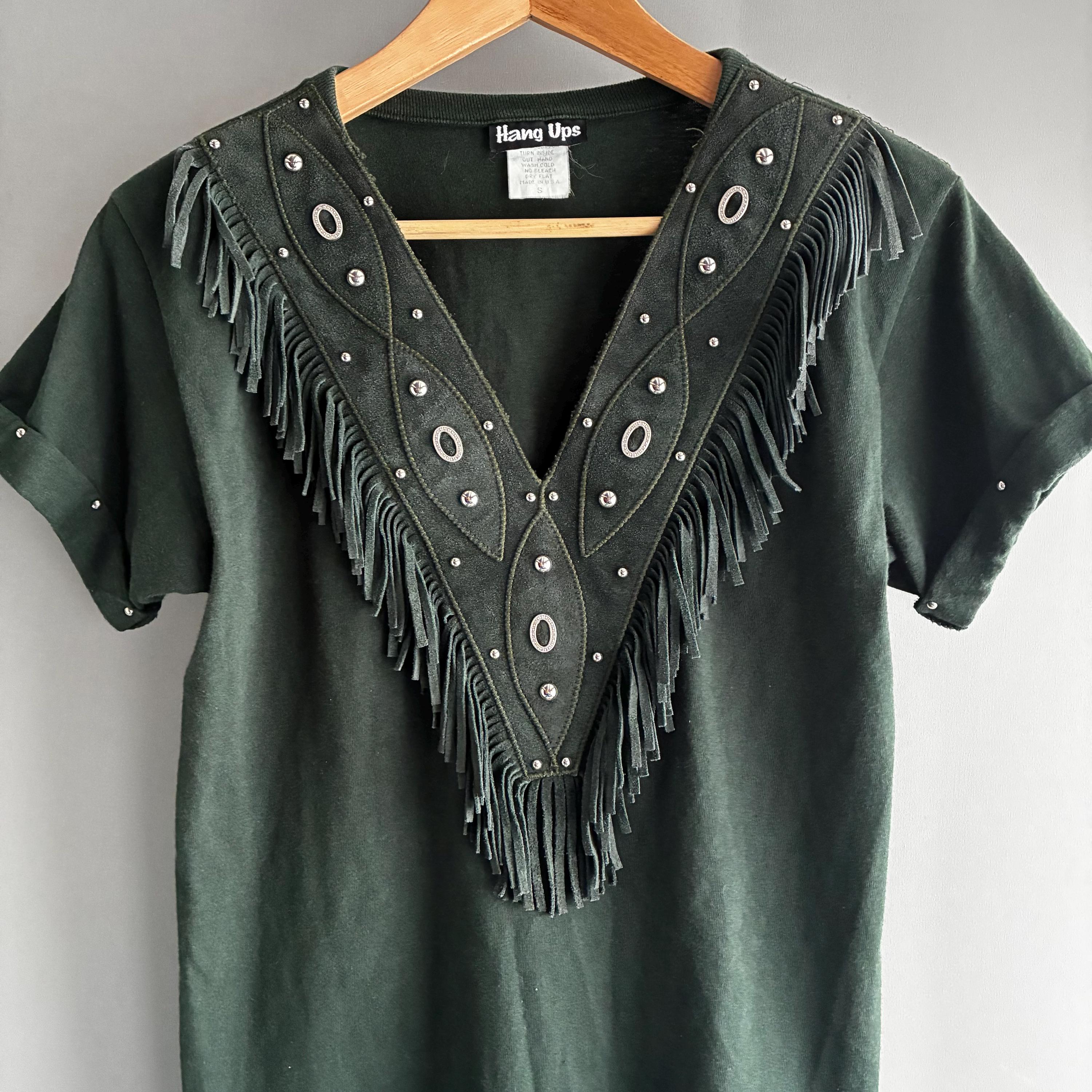 Vintage 1980s Rare suede/ Leather Fringe Cotton t-Shirt . A western-style shirt by the brand Hang Ups in Dark forest green deep V-neck Western-style fringe top decorated with metallic studs. 100% cotton shirt . Looks great on