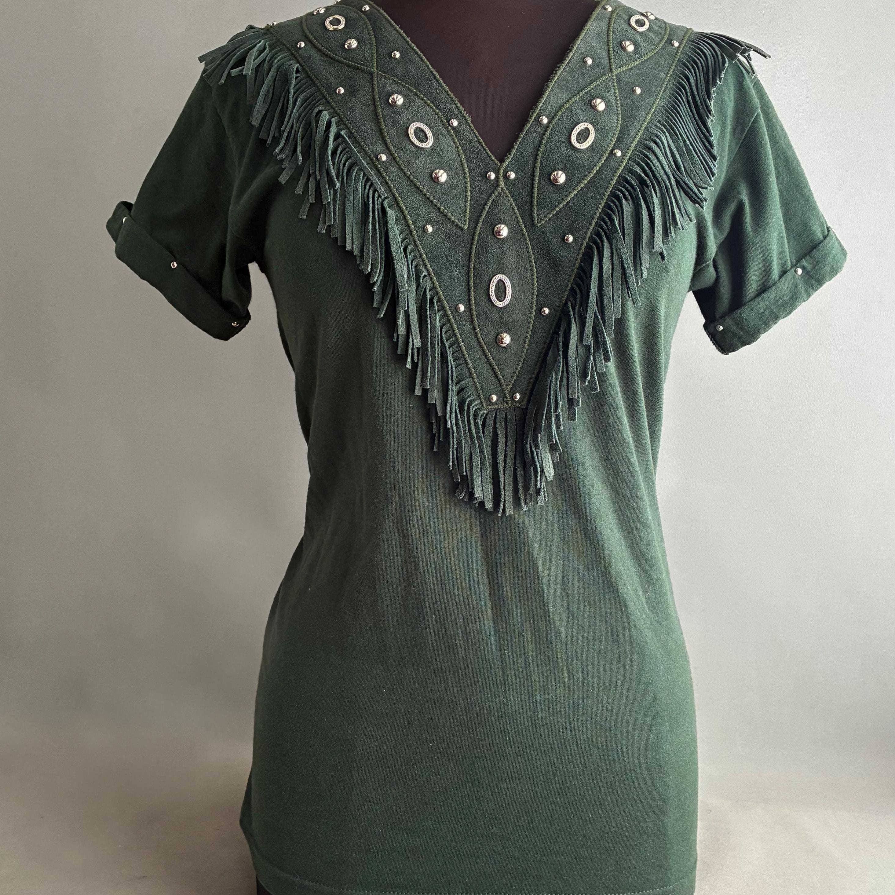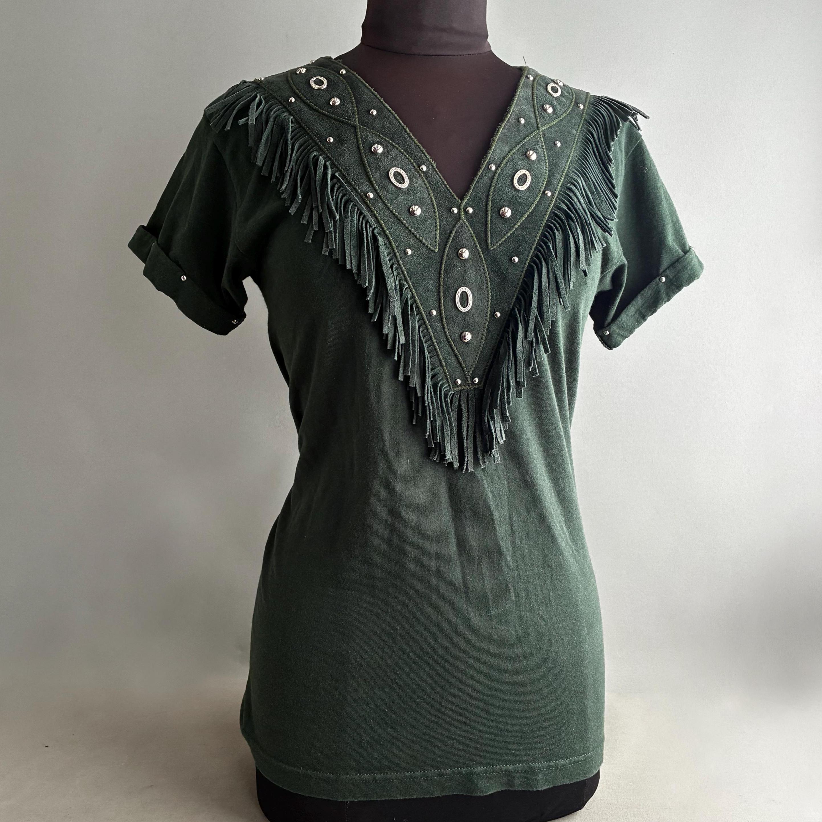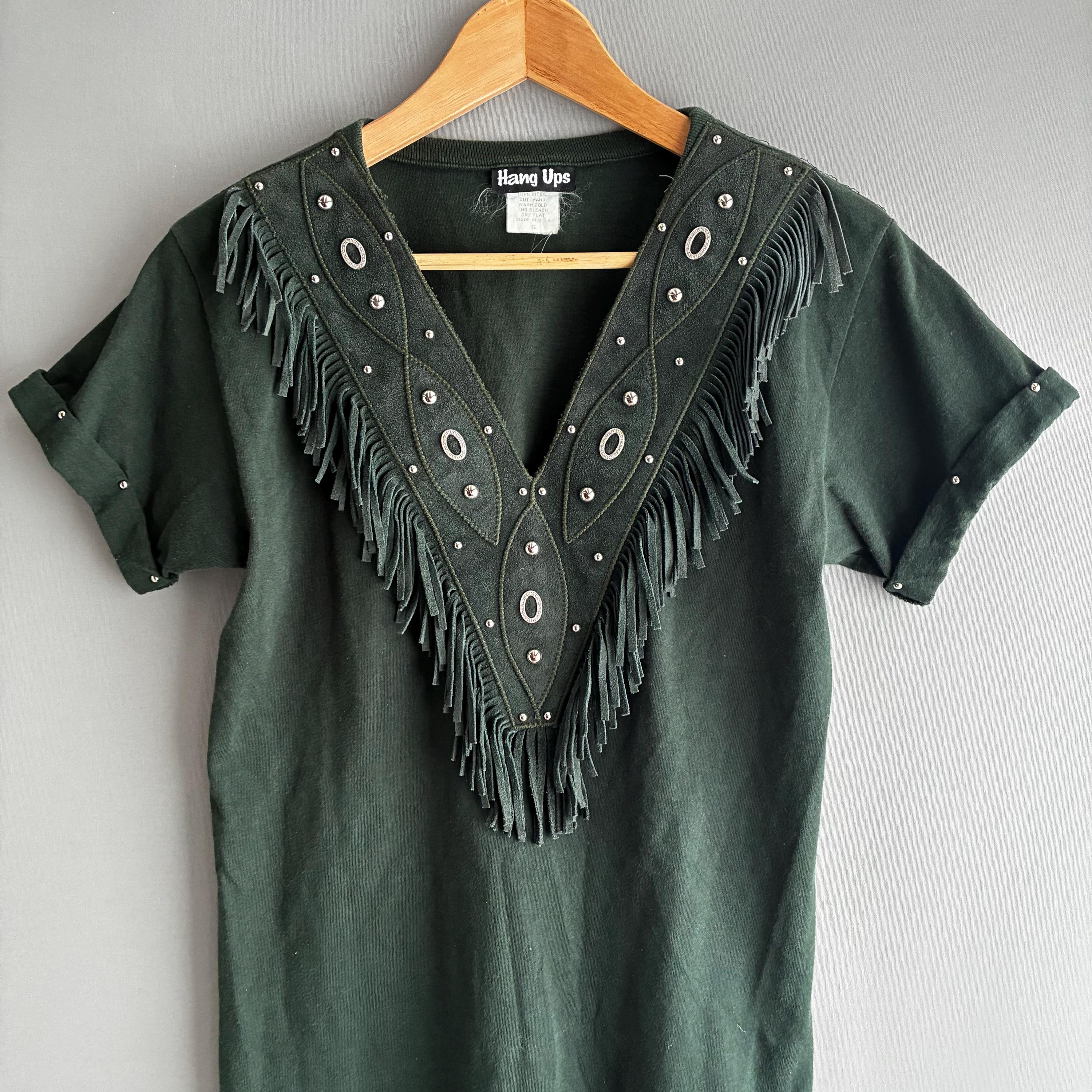 Vintage 1980s Rare suede/ Leather Fringe Cotton t-Shirt . A western-style shirt by the brand Hang Ups in Dark forest green deep V-neck Western-style fringe top decorated with metallic studs. 100% cotton shirt . Looks great on