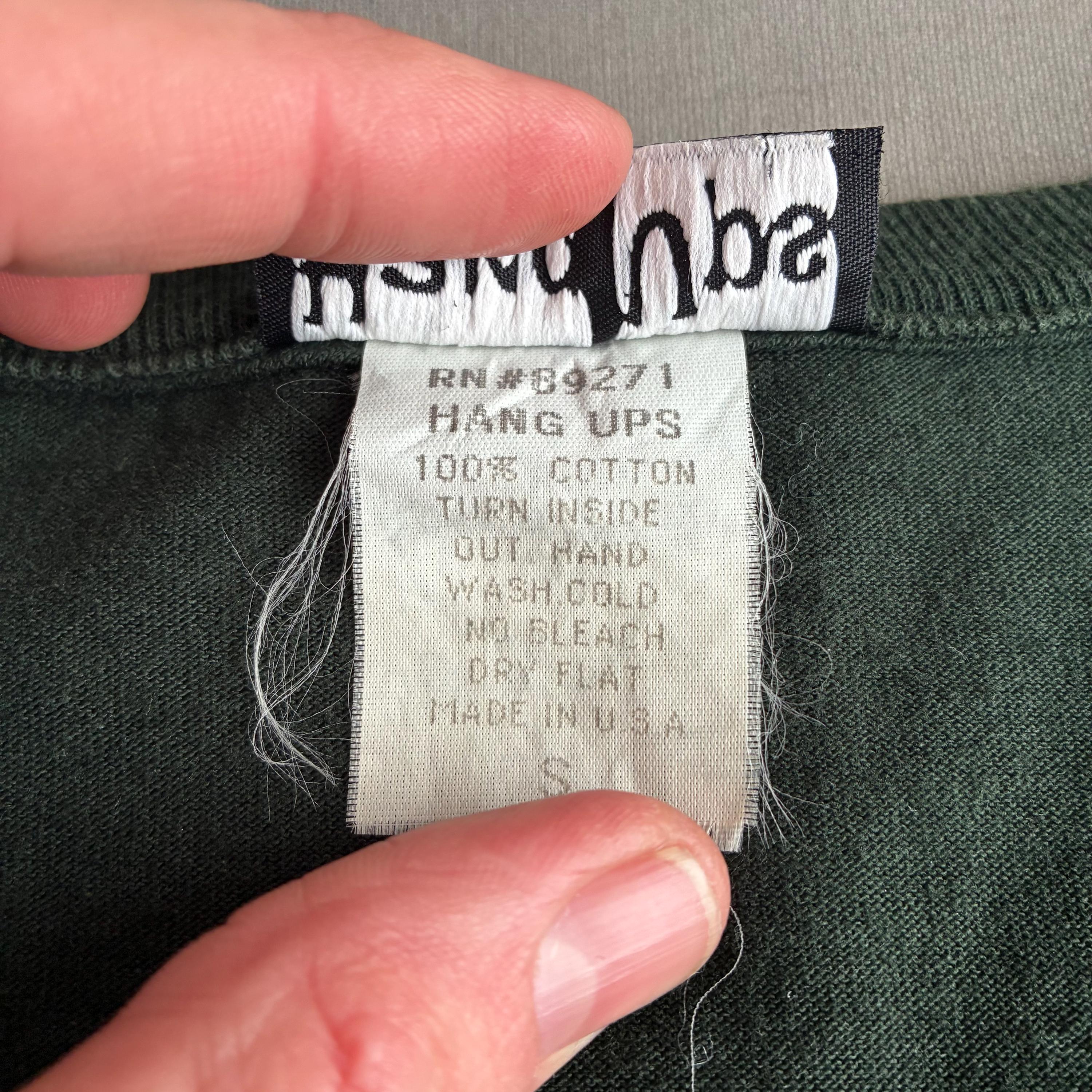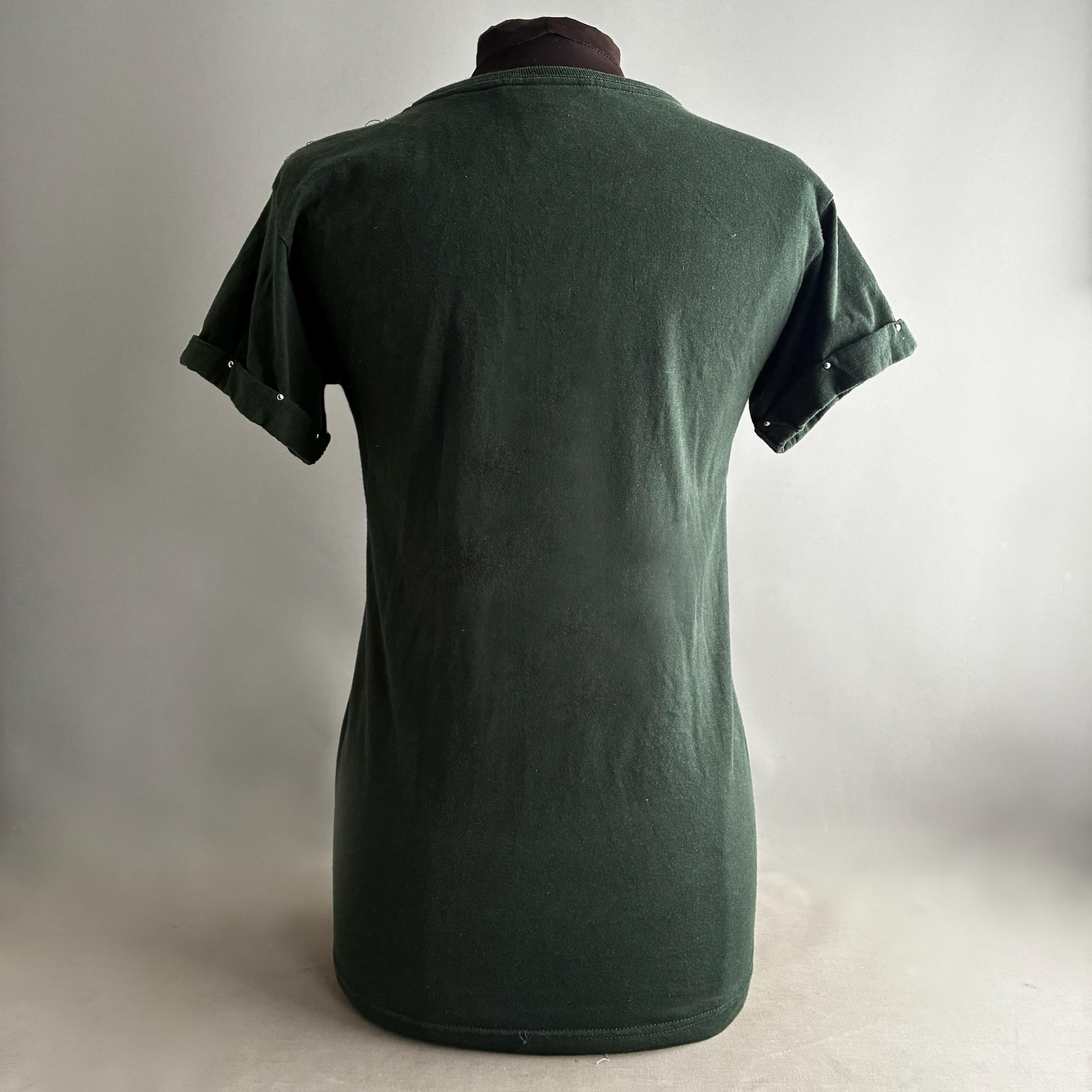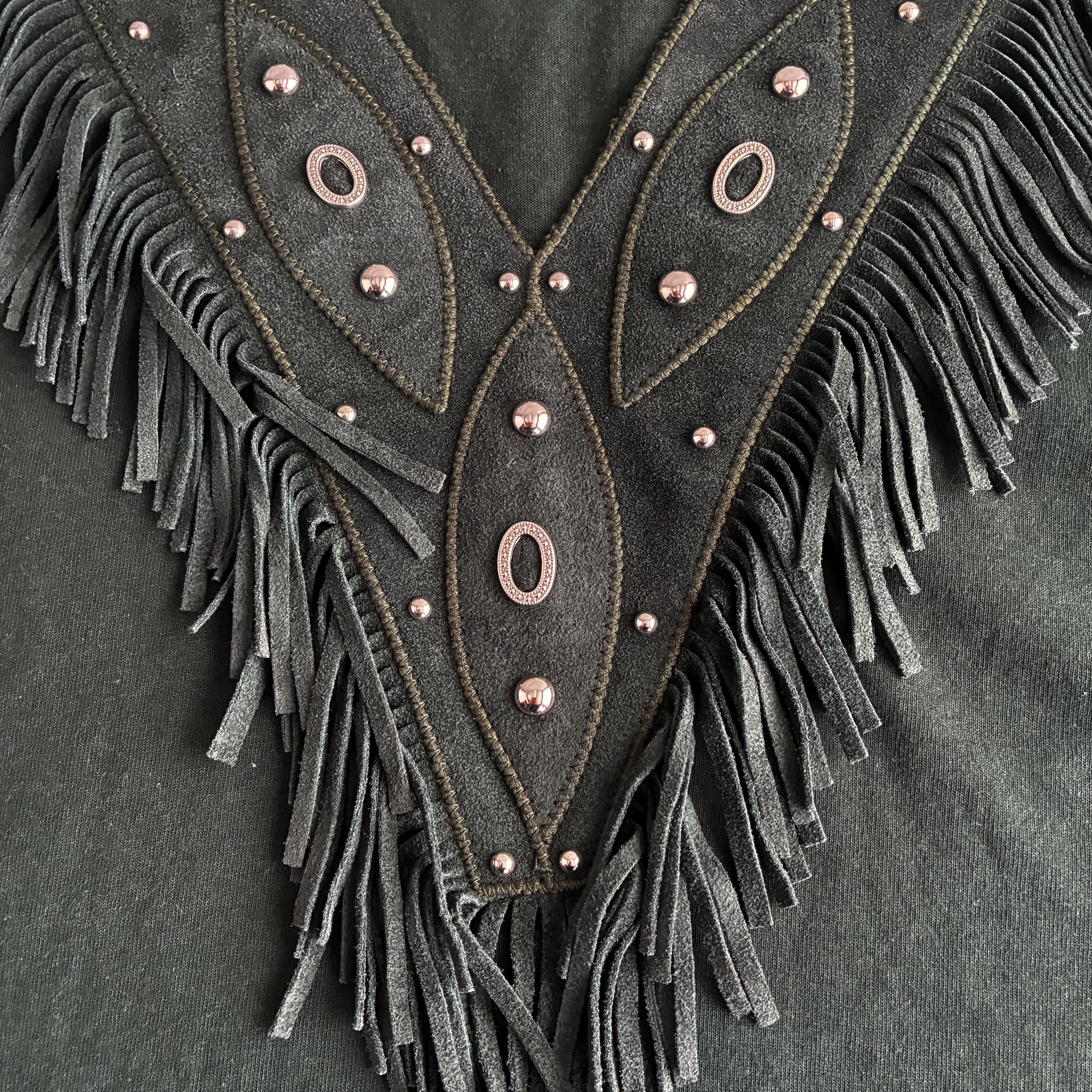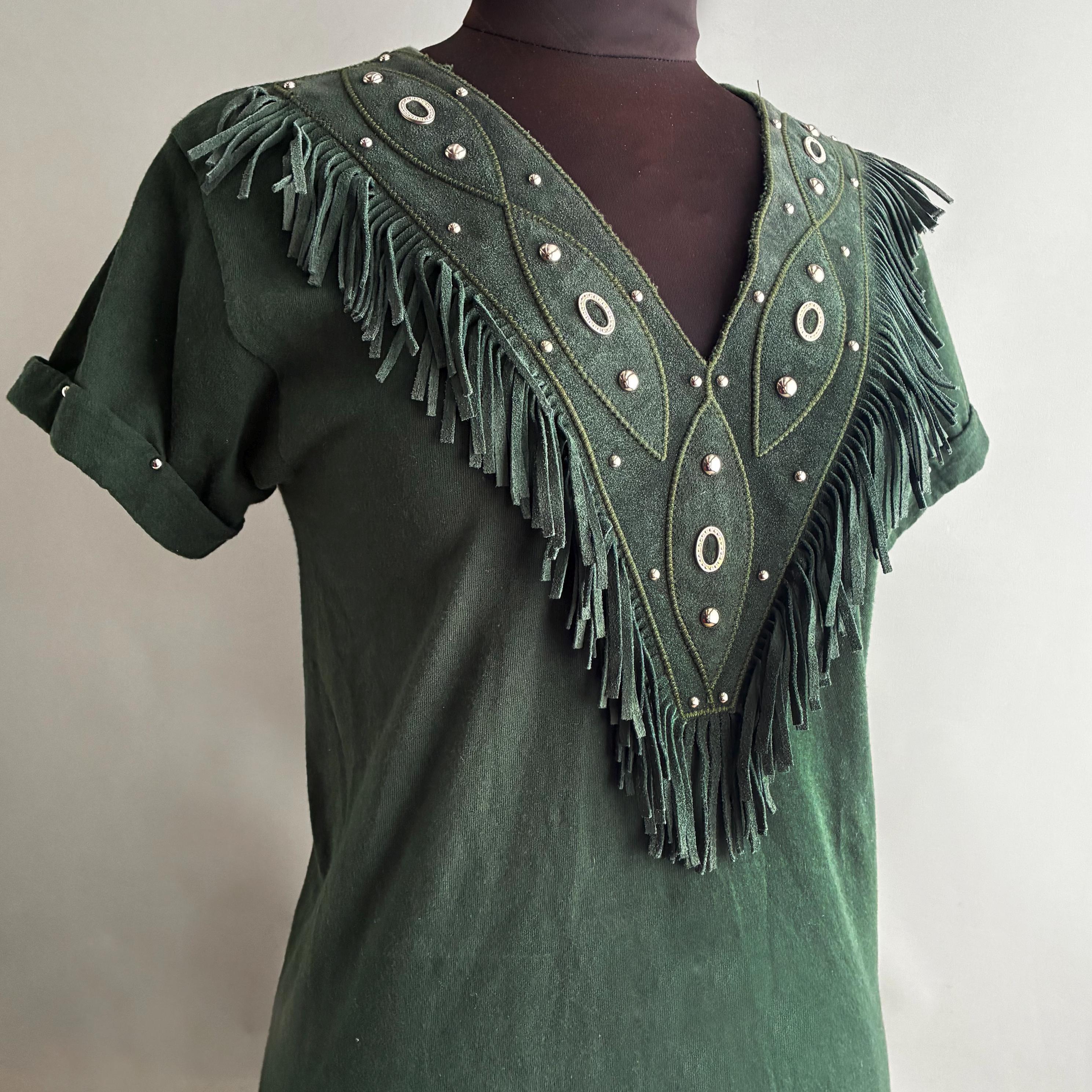 Vintage 1980s Rare suede/ Leather Fringe Cotton t-Shirt . A western-style shirt by the brand Hang Ups in Dark forest green deep V-neck Western-style fringe top decorated with metallic studs. 100% cotton shirt . Looks great on