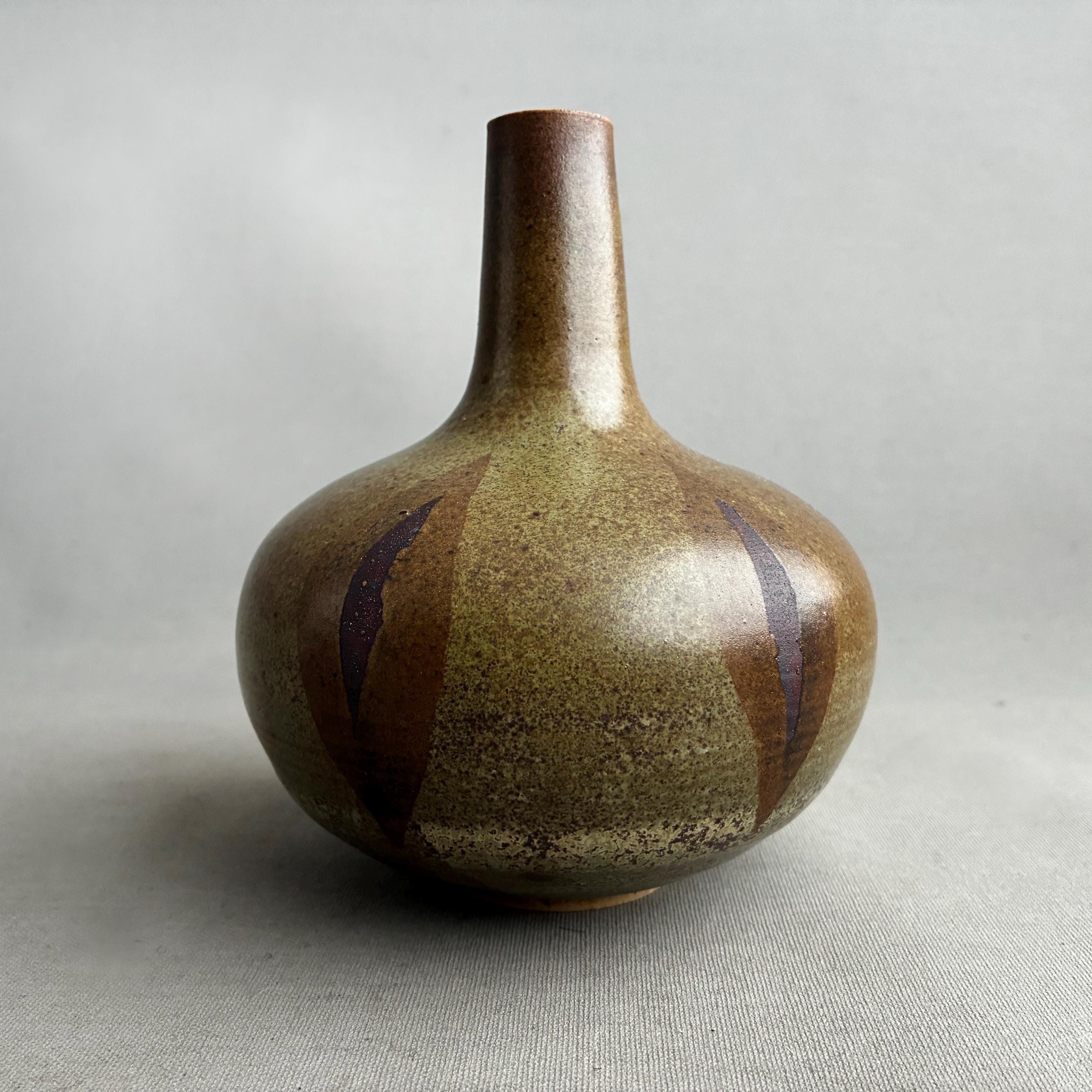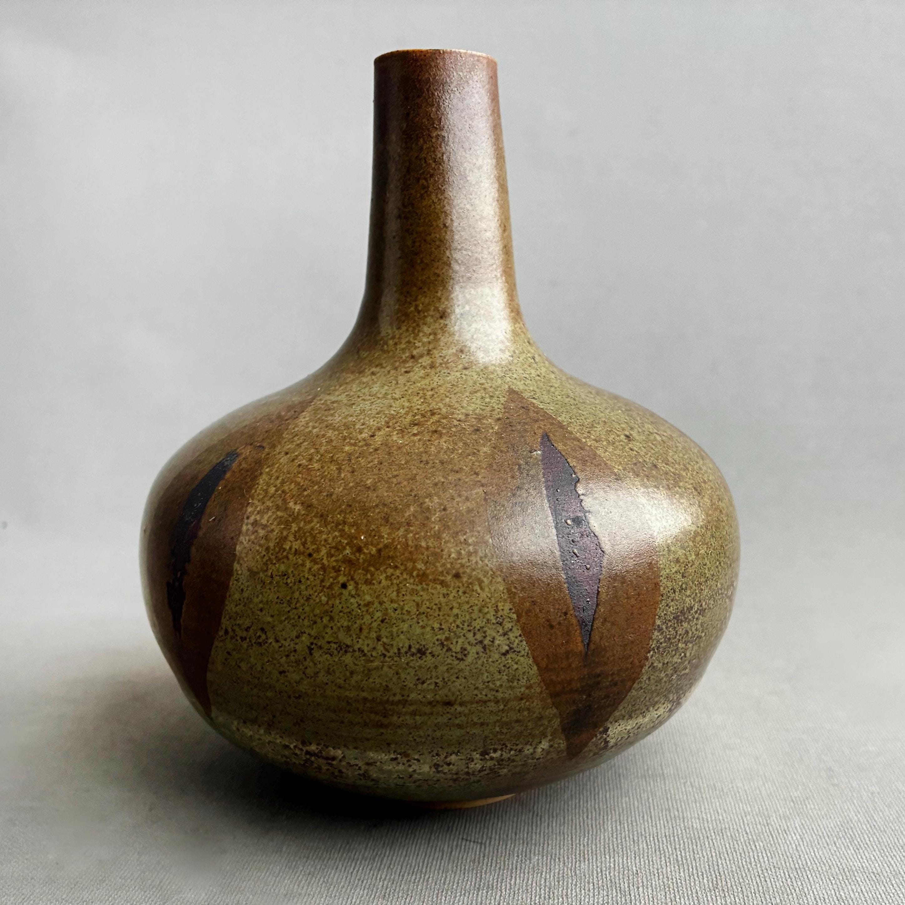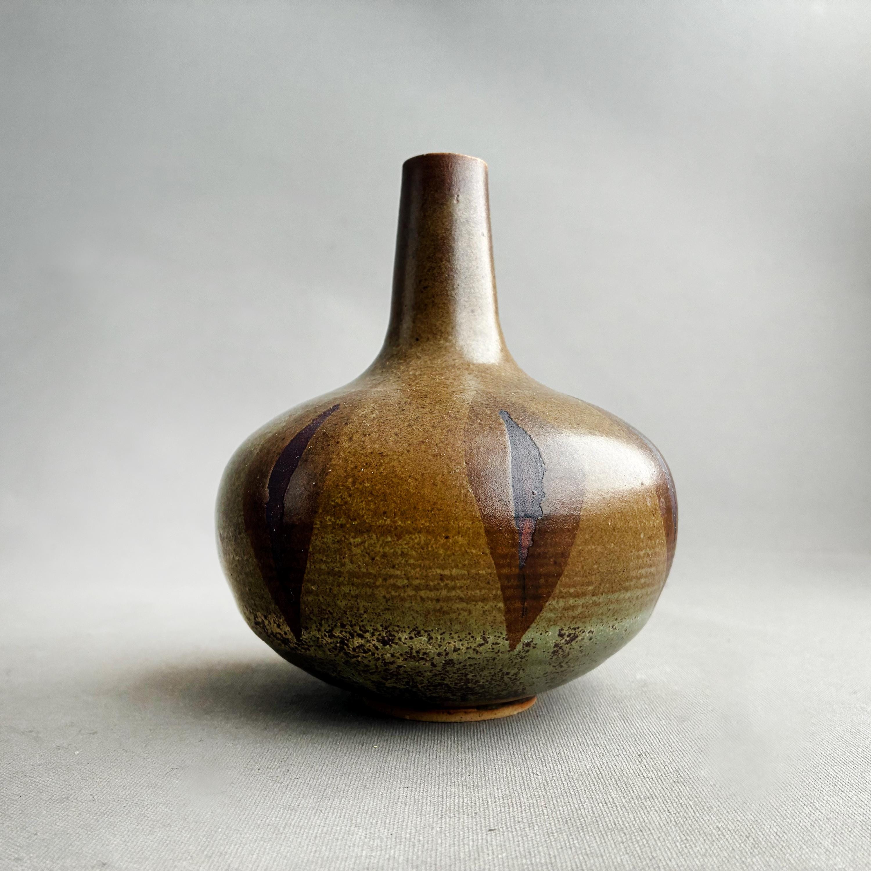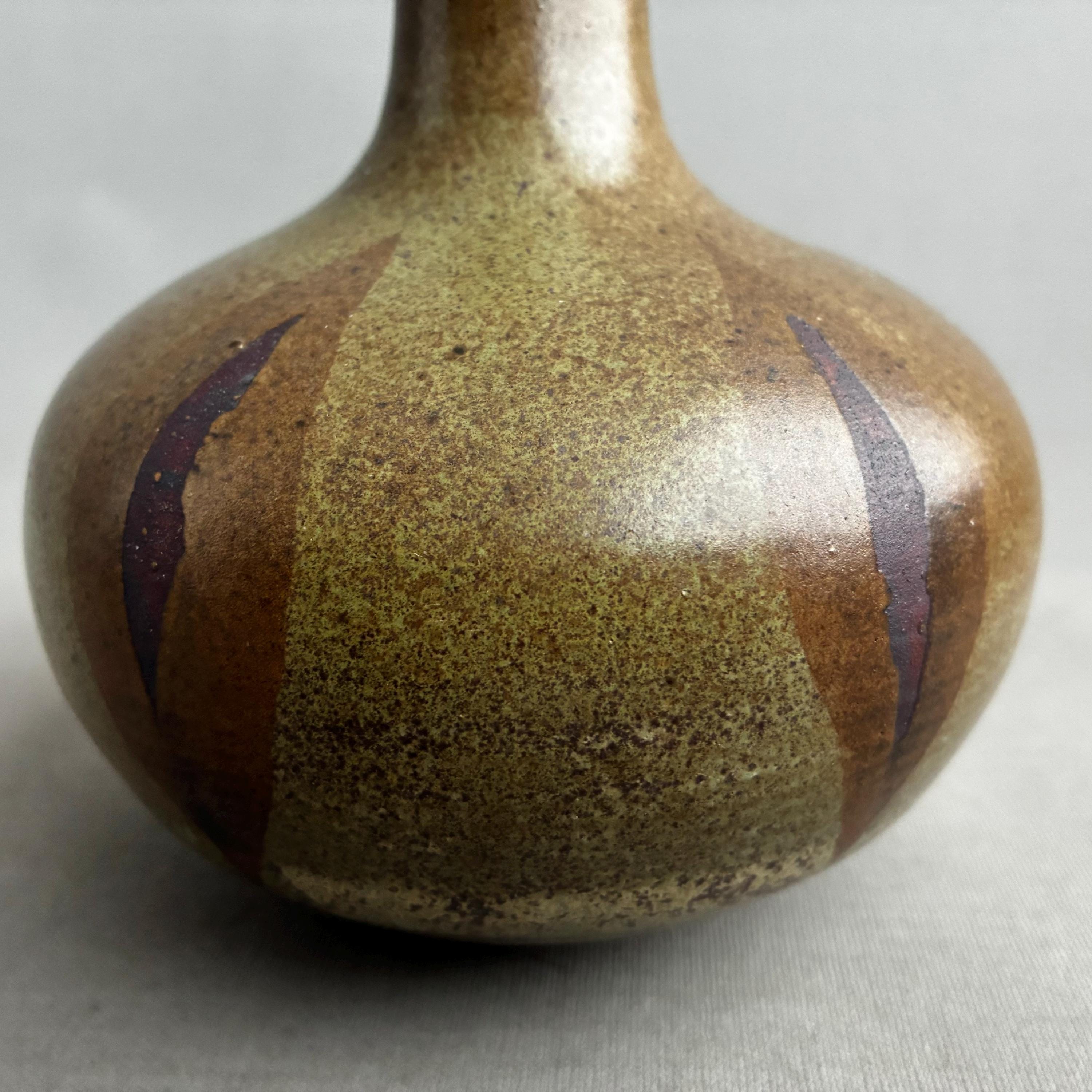 Bottle/ bulb shaped ceramic vase with a tall thin neck. Features a brown and olive green glaze with a distinctive patterned finish.