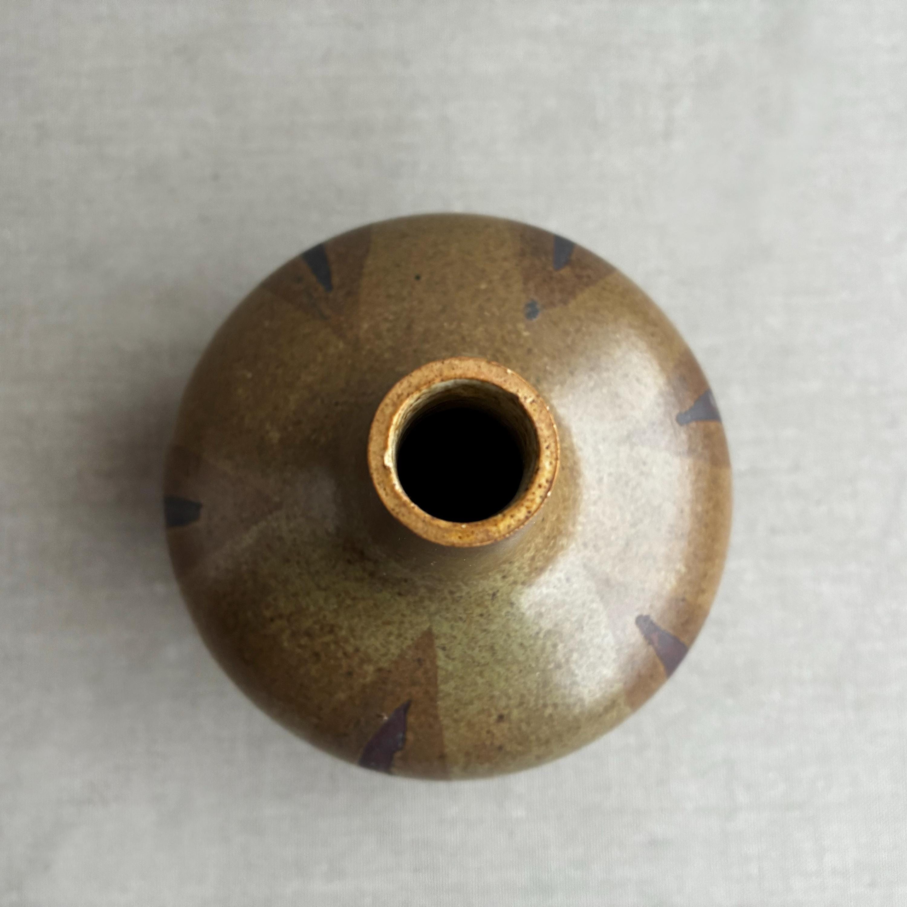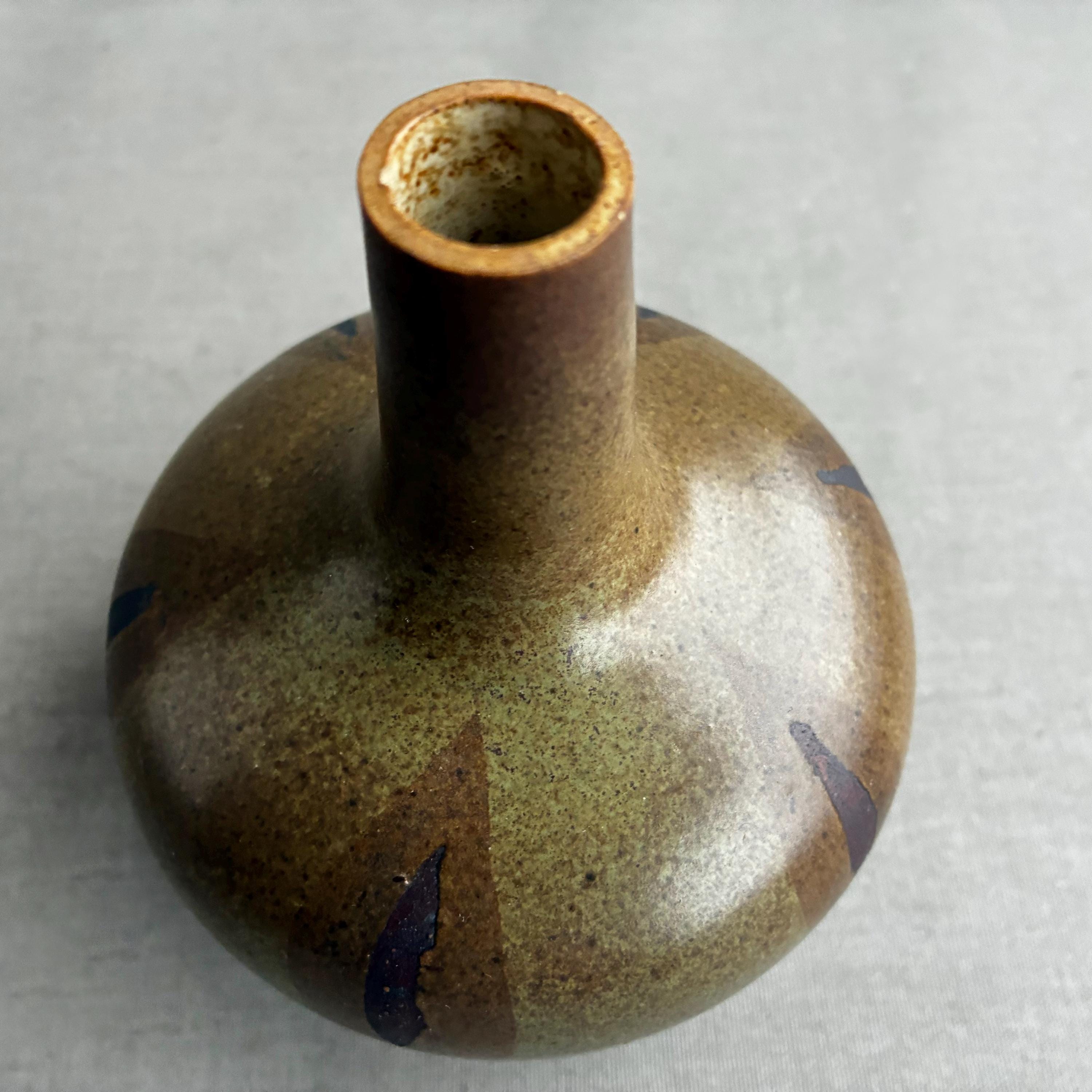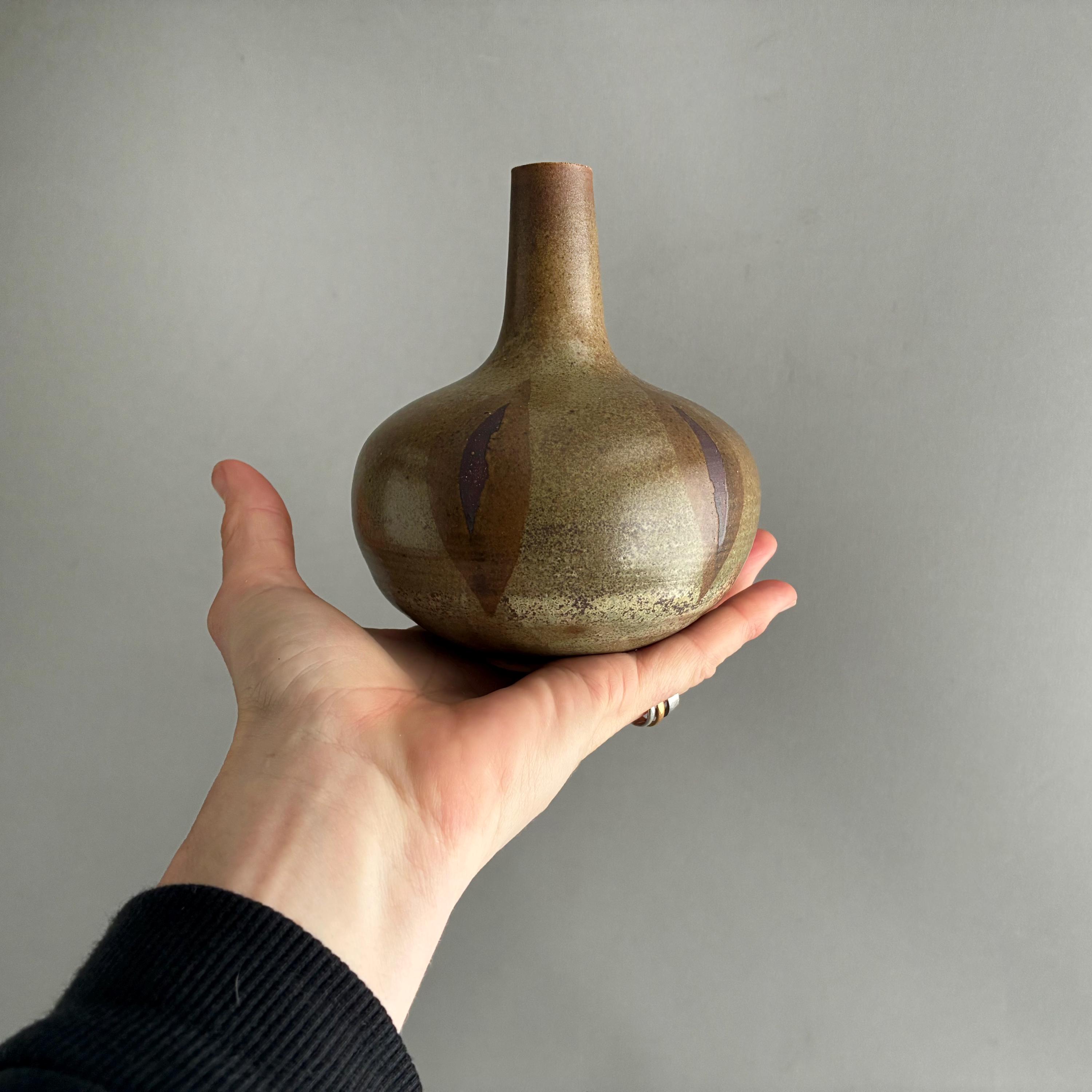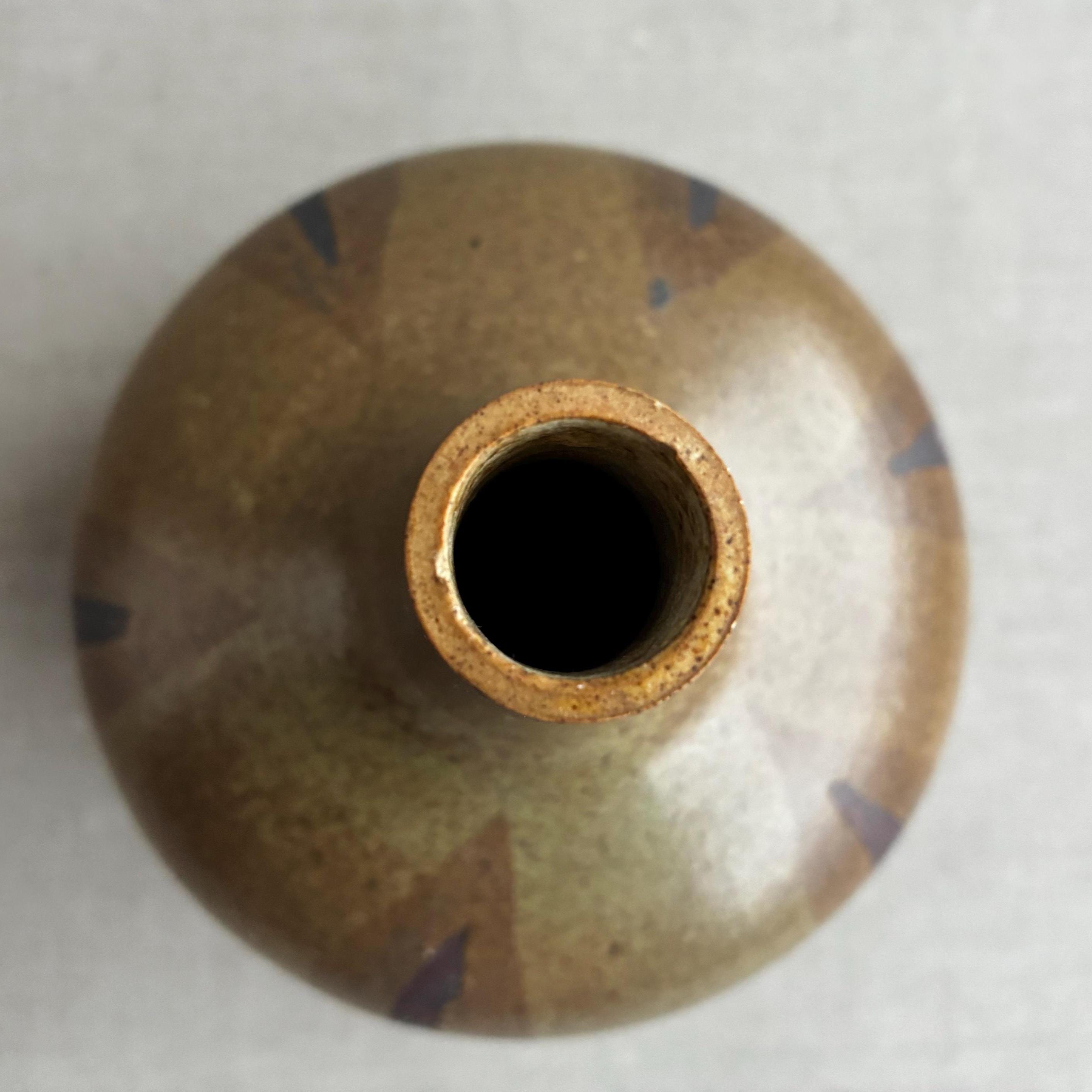 Bottle/ bulb shaped ceramic vase with a tall thin neck. Features a brown and olive green glaze with a distinctive patterned finish.