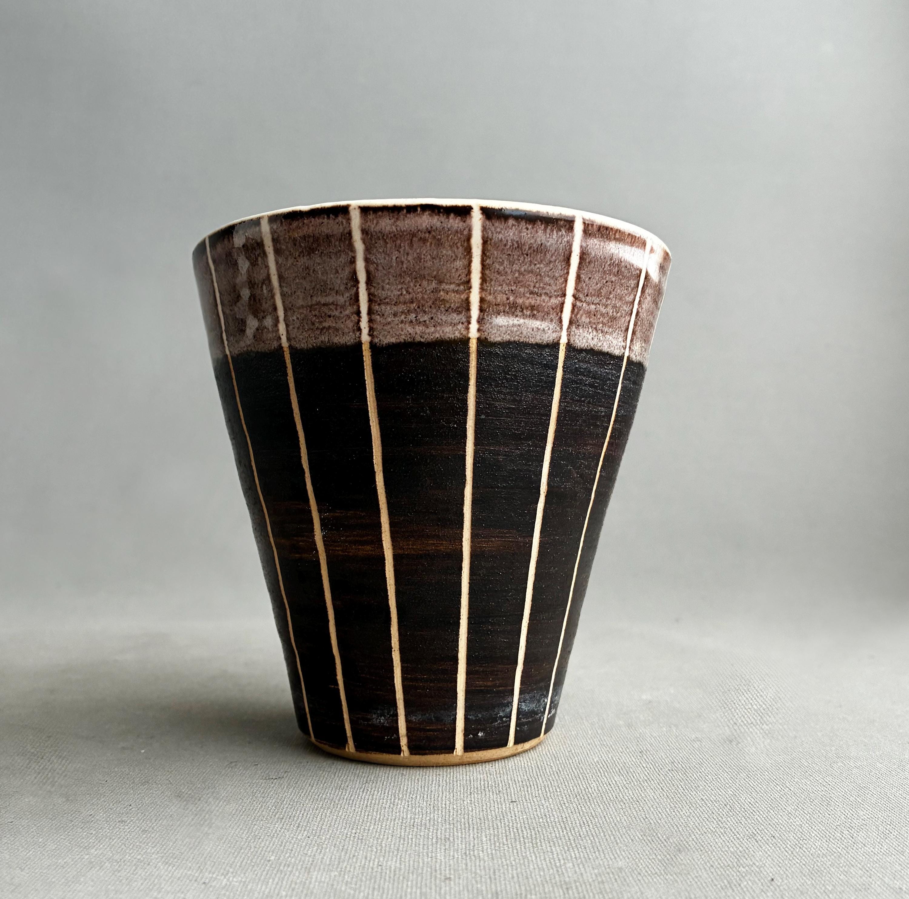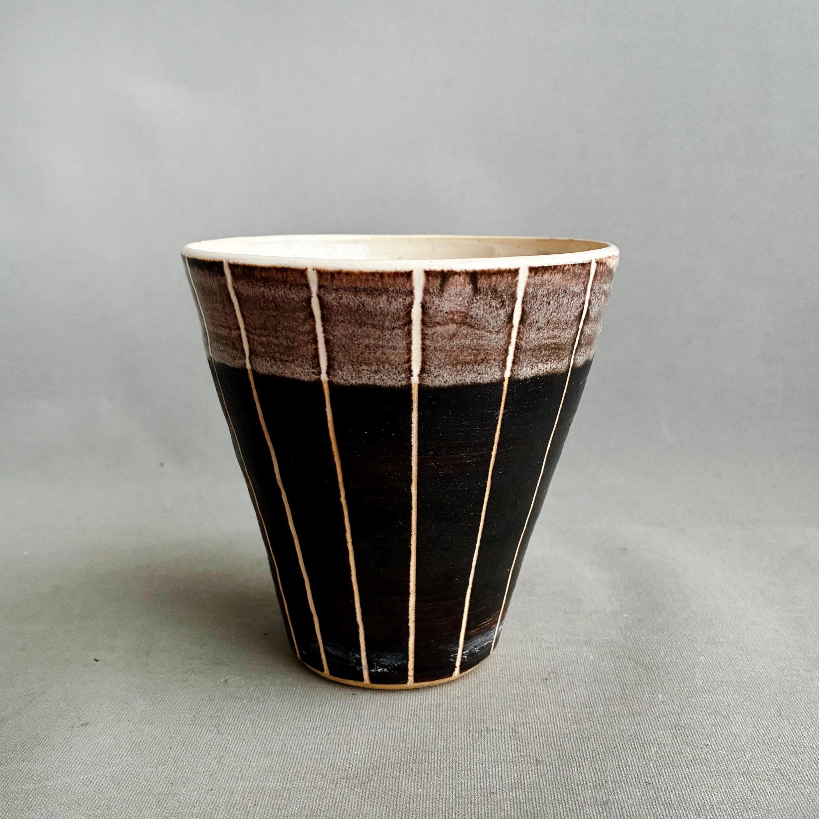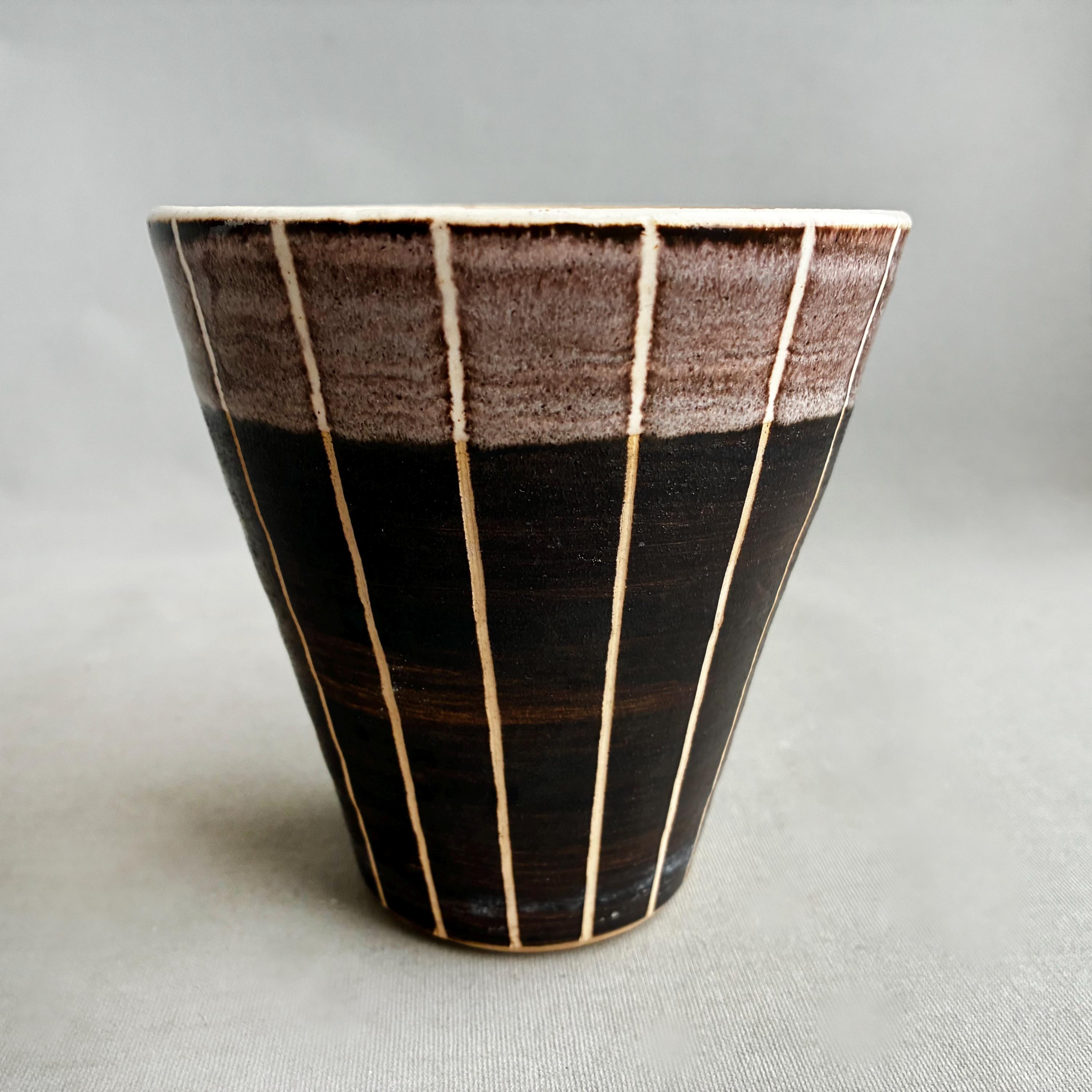 A lovely vintage studio pottery conical plant pot featuring a dark manganese glaze with vertical sgraffito lines.Reminicent of vessels by artists like Lucie Rie, this one is signed / stamped MARAZION -Started in 1950 by George Nash and his wife Heather in the village of Marazion, Cornwall. Continued until their retirement in 1981.
