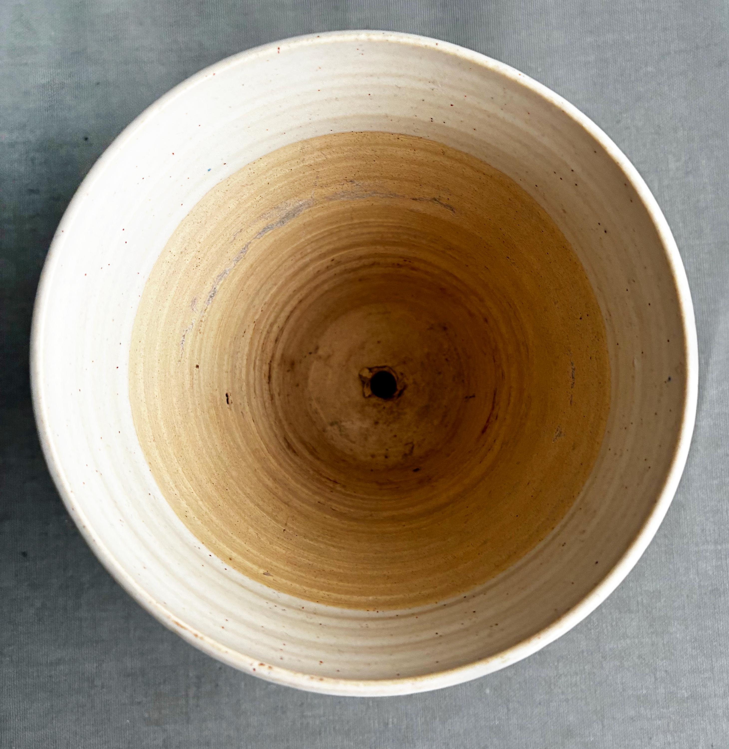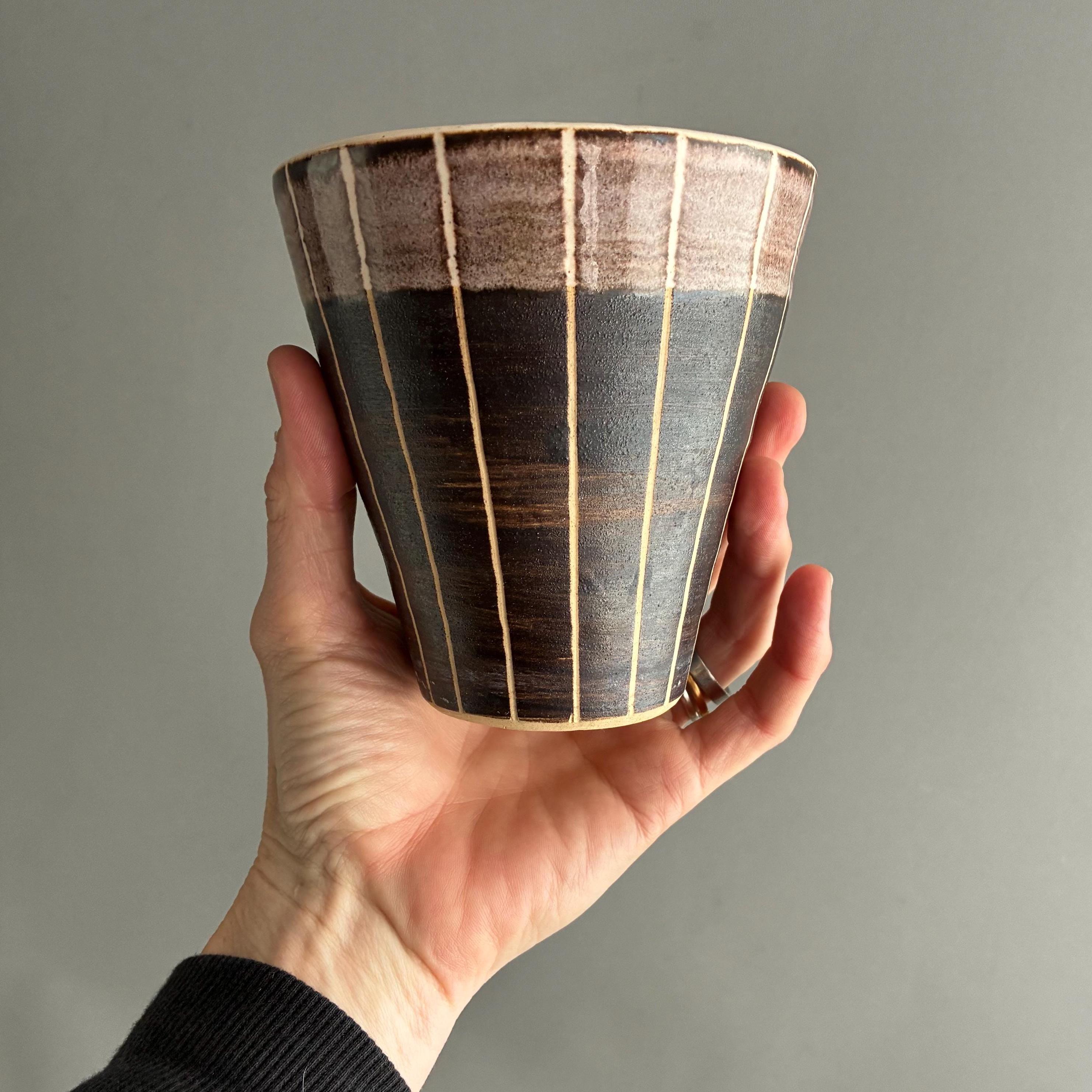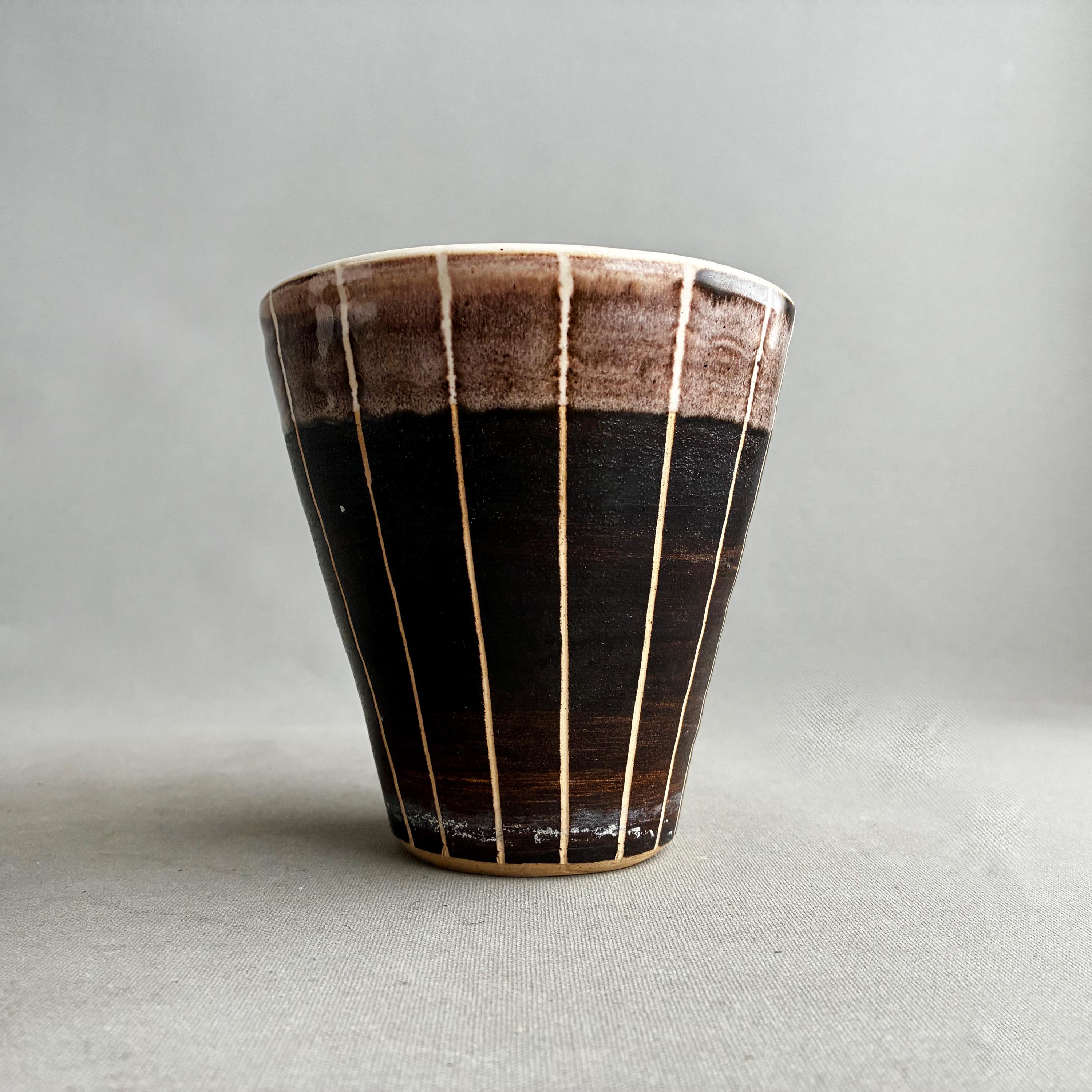 A lovely vintage studio pottery conical plant pot featuring a dark manganese glaze with vertical sgraffito lines.Reminicent of vessels by artists like Lucie Rie, this one is signed / stamped MARAZION -Started in 1950 by George Nash and his wife Heather in the village of Marazion, Cornwall. Continued until their retirement in 1981.