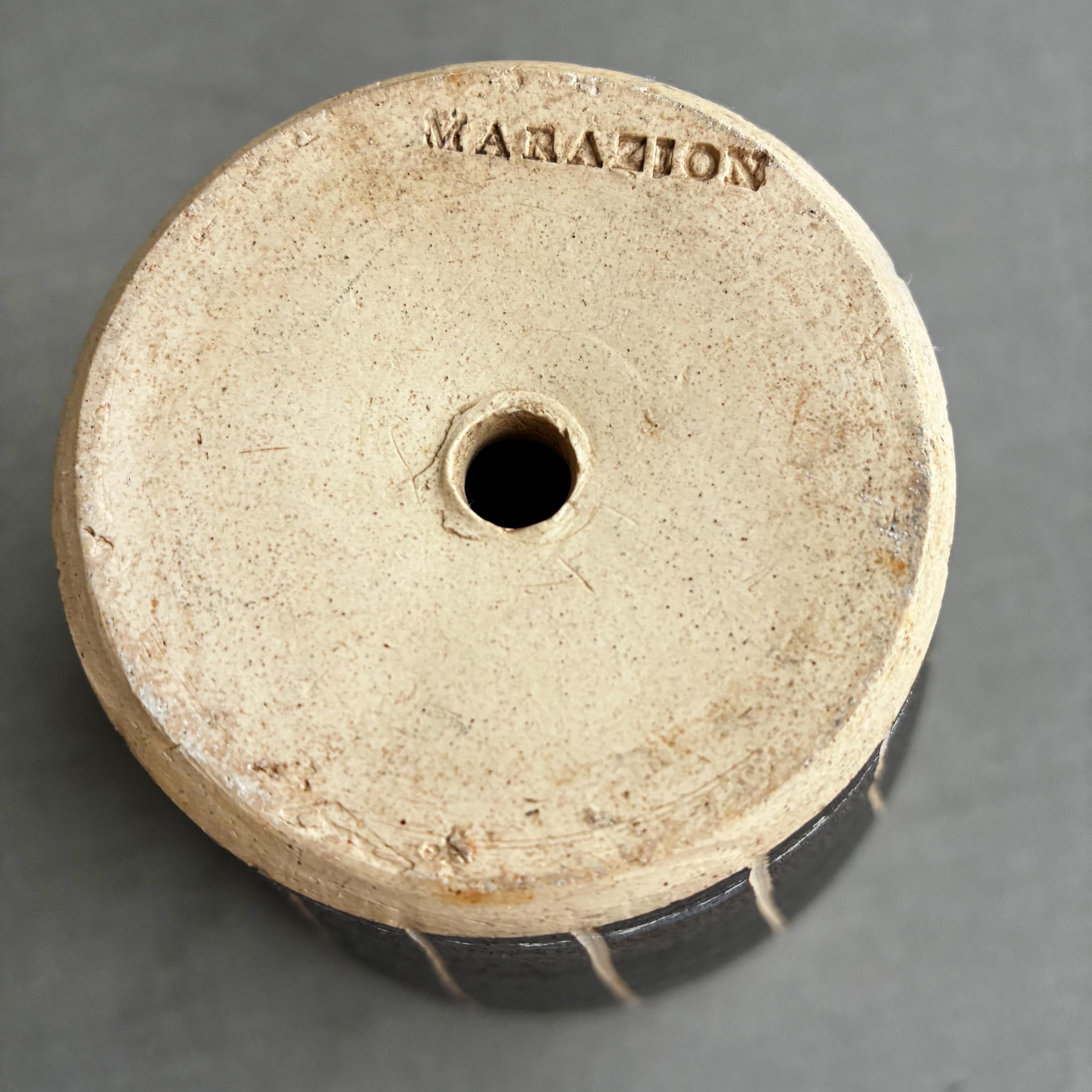 The black glaze and sgraffito pattern on this vase is typical of their work. Marazion stamped on the base. Conical flaring form with a glossy black glaze and incised radiating white lines.