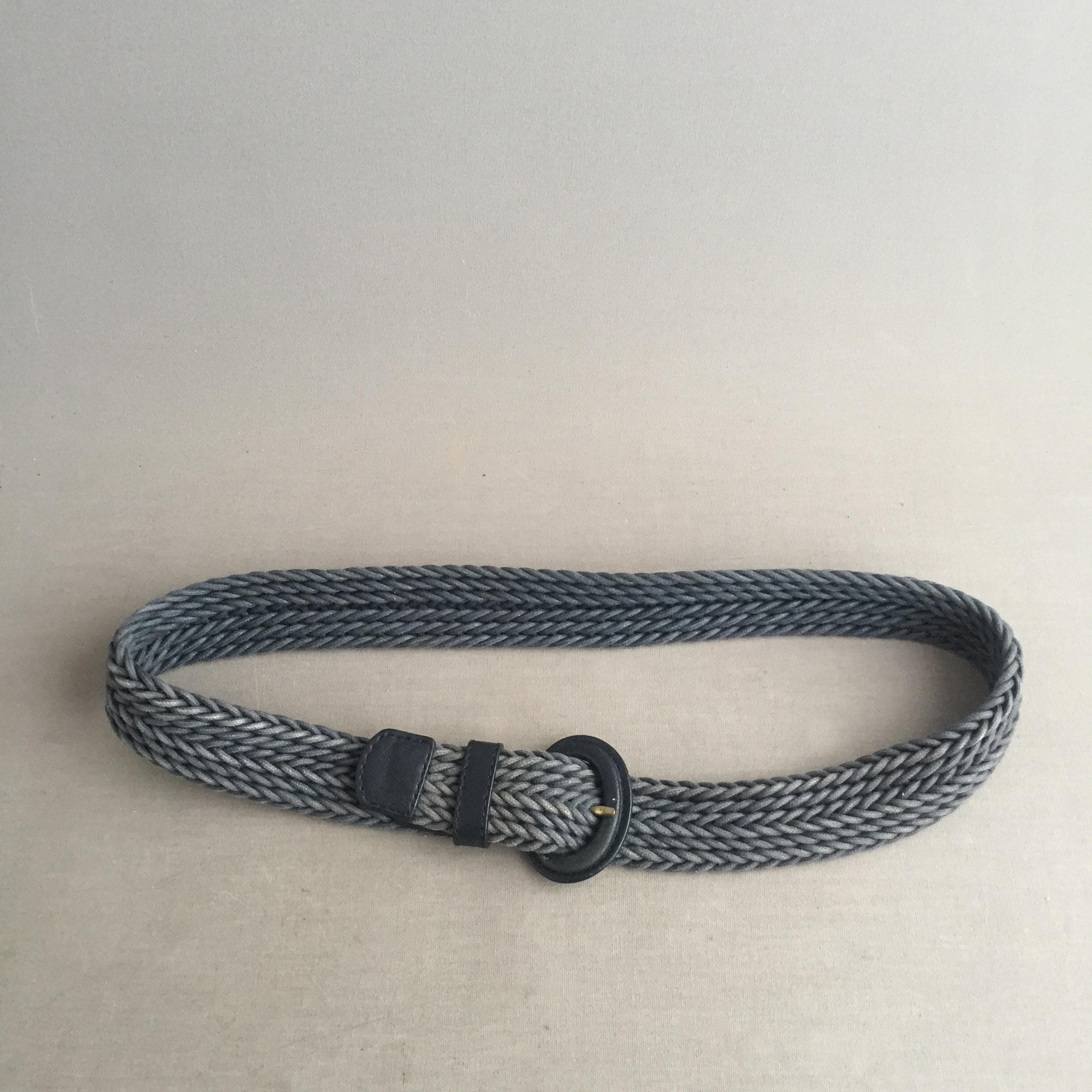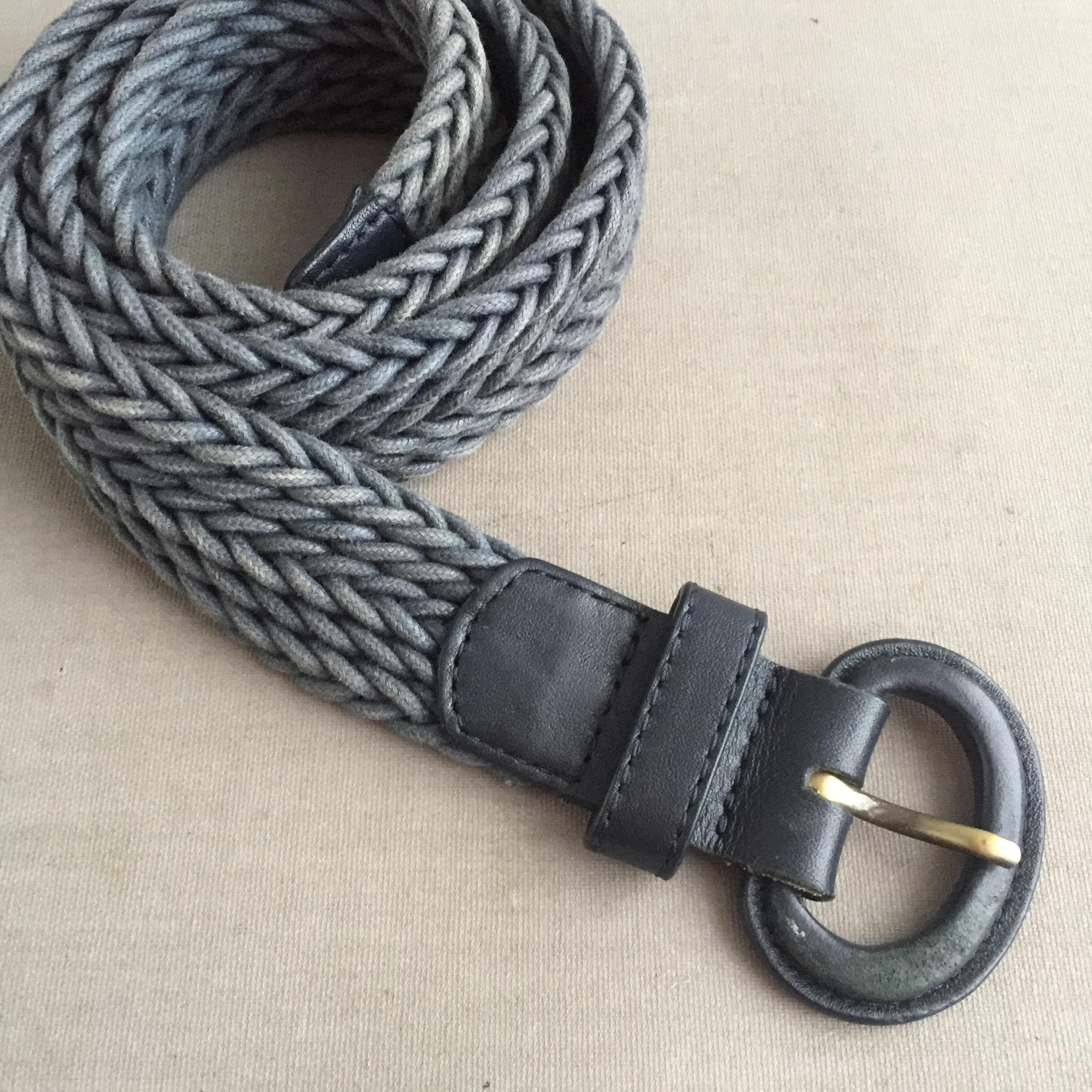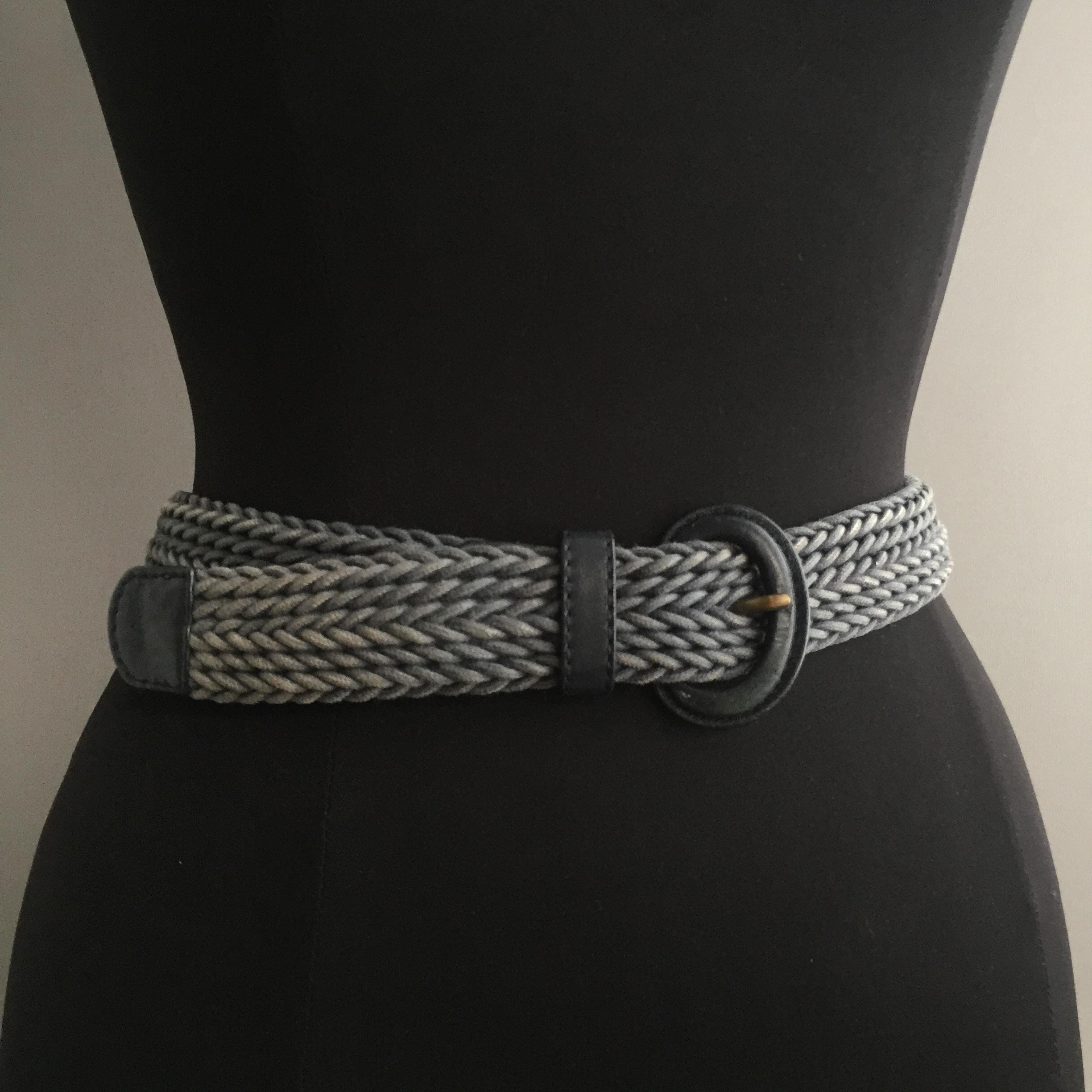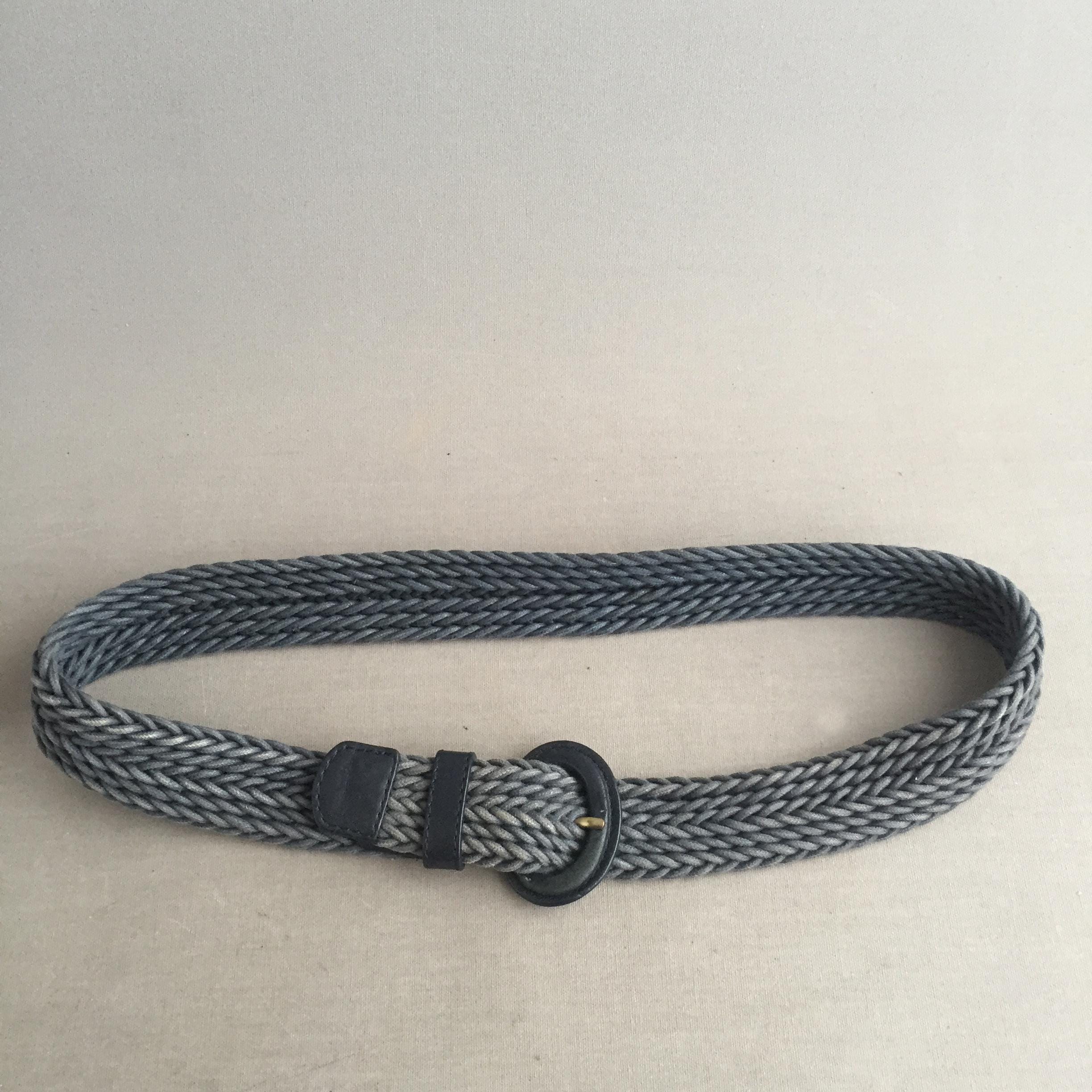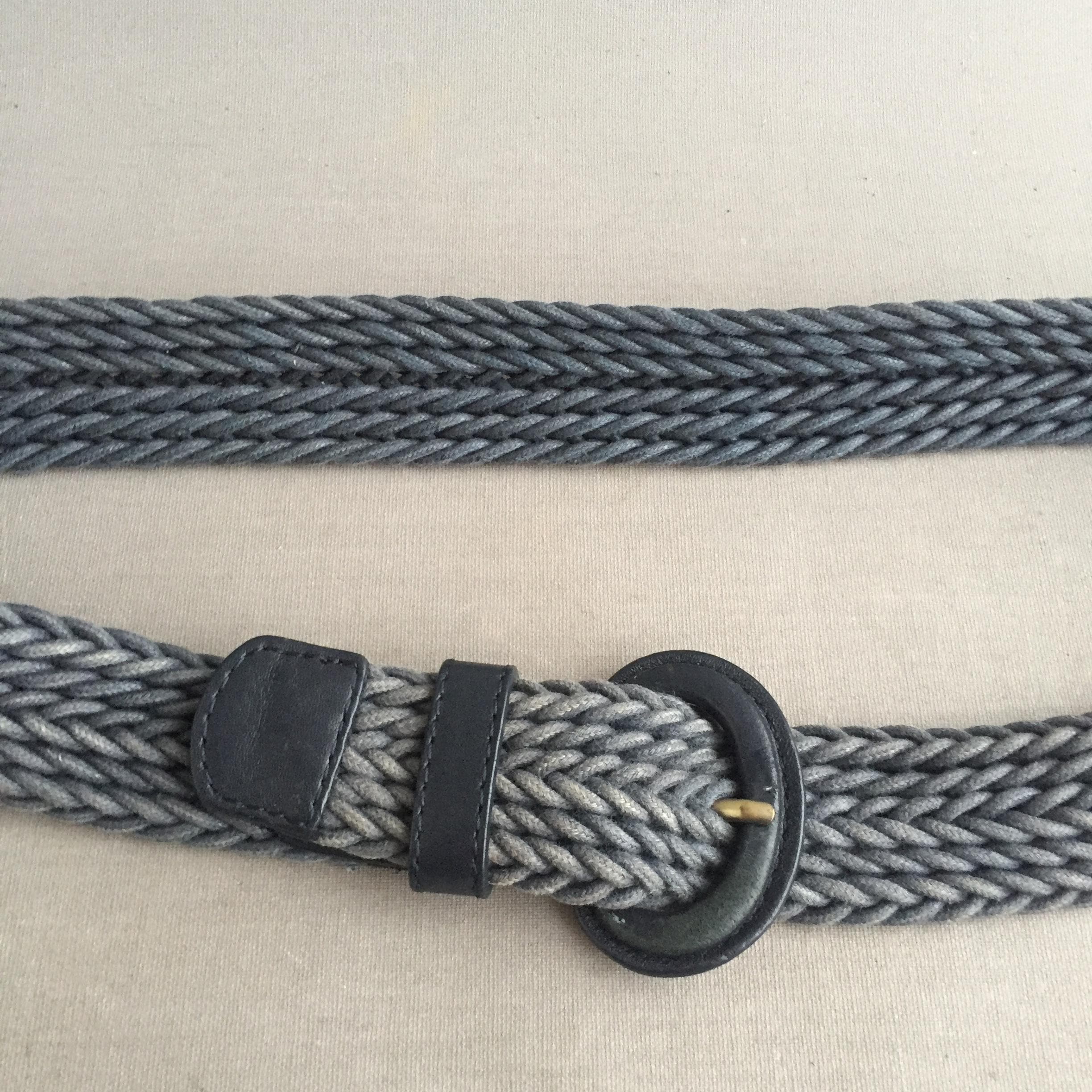 This is a faded blue woven braided cotton belt with blue leather end trims and buckle.