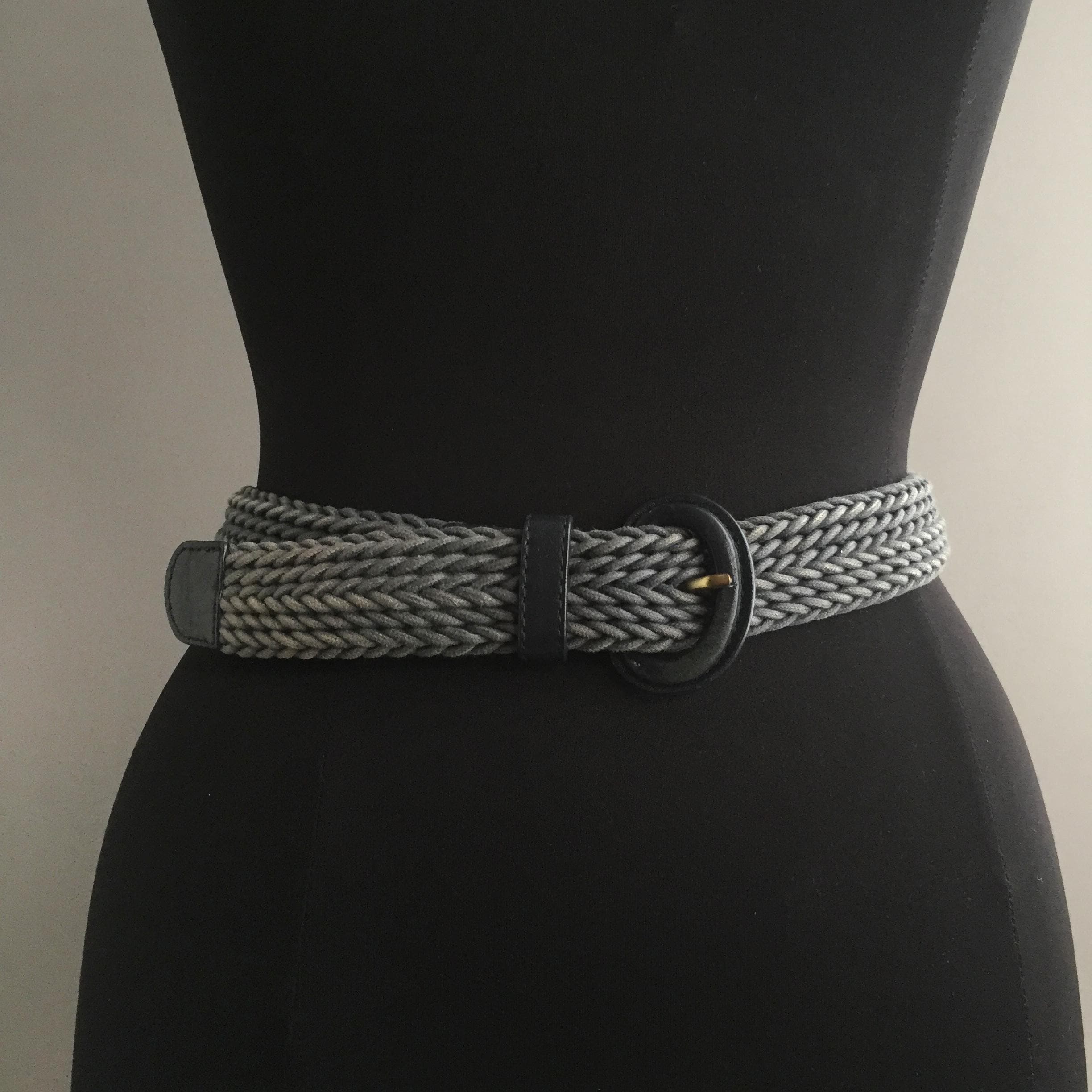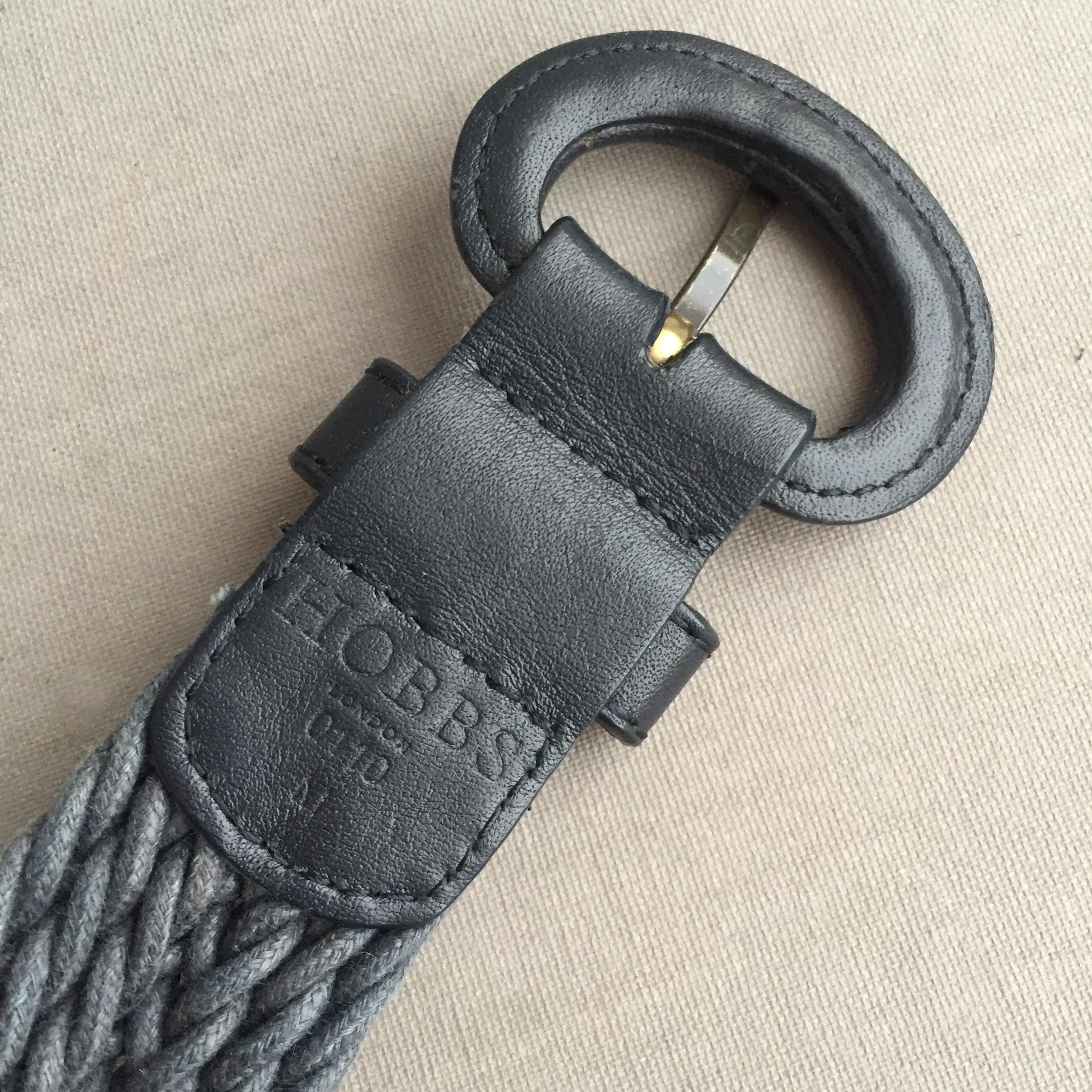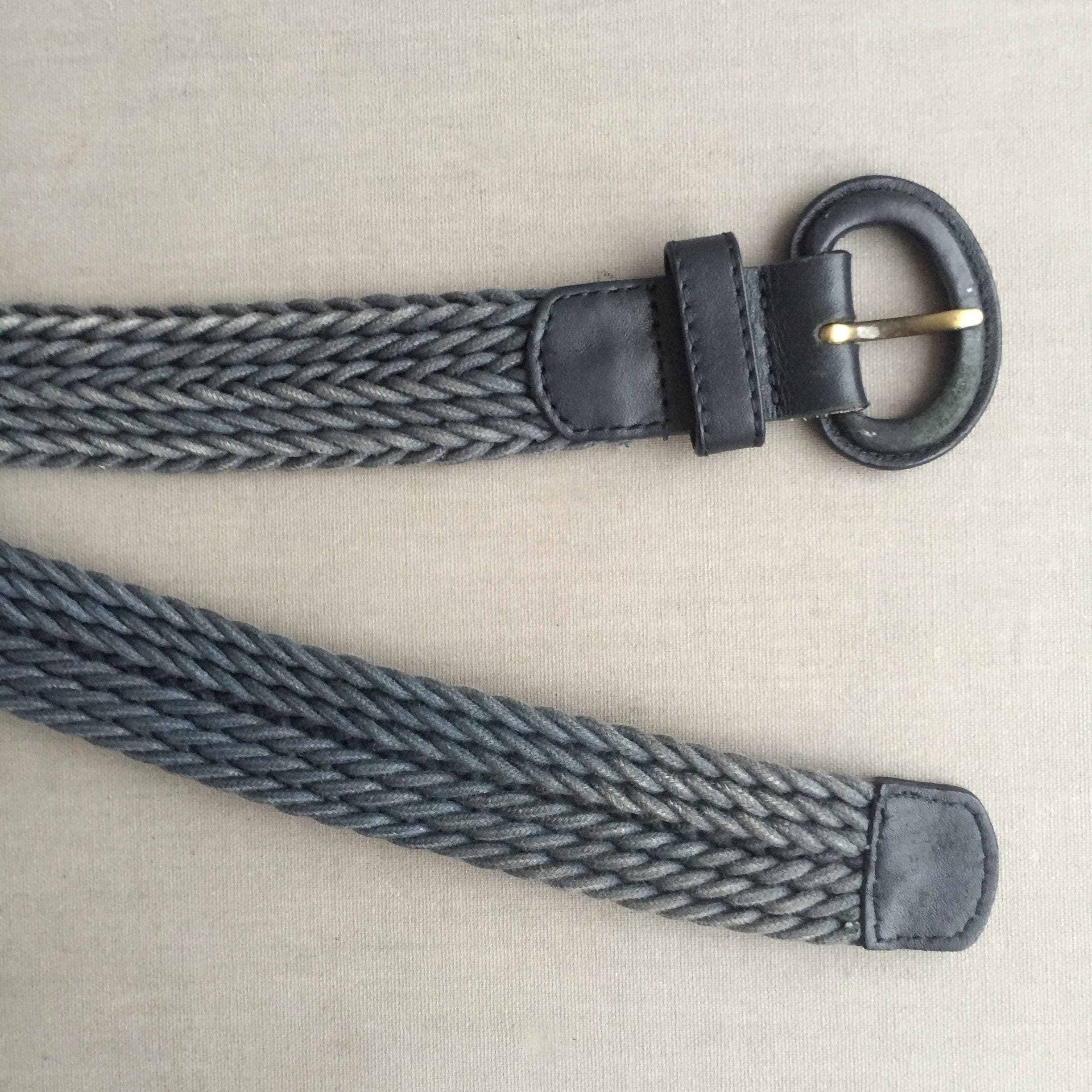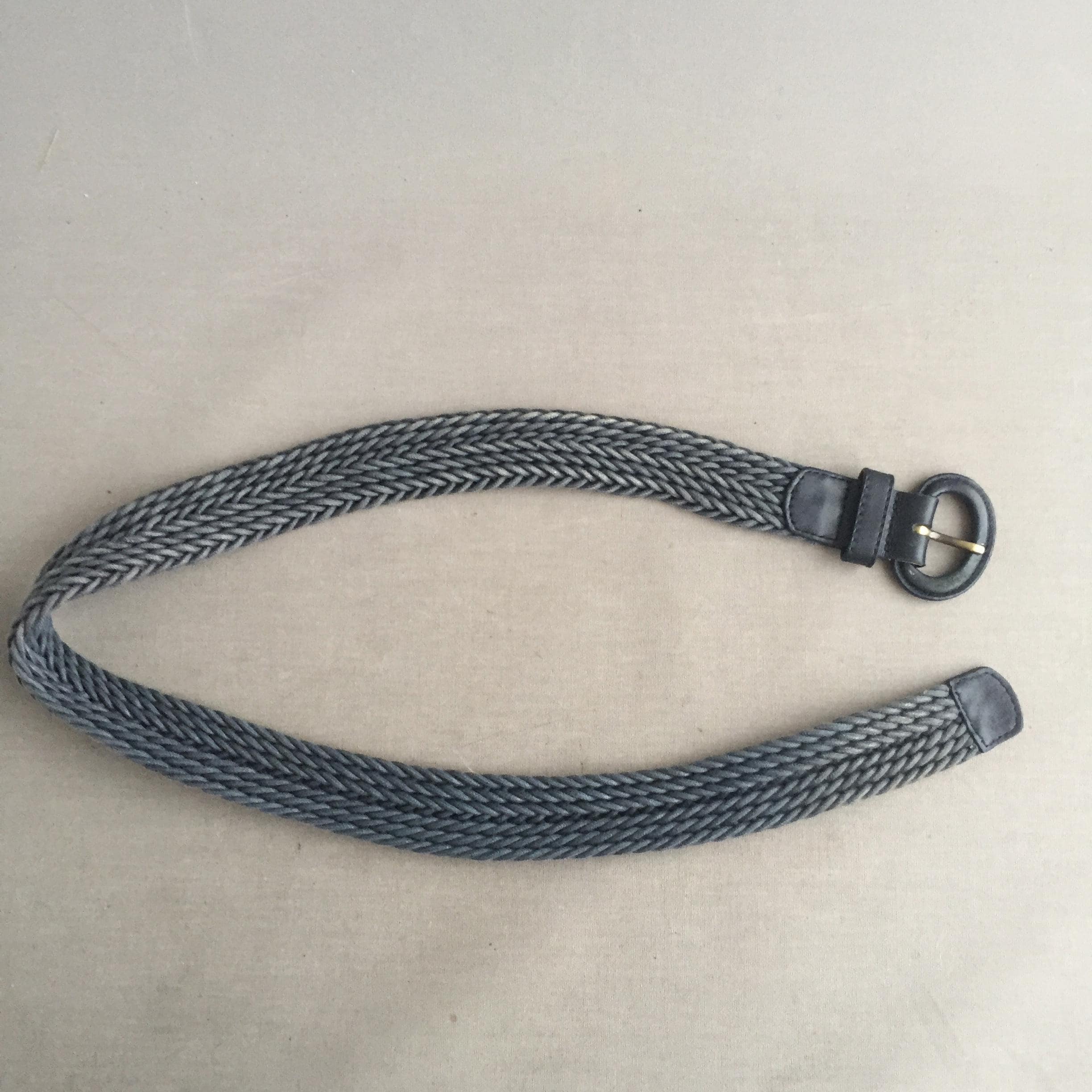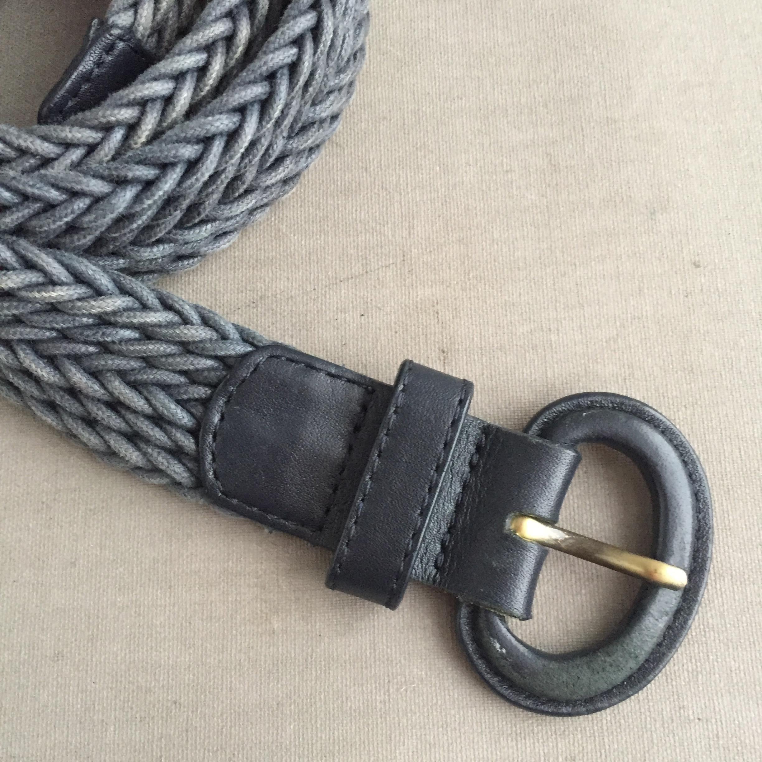 This is a faded blue woven braided cotton belt with blue leather end trims and buckle.