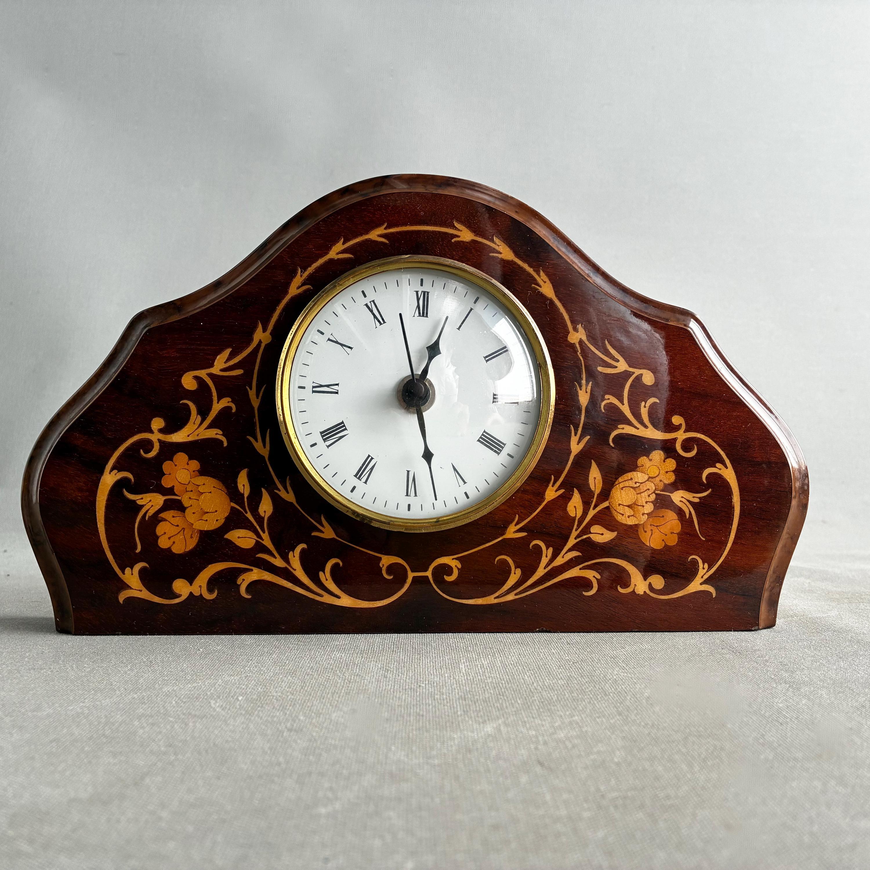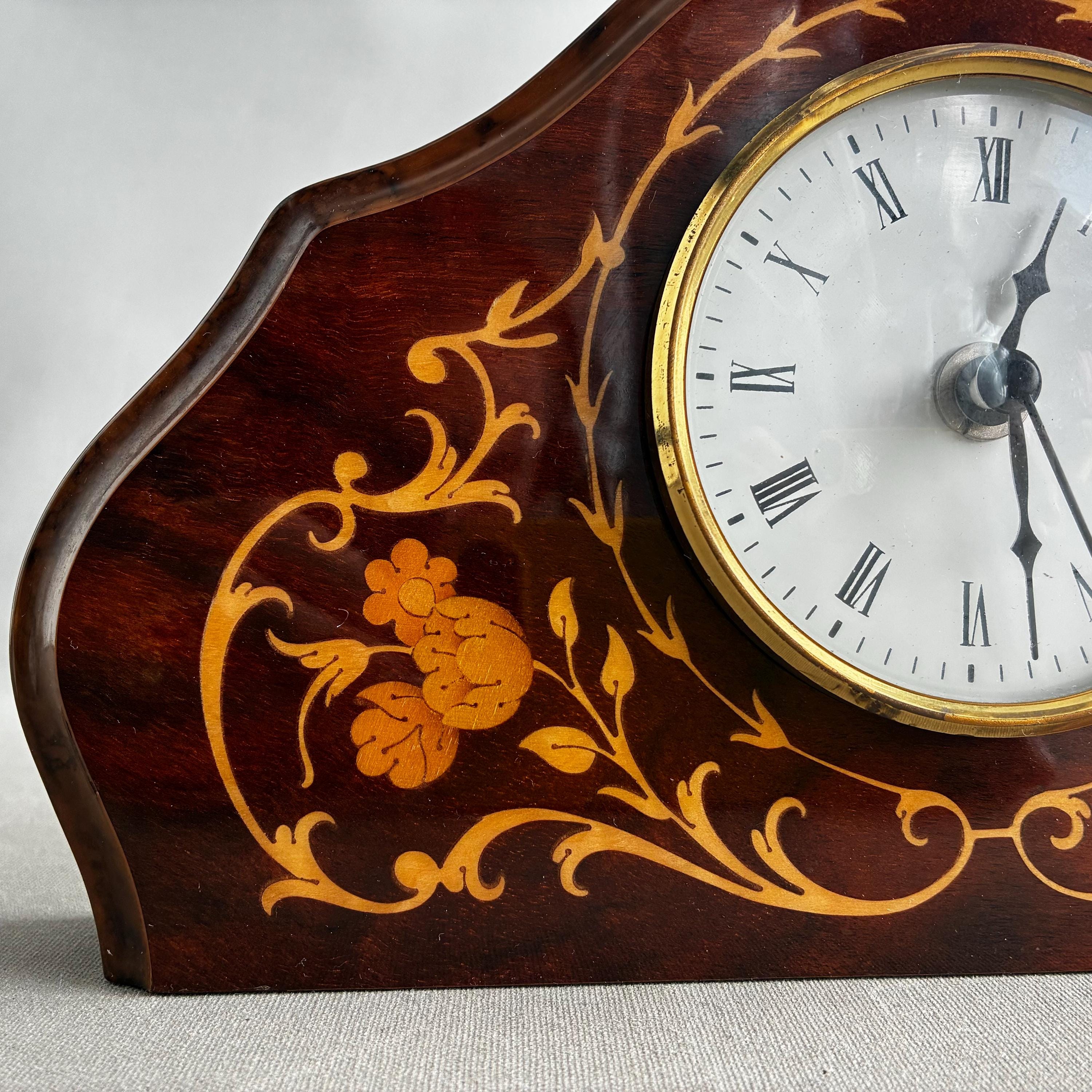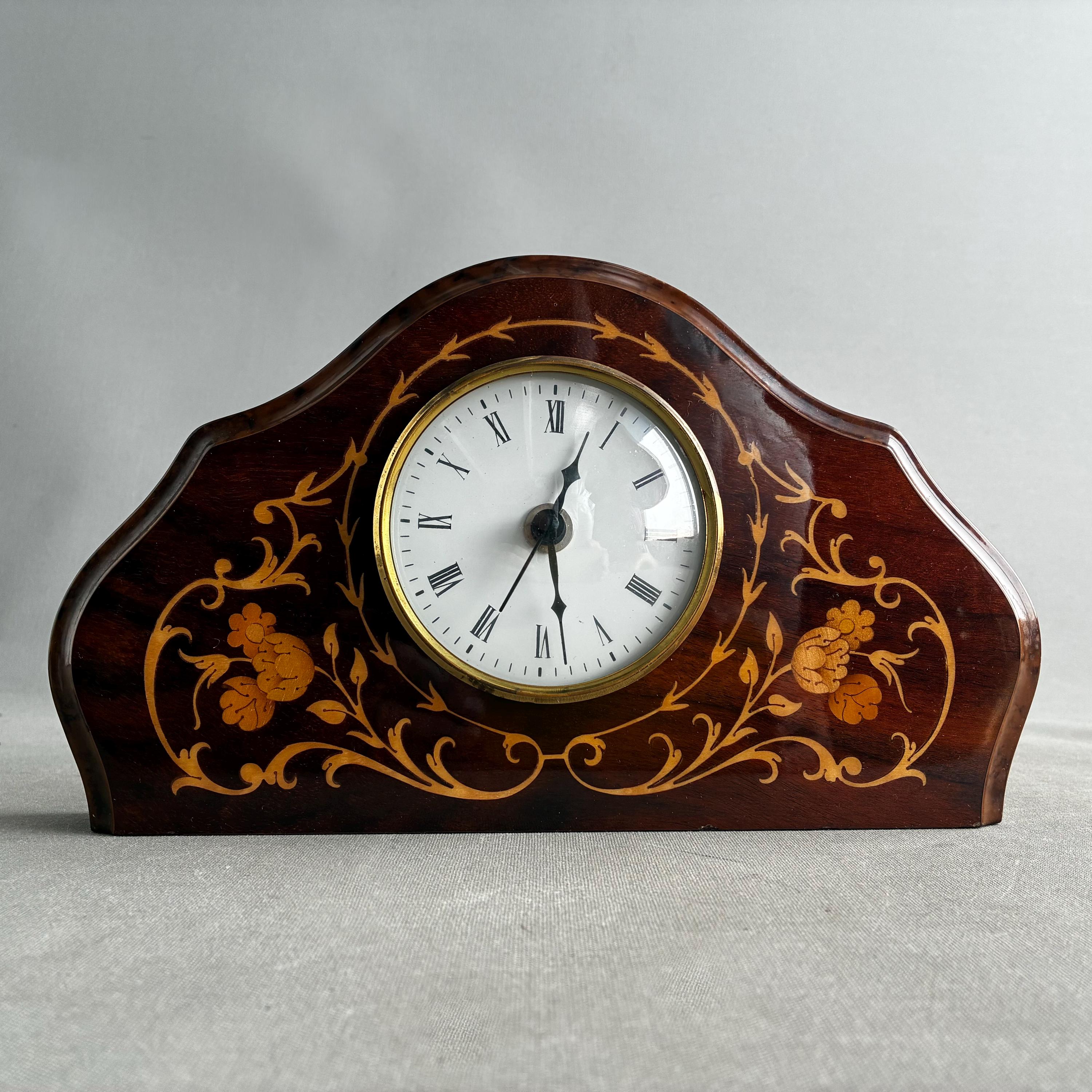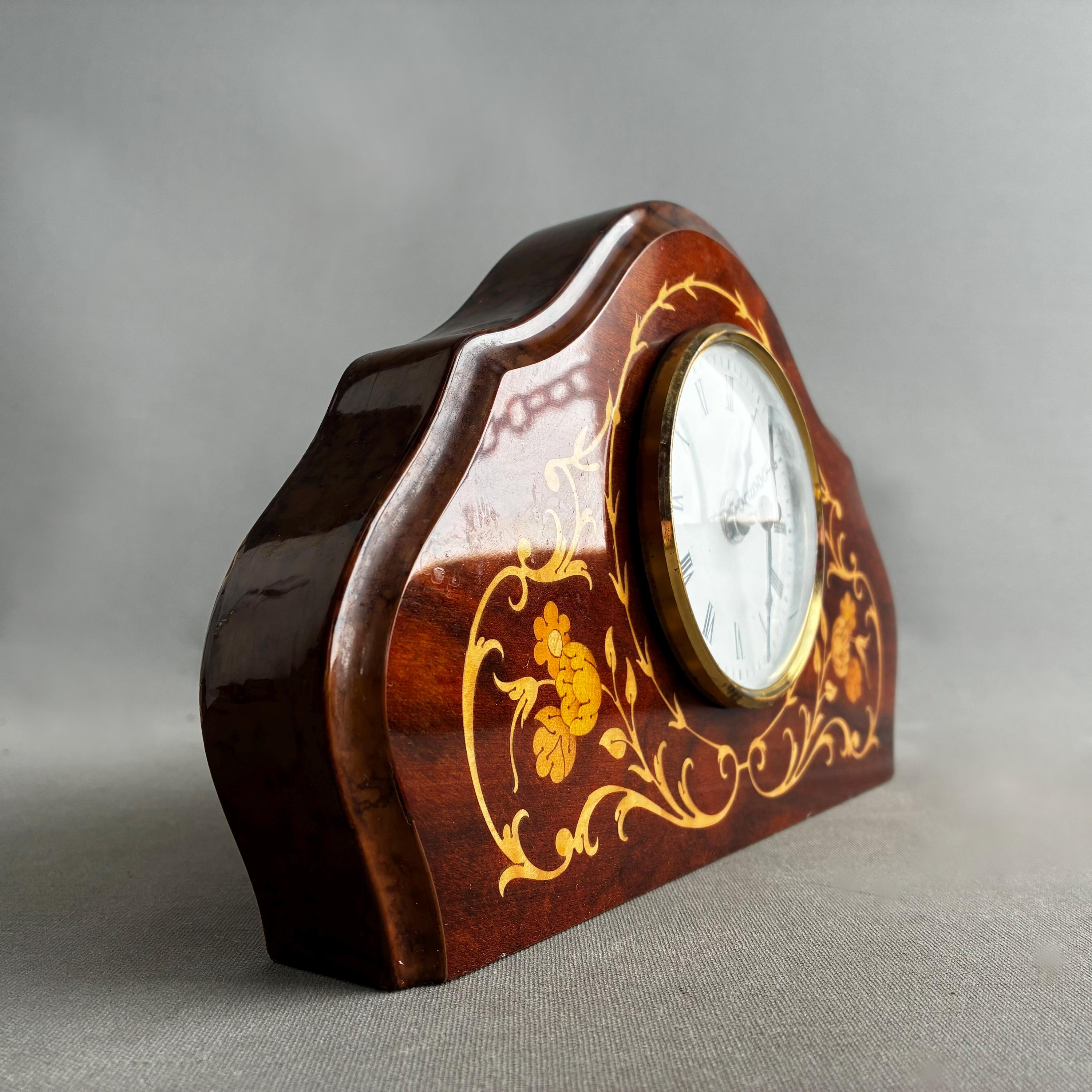A stunning antique solid mahogany mantle clock from the Edwardian era, adorned with intricate satinwood or floral inlay.Featuring white enamel dial with Roman numerals Made in Italy