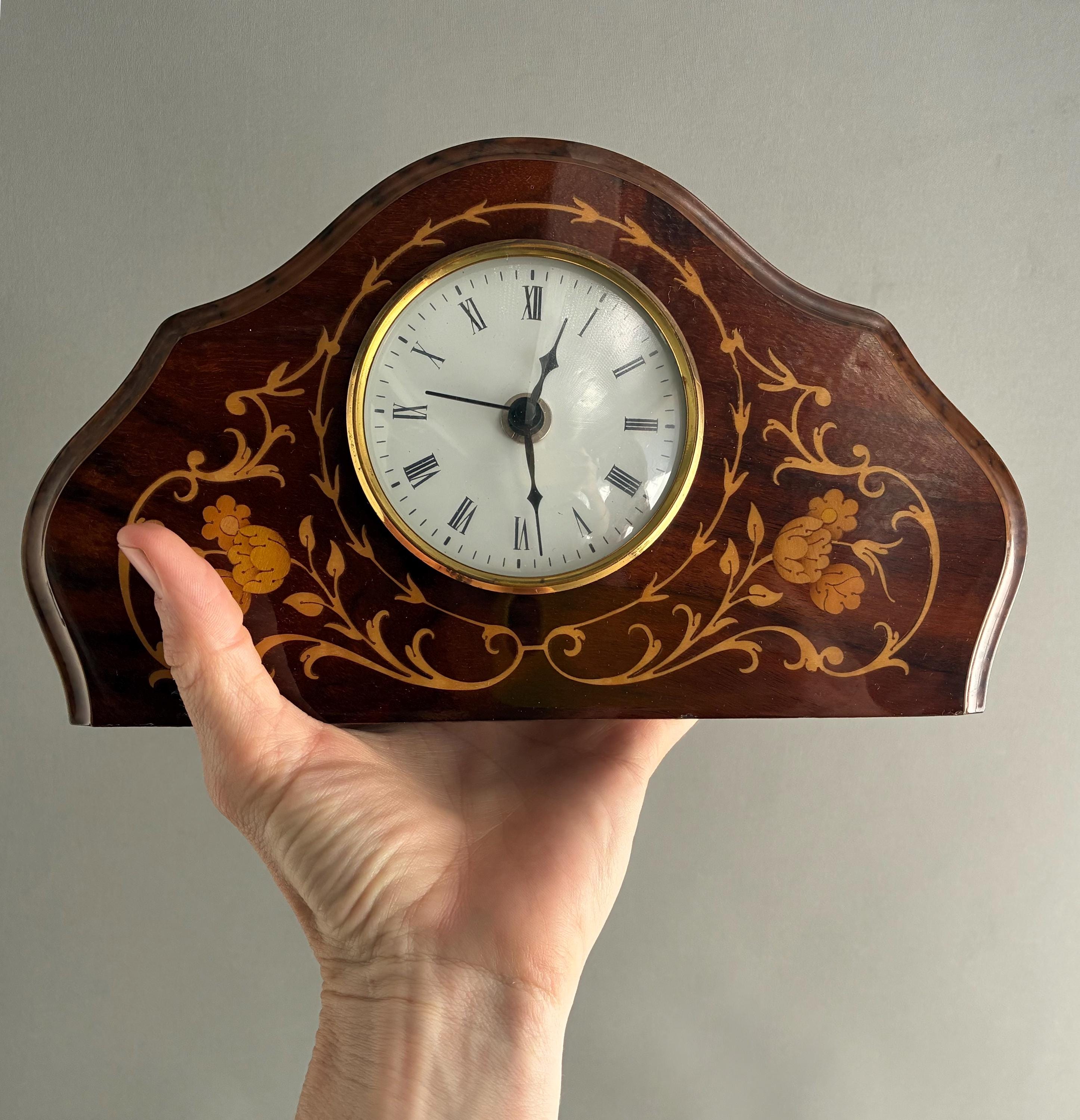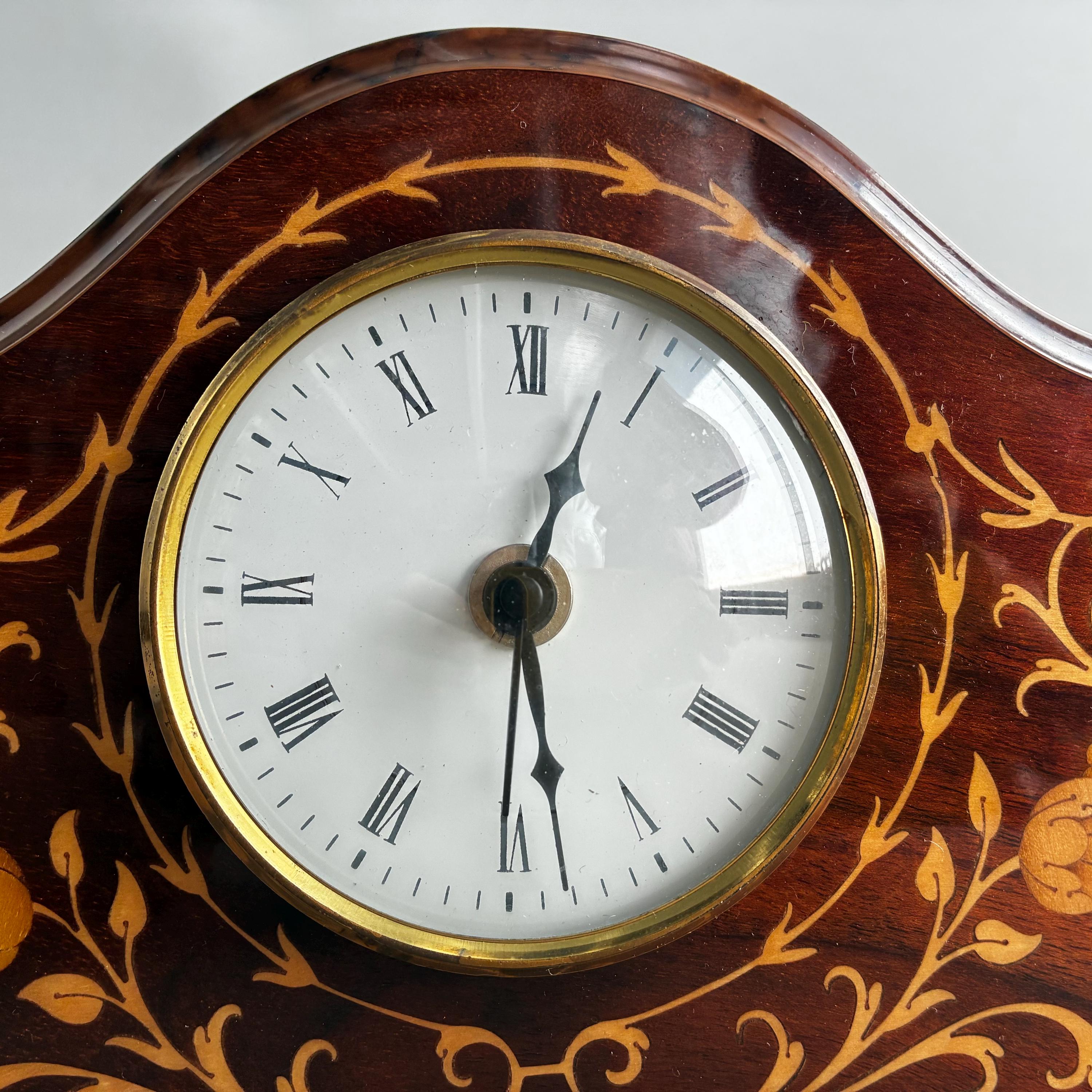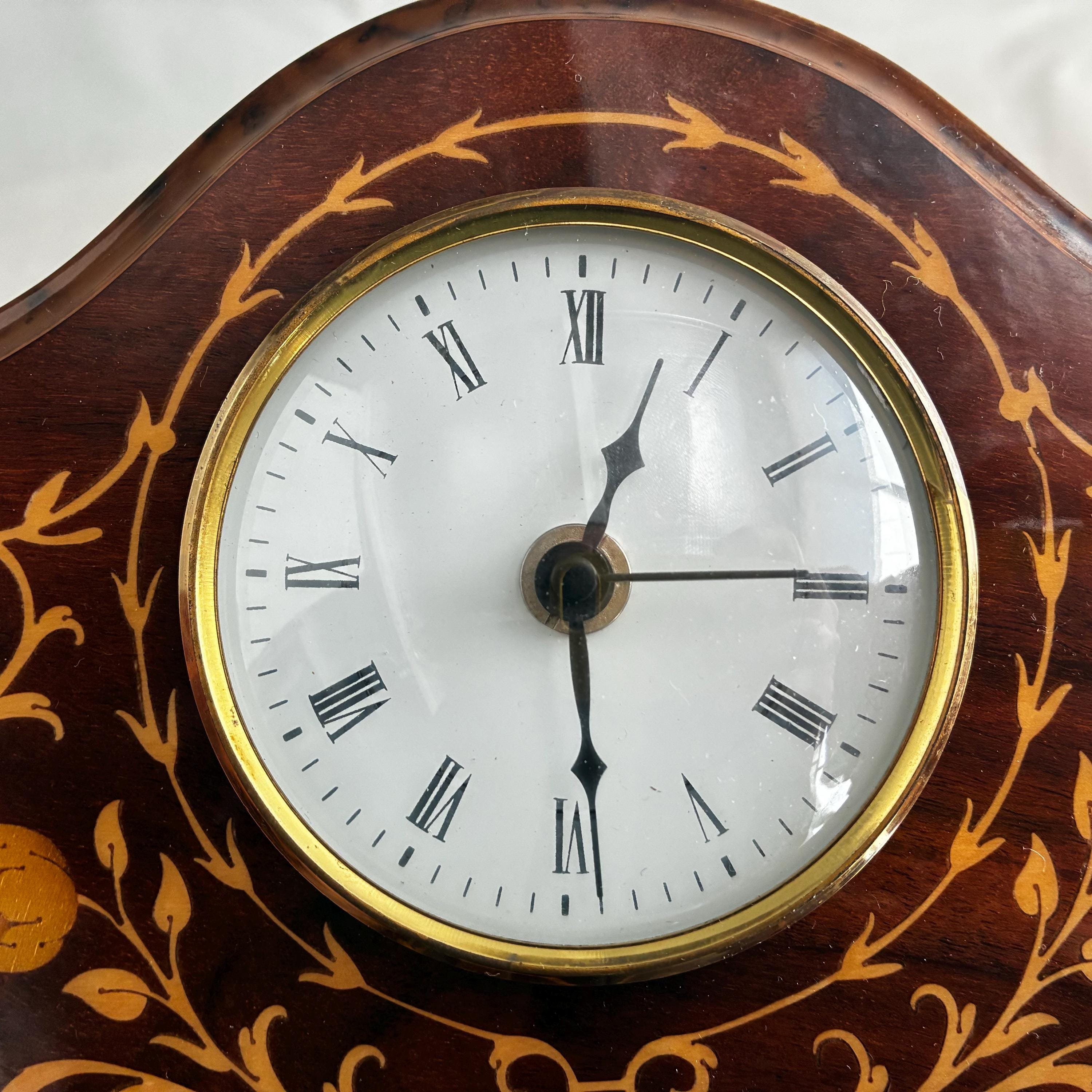 A stunning antique solid mahogany mantle clock from the Edwardian era, adorned with intricate satinwood or floral inlay.Featuring white enamel dial with Roman numerals Made in Italy