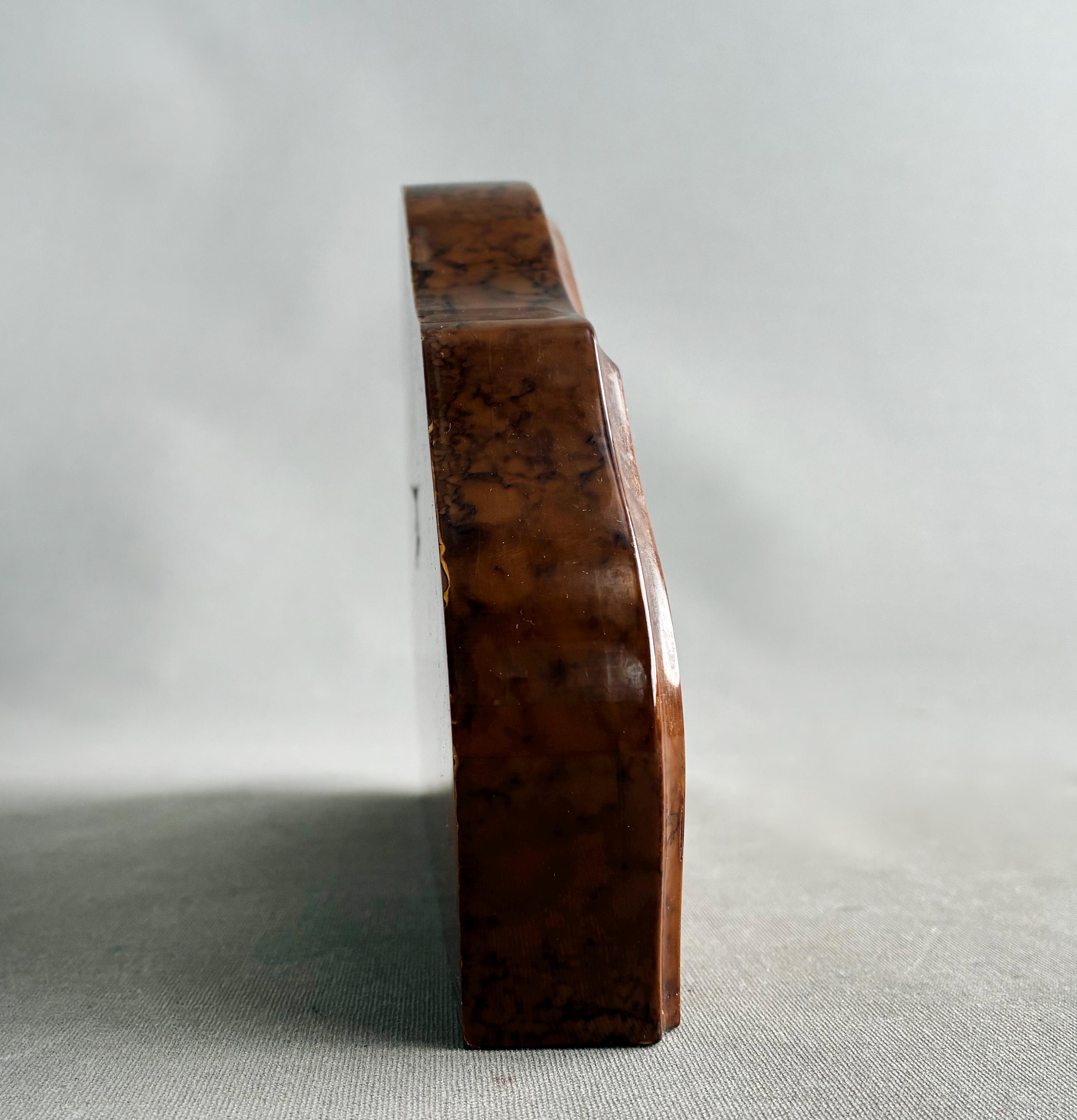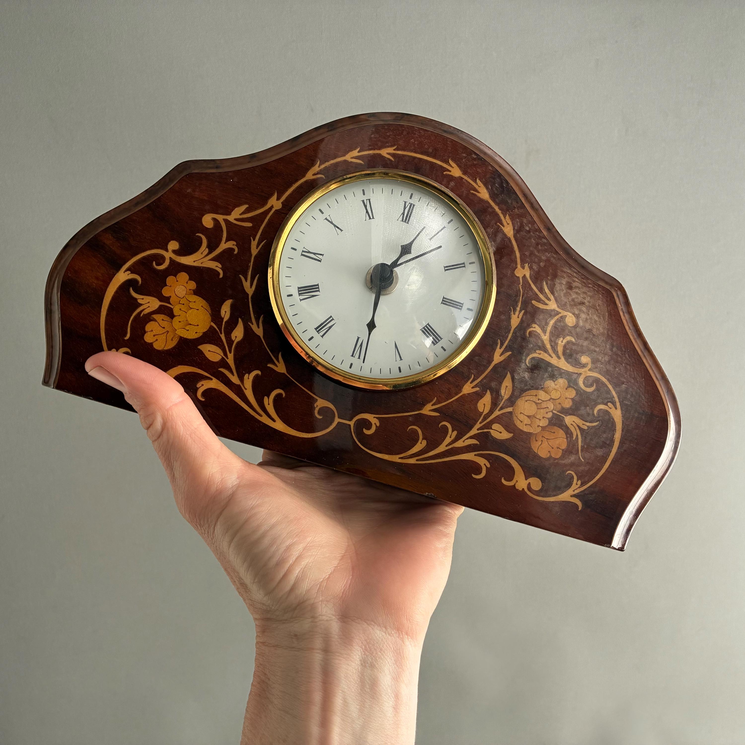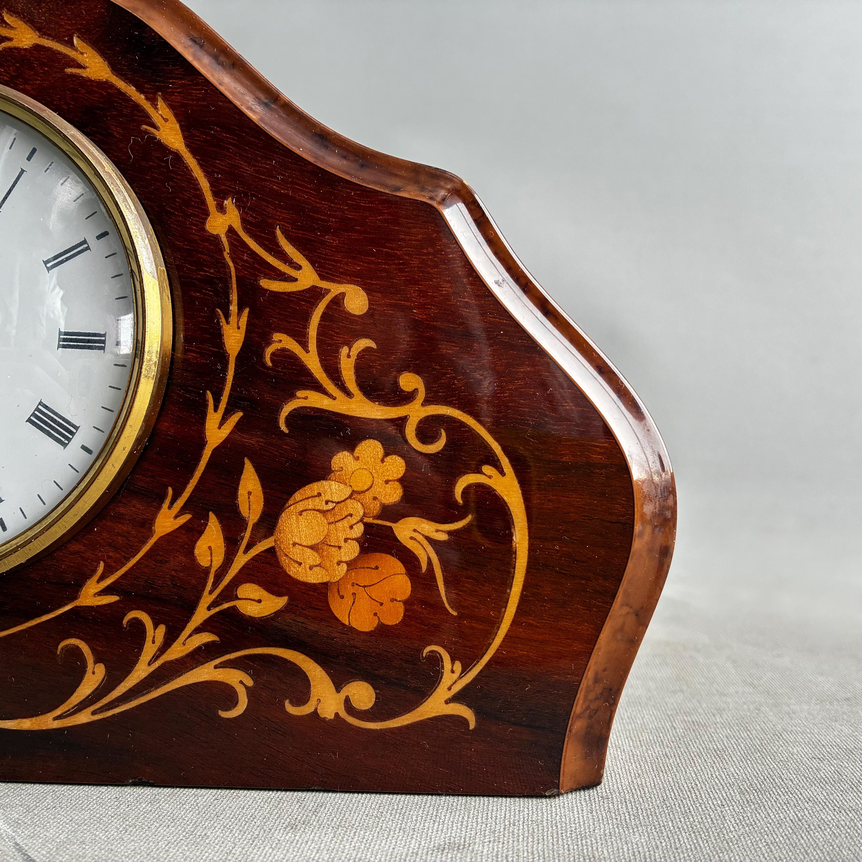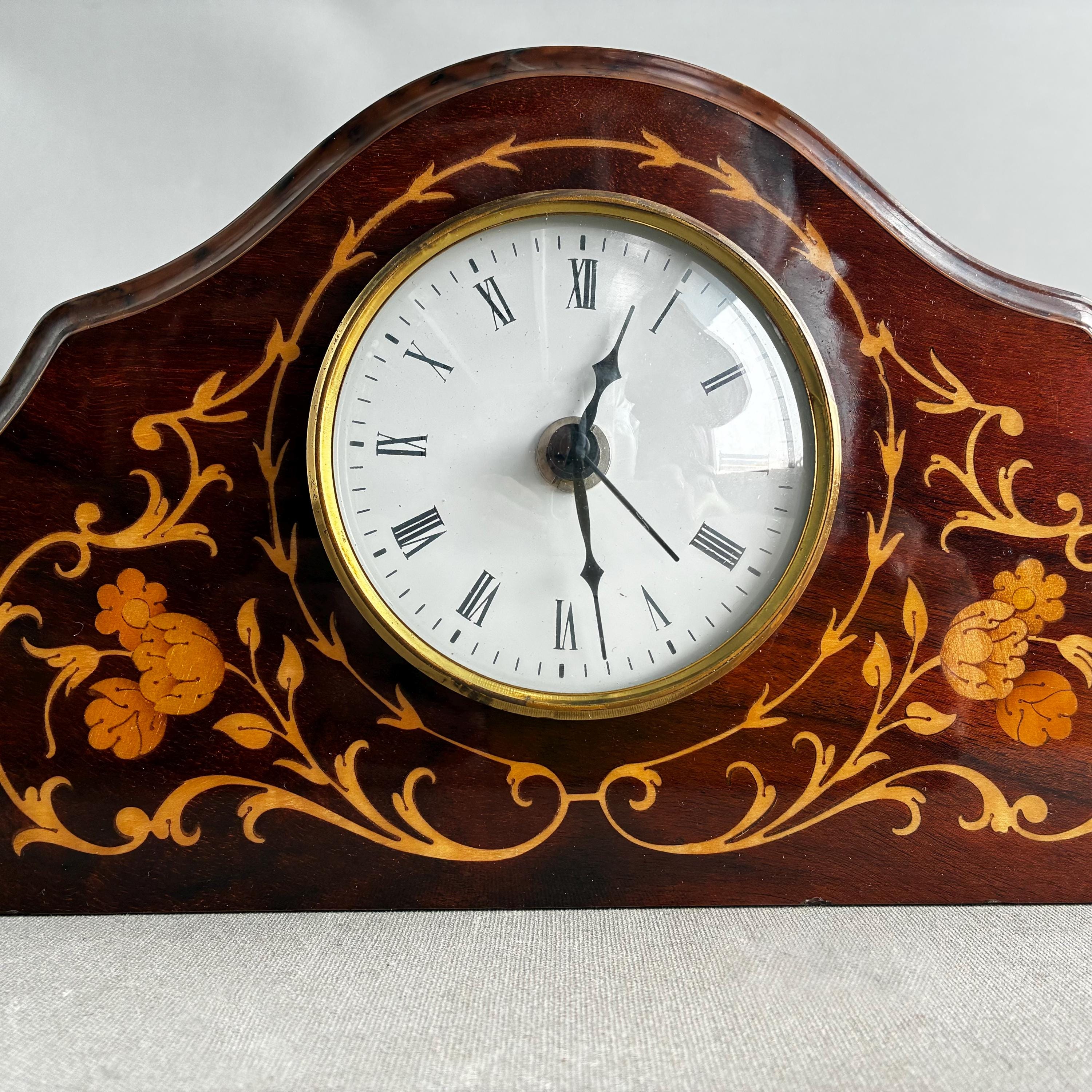 A stunning antique solid mahogany mantle clock from the Edwardian era, adorned with intricate satinwood or floral inlay.Featuring white enamel dial with Roman numerals Made in Italy
