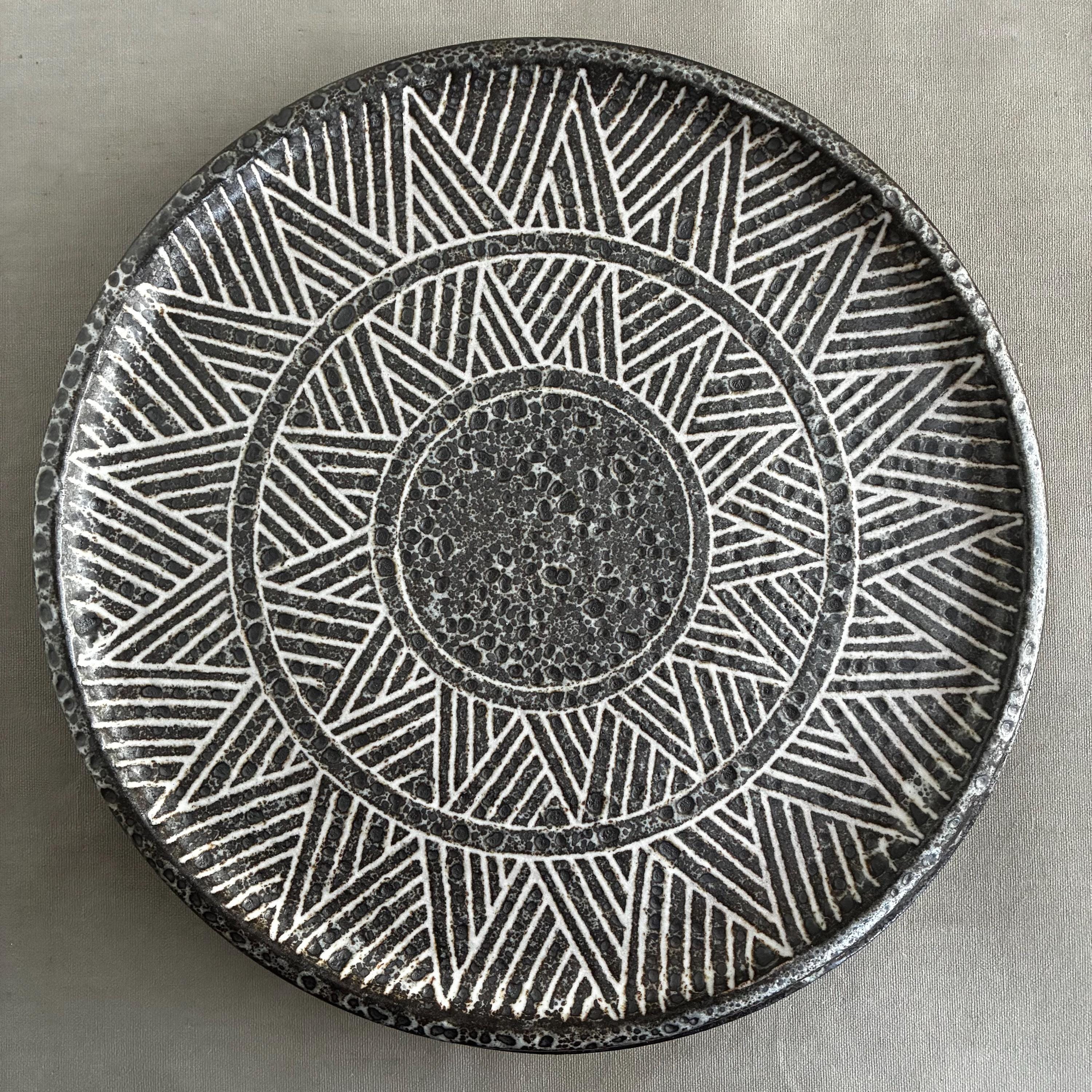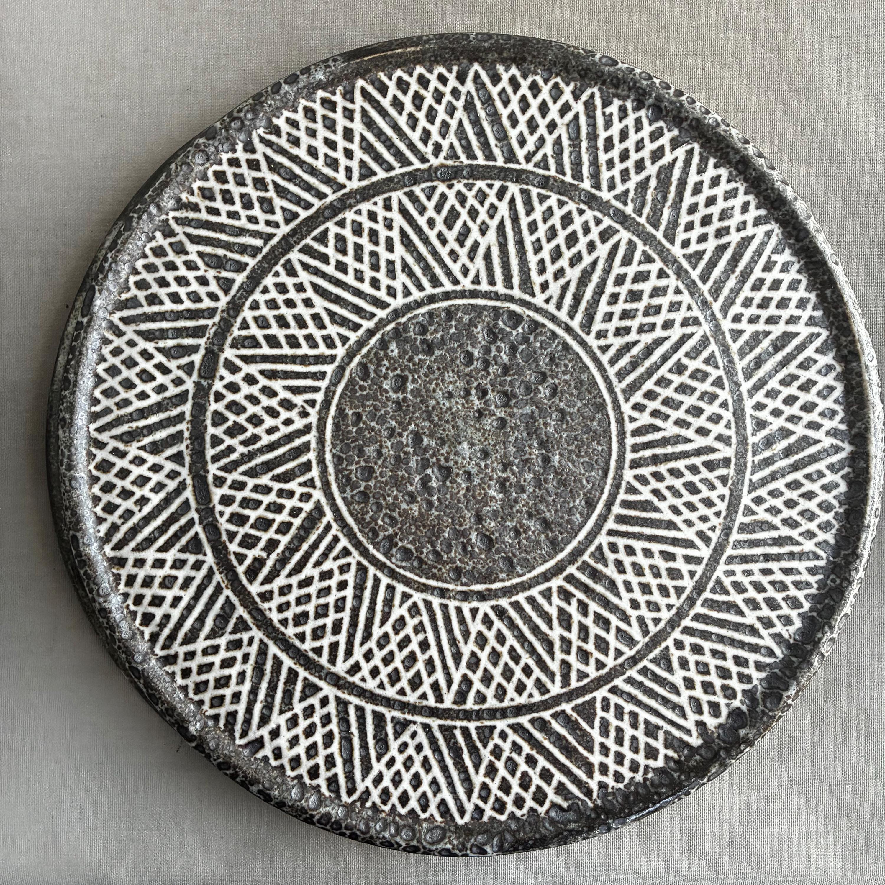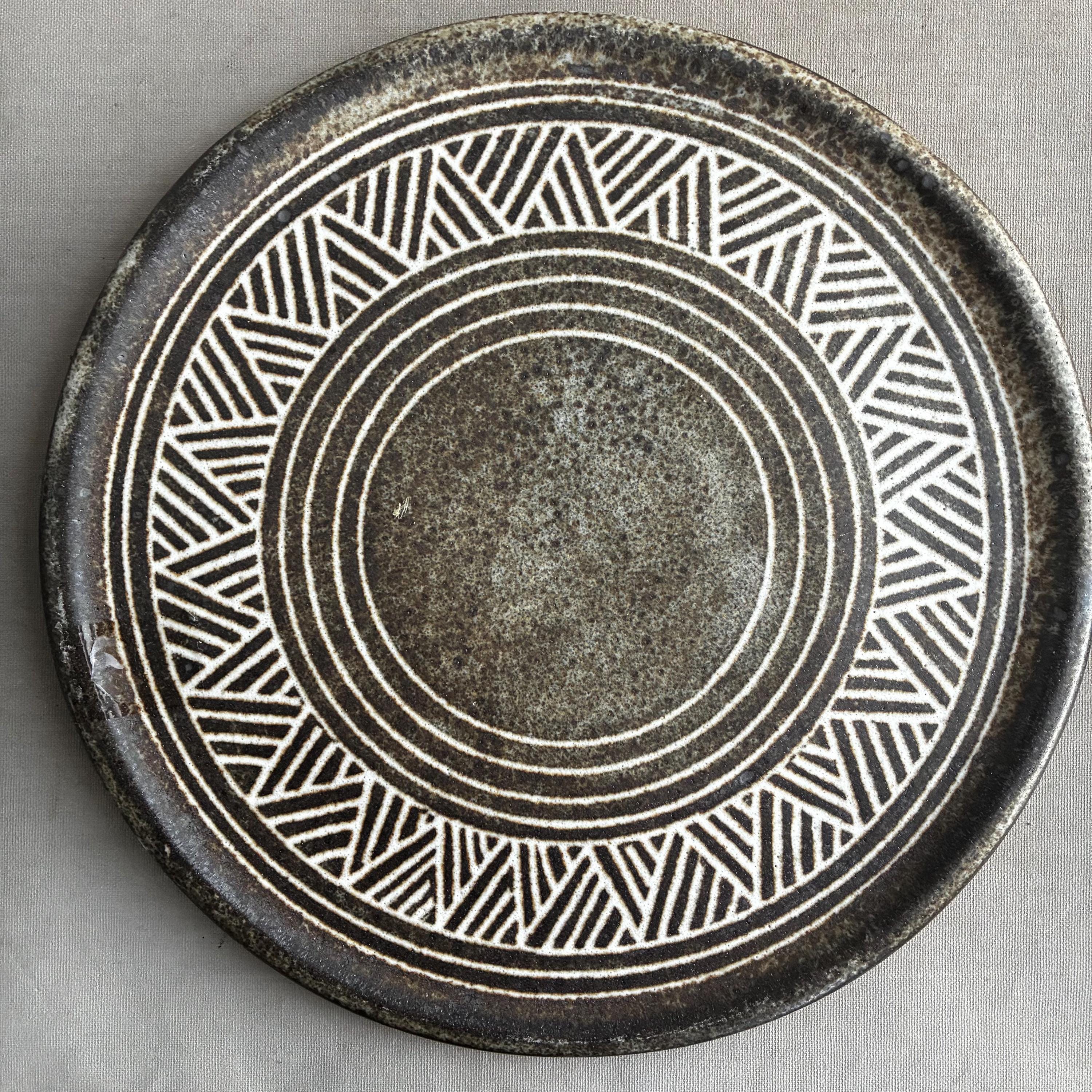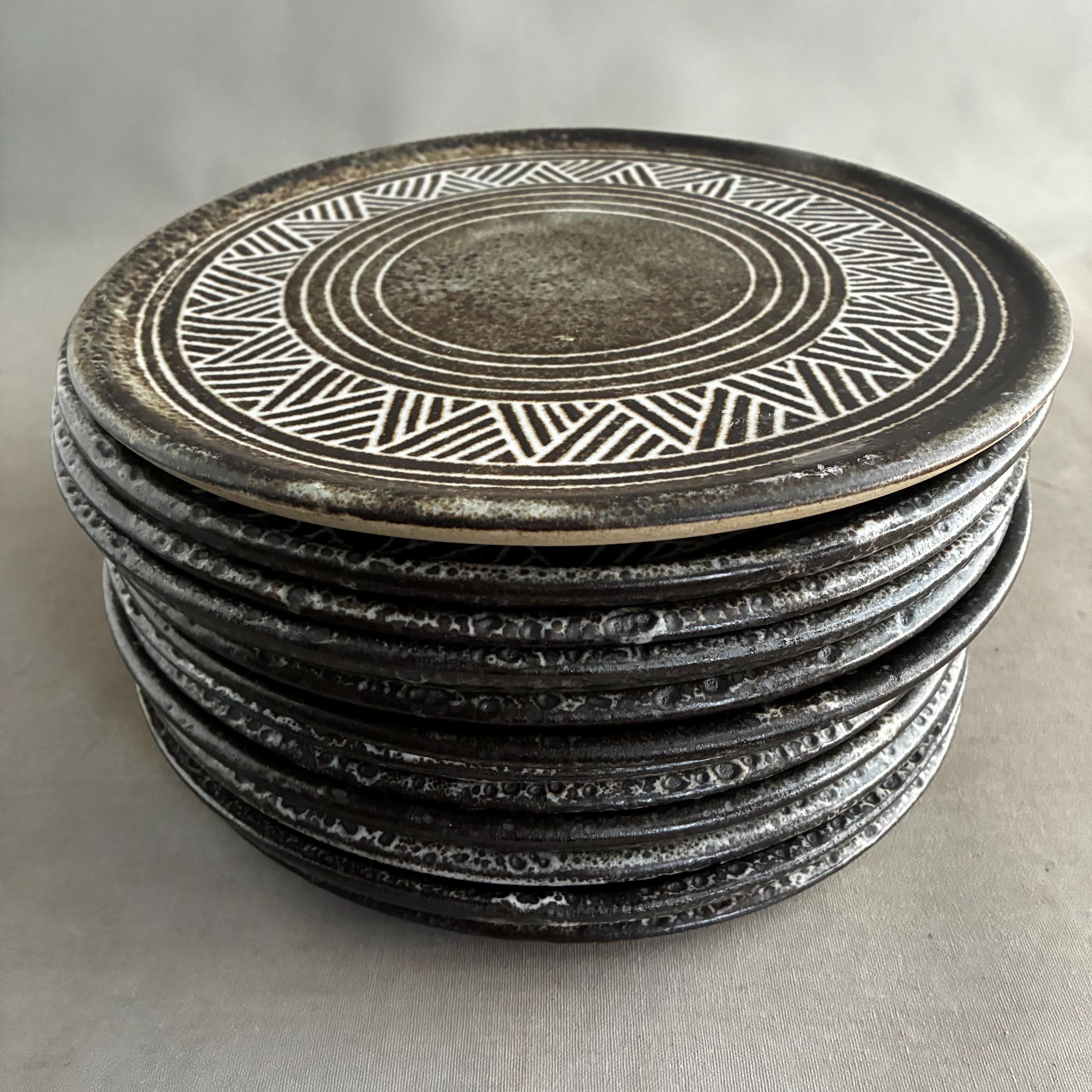 A beautiful set of Hand made studio pottery dinner plates . With a decorative sgraffito glaze technique finish. handmade so each plate truly unique . Set of 12 in various designs sold as a set . There is also a set of side plates Listed. Heavy parcel so hefty postage fee. viewings and collection welcome at our north London workshop