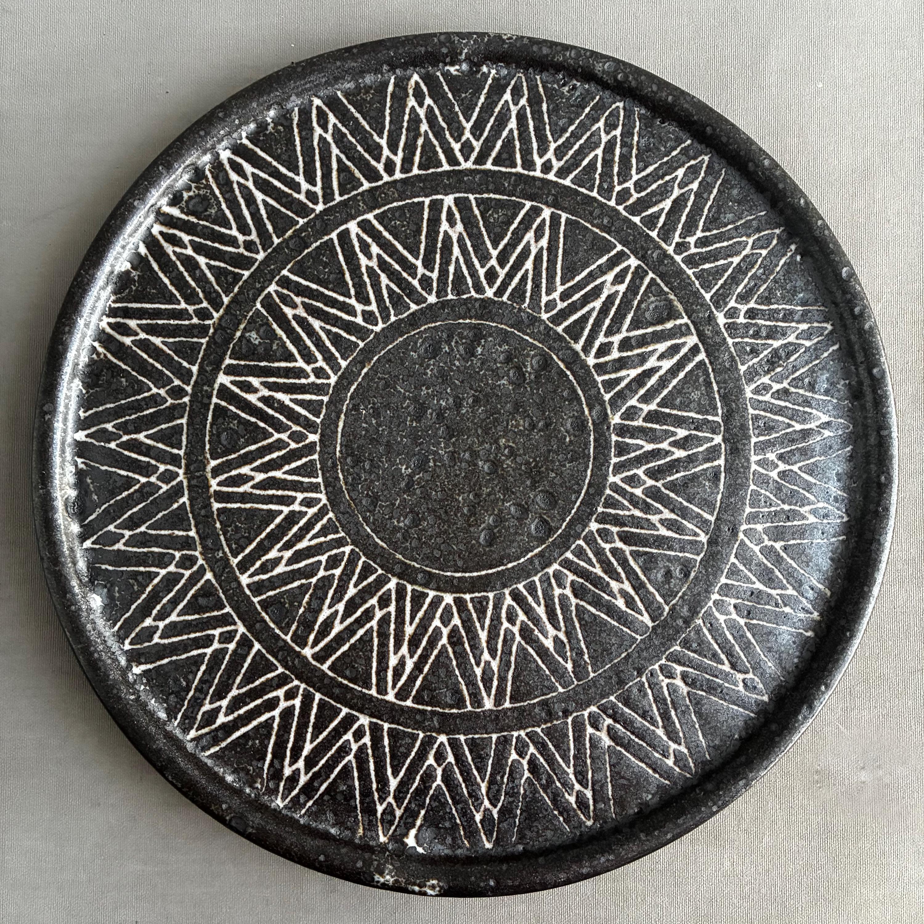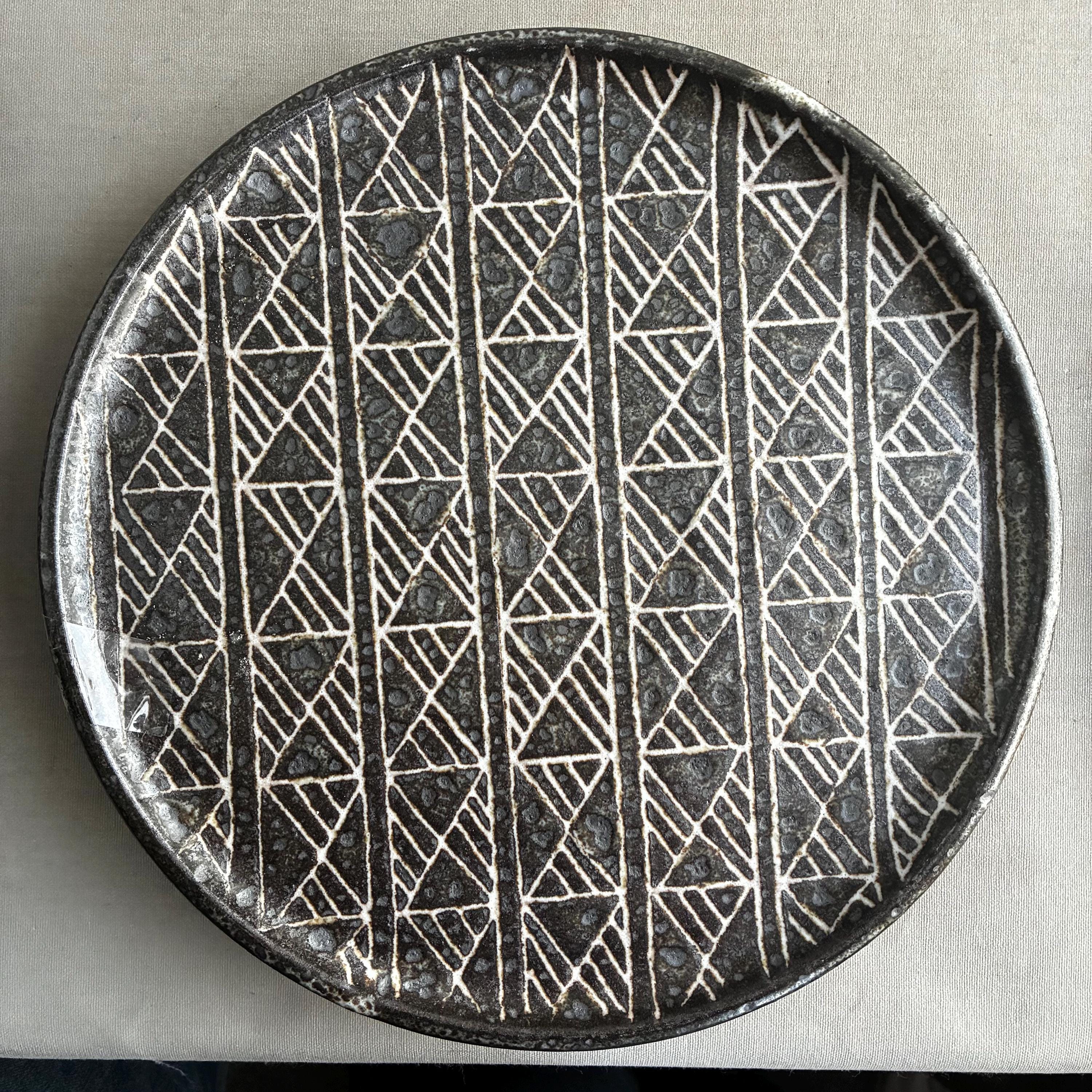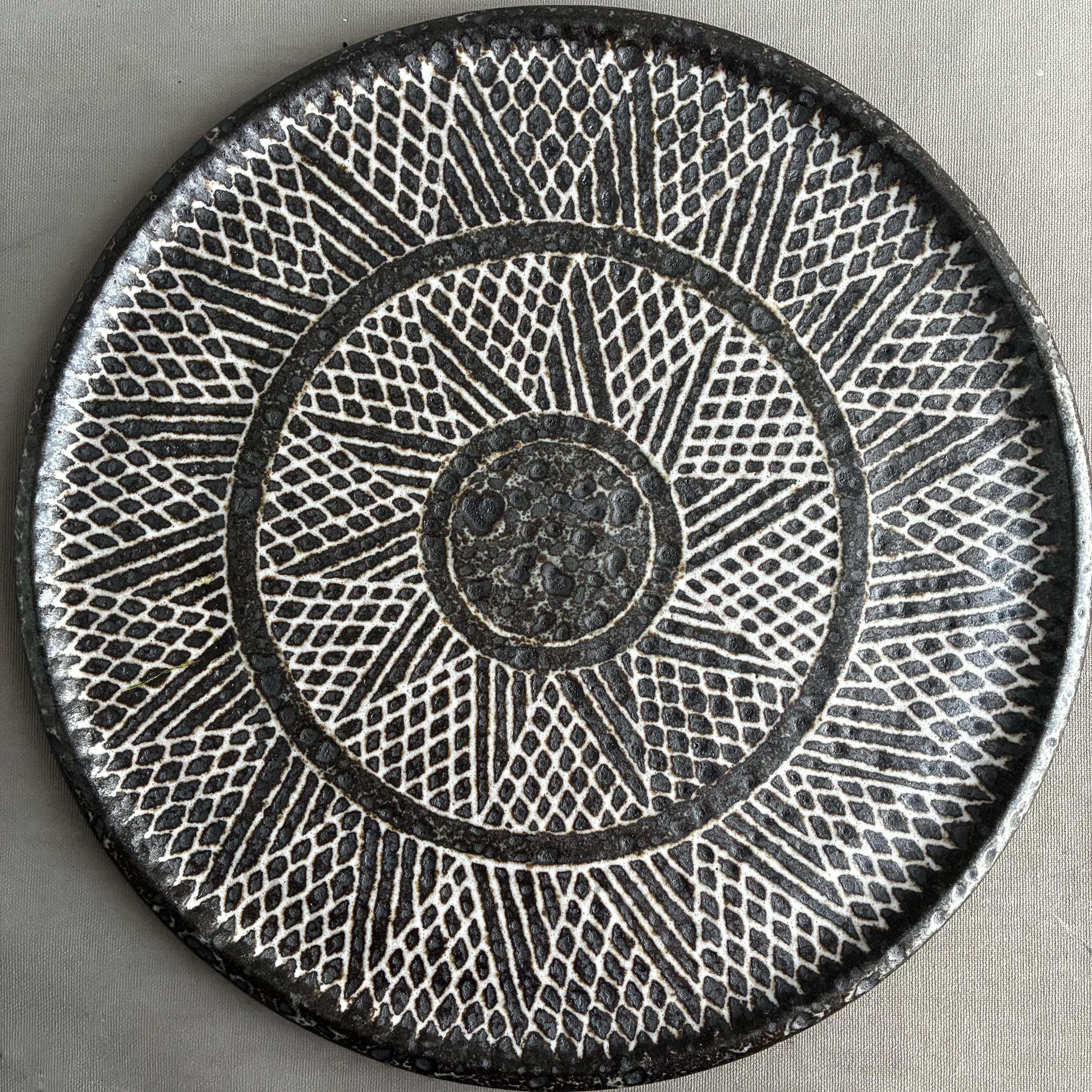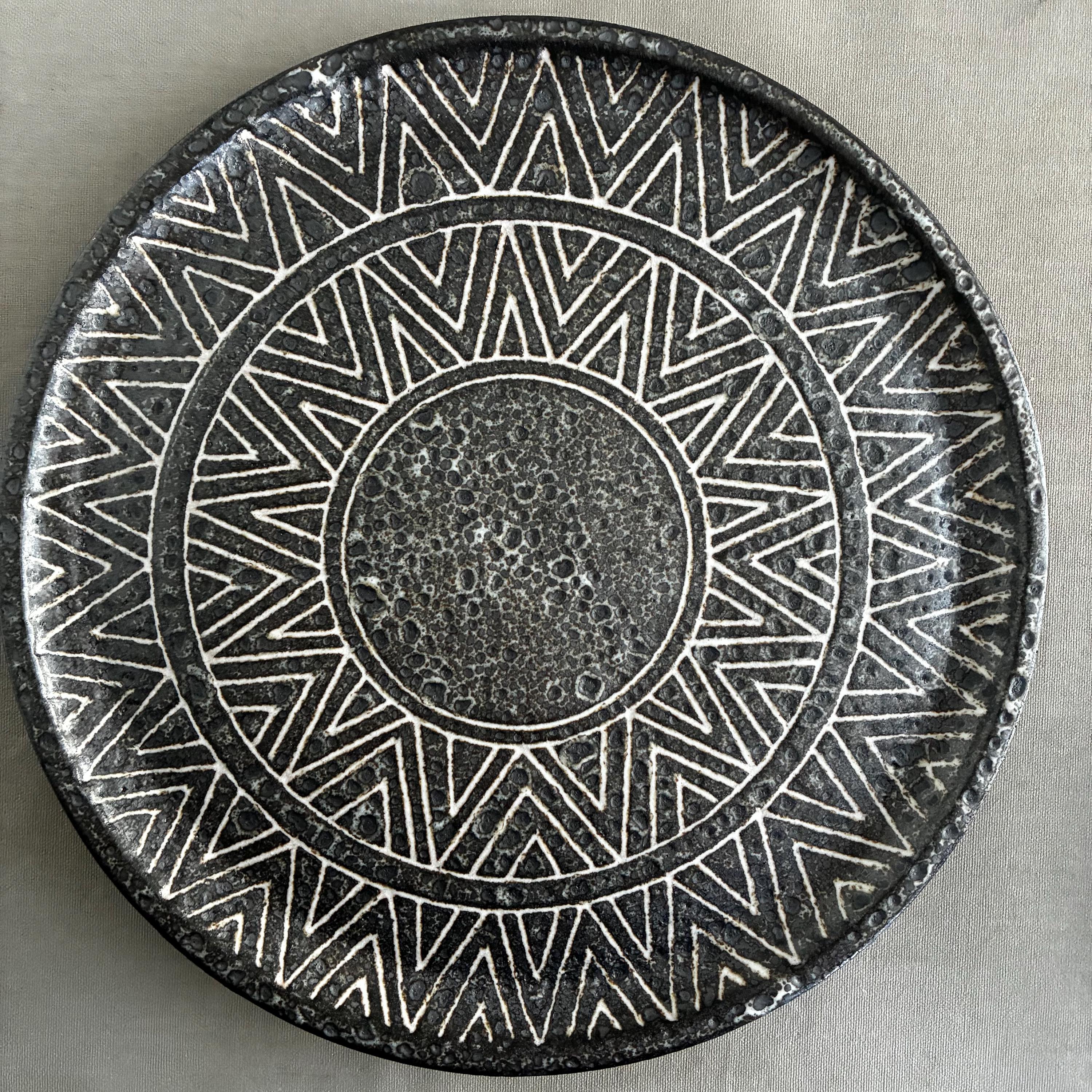 A beautiful set of Hand made studio pottery dinner plates . With a decorative sgraffito glaze technique finish. handmade so each plate truly unique . Set of 12 in various designs sold as a set . There is also a set of side plates Listed. Heavy parcel so hefty postage fee. viewings and collection welcome at our north London workshop