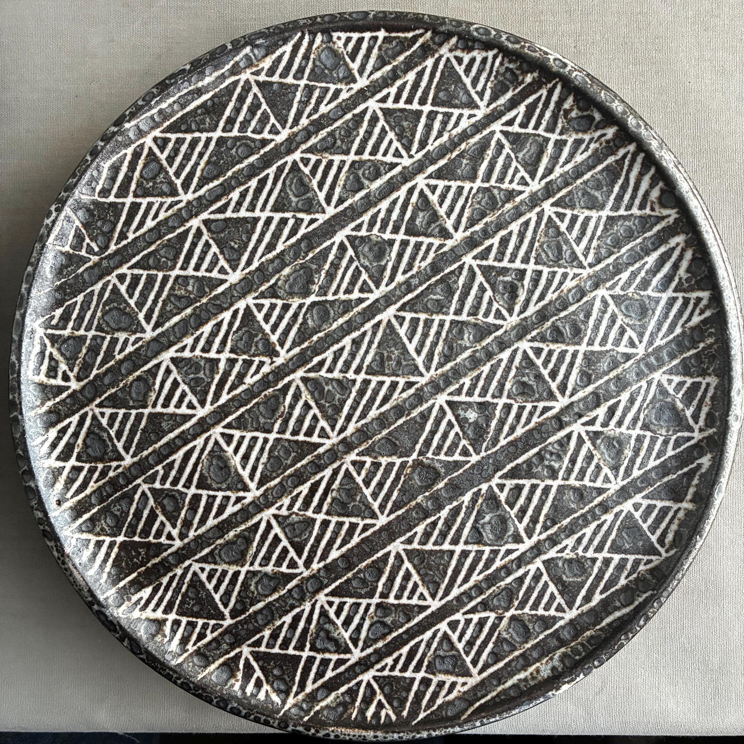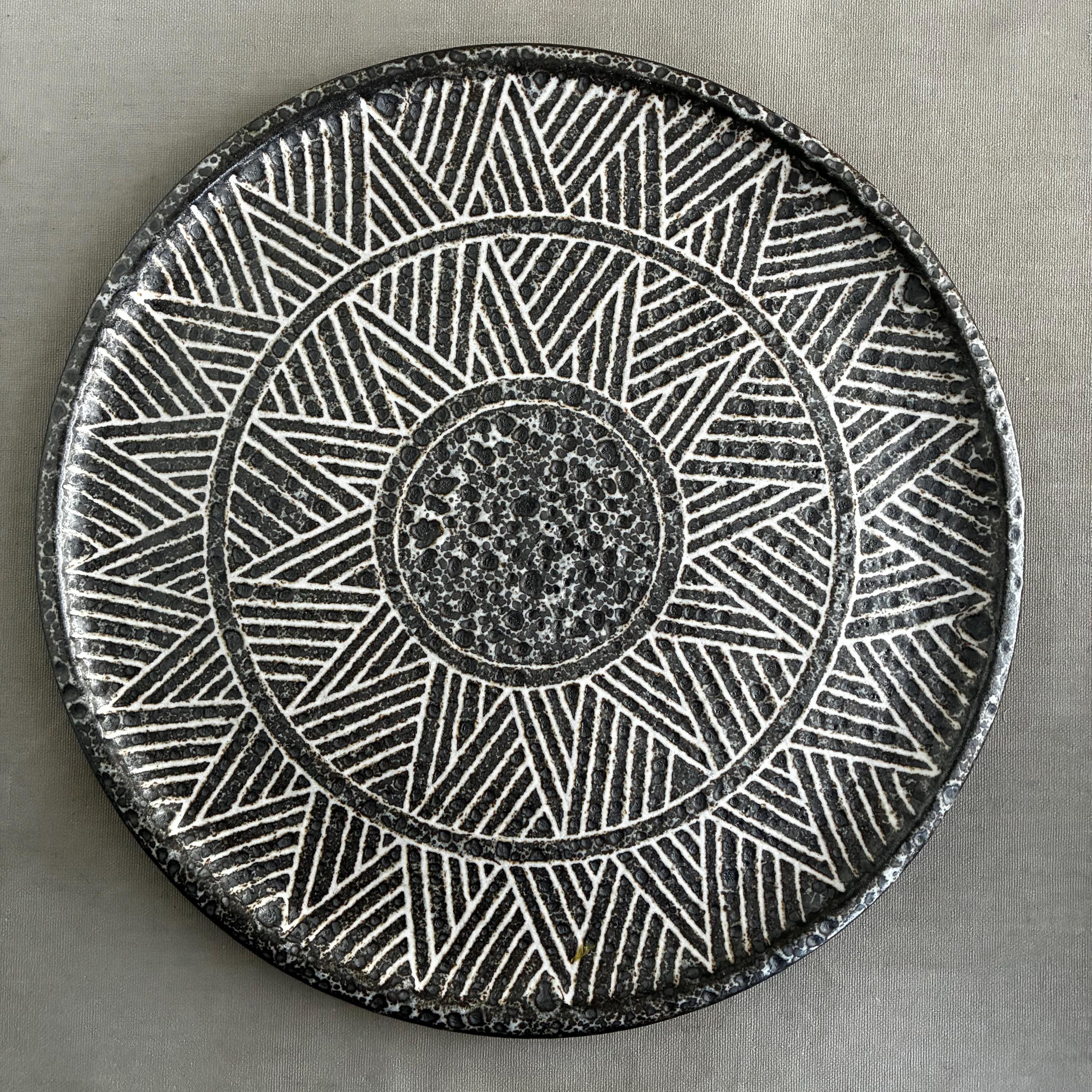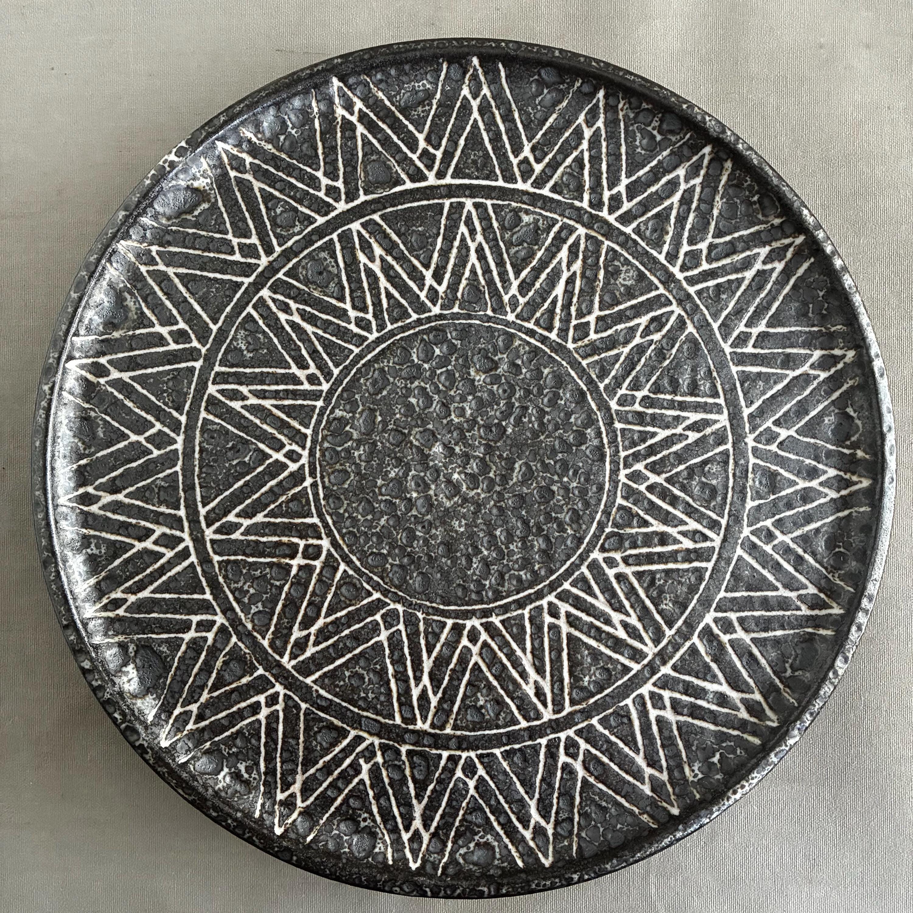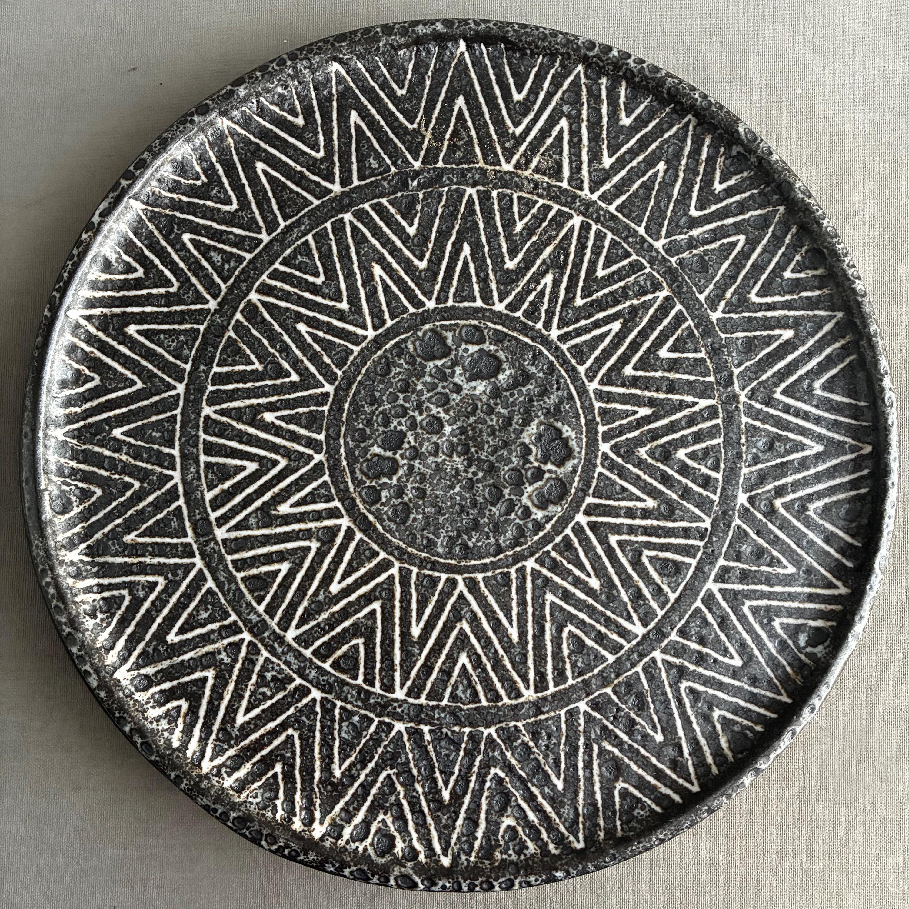 A beautiful set of Hand made studio pottery dinner plates . With a decorative sgraffito glaze technique finish. handmade so each plate truly unique . Set of 12 in various designs sold as a set . There is also a set of side plates Listed. Heavy parcel so hefty postage fee. viewings and collection welcome at our north London workshop