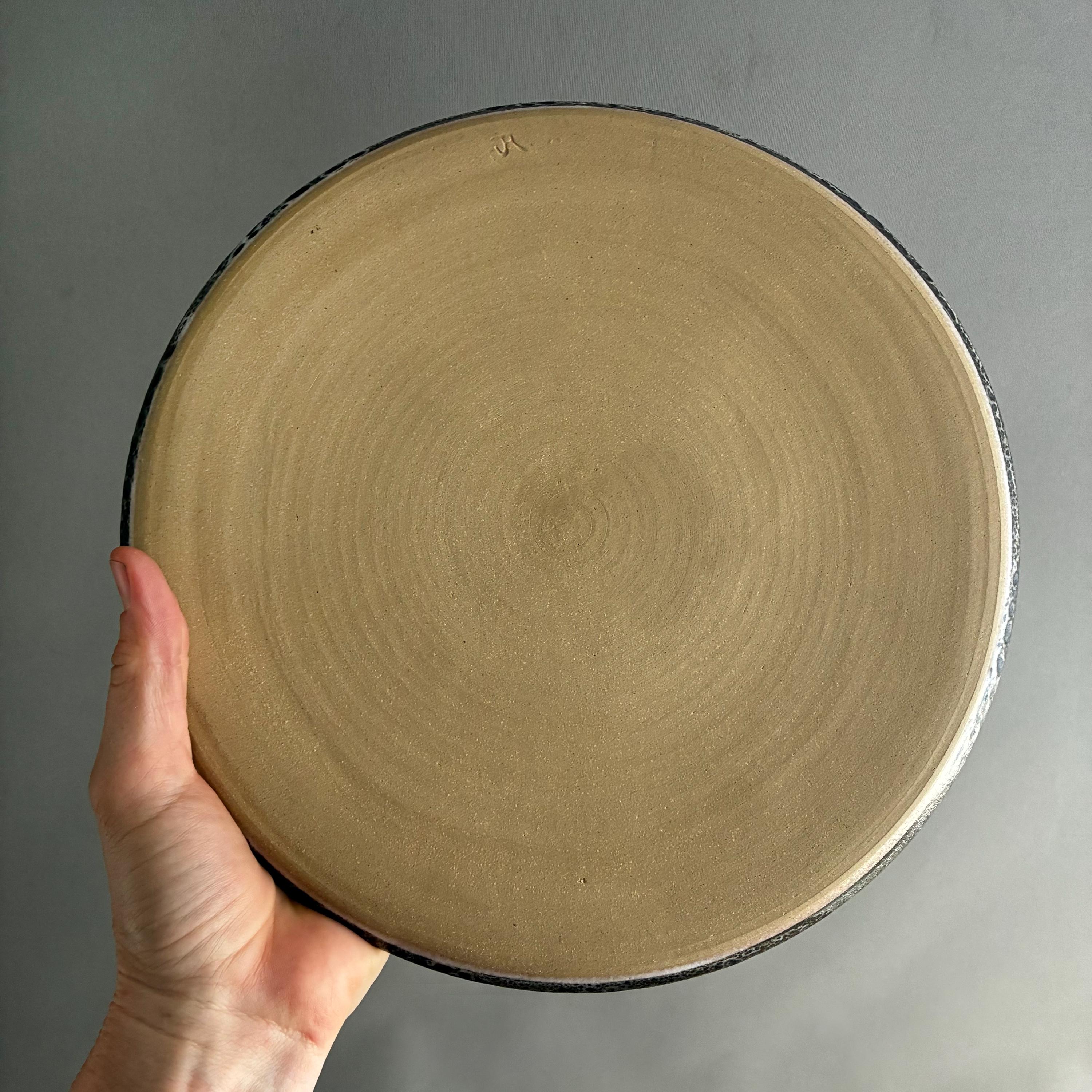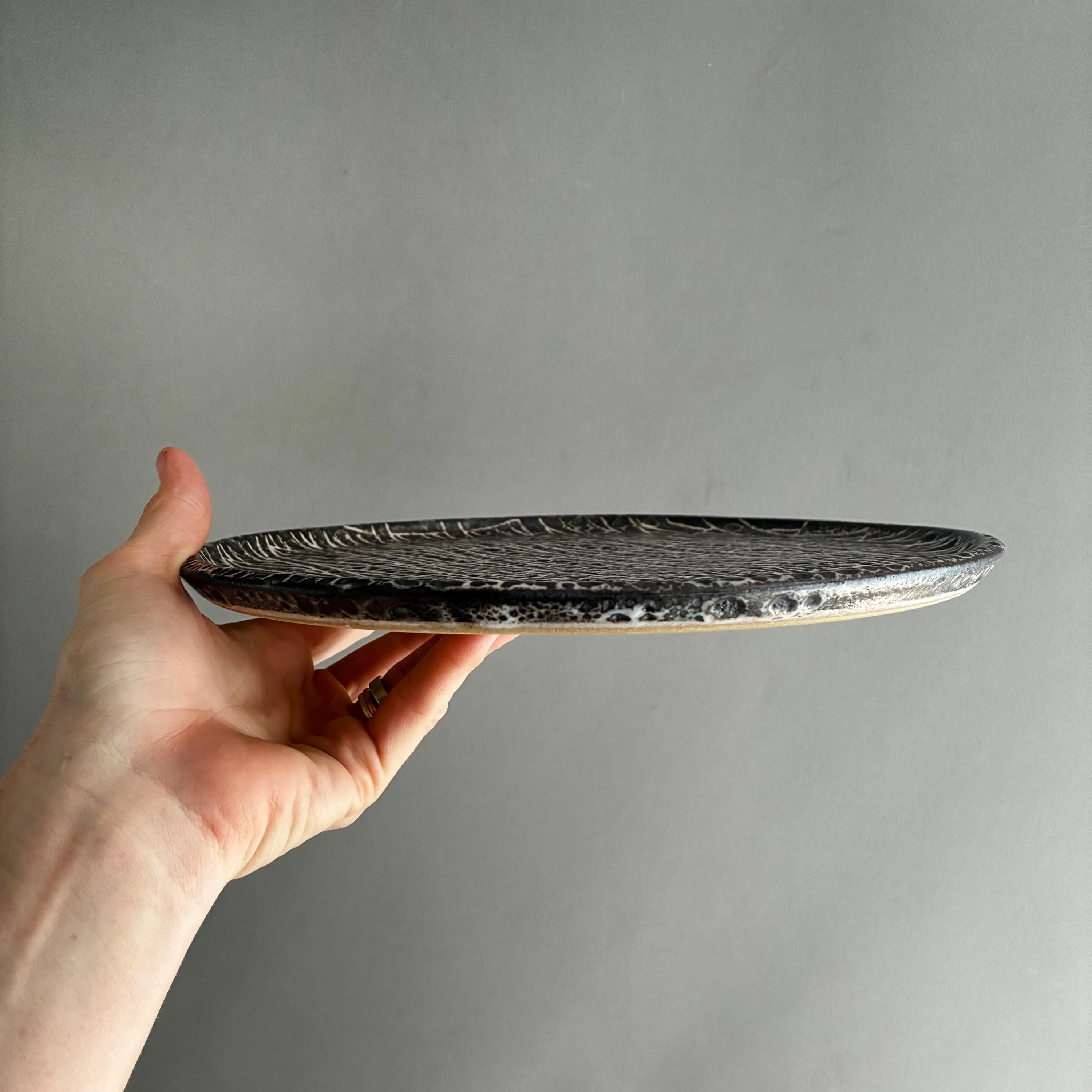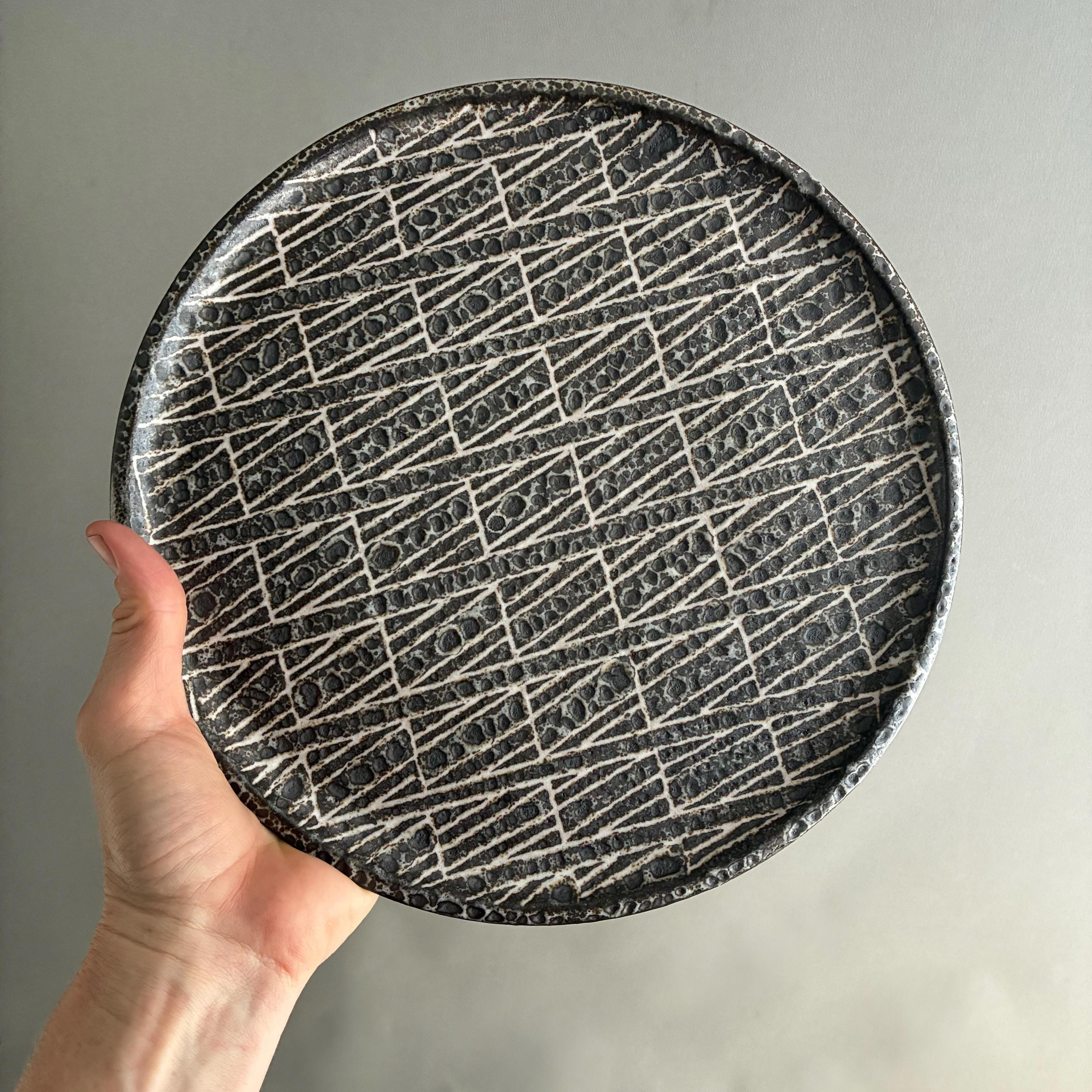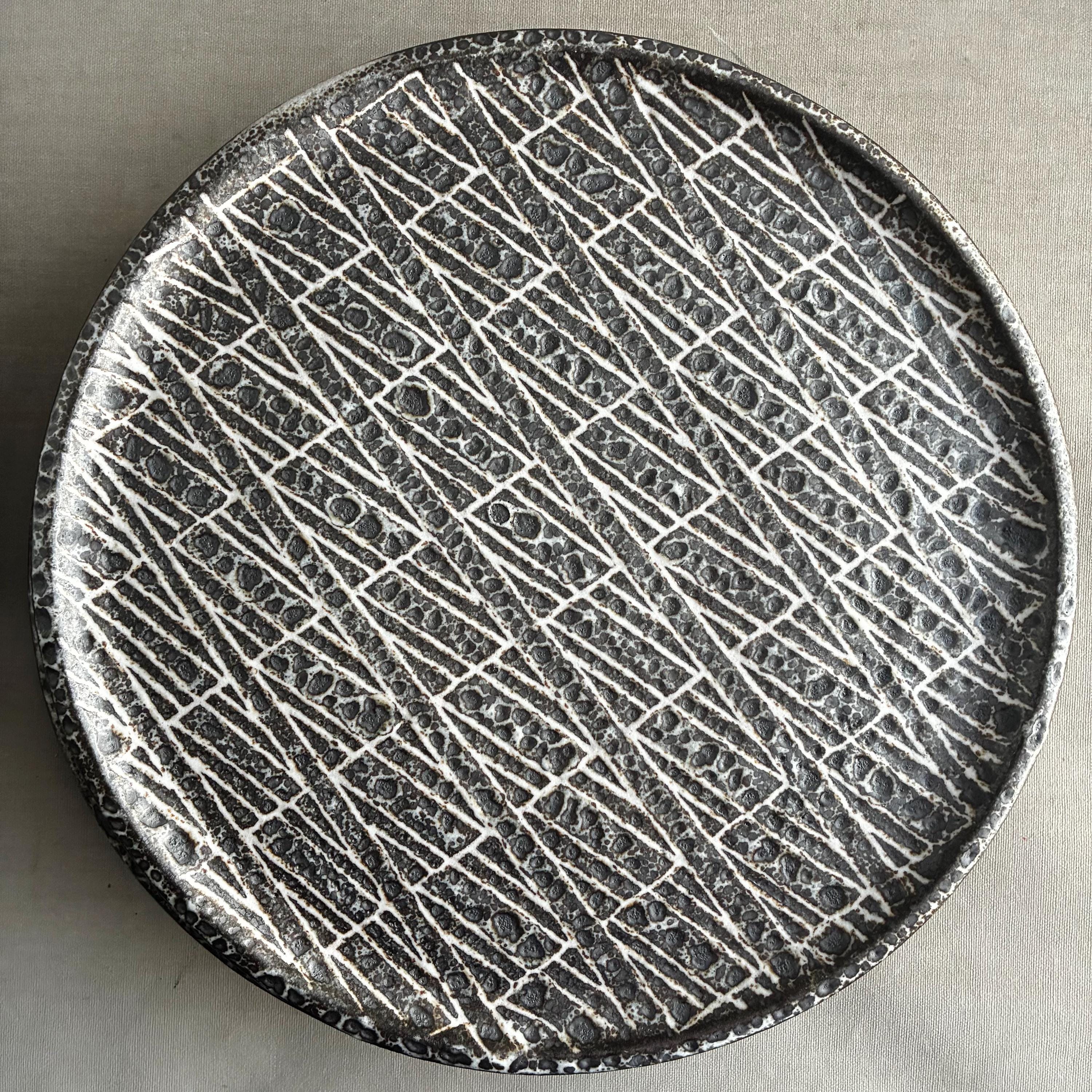 A beautiful set of Hand made studio pottery dinner plates . With a decorative sgraffito glaze technique finish. handmade so each plate truly unique . Set of 12 in various designs sold as a set . There is also a set of side plates Listed. Heavy parcel so hefty postage fee. viewings and collection welcome at our north London workshop