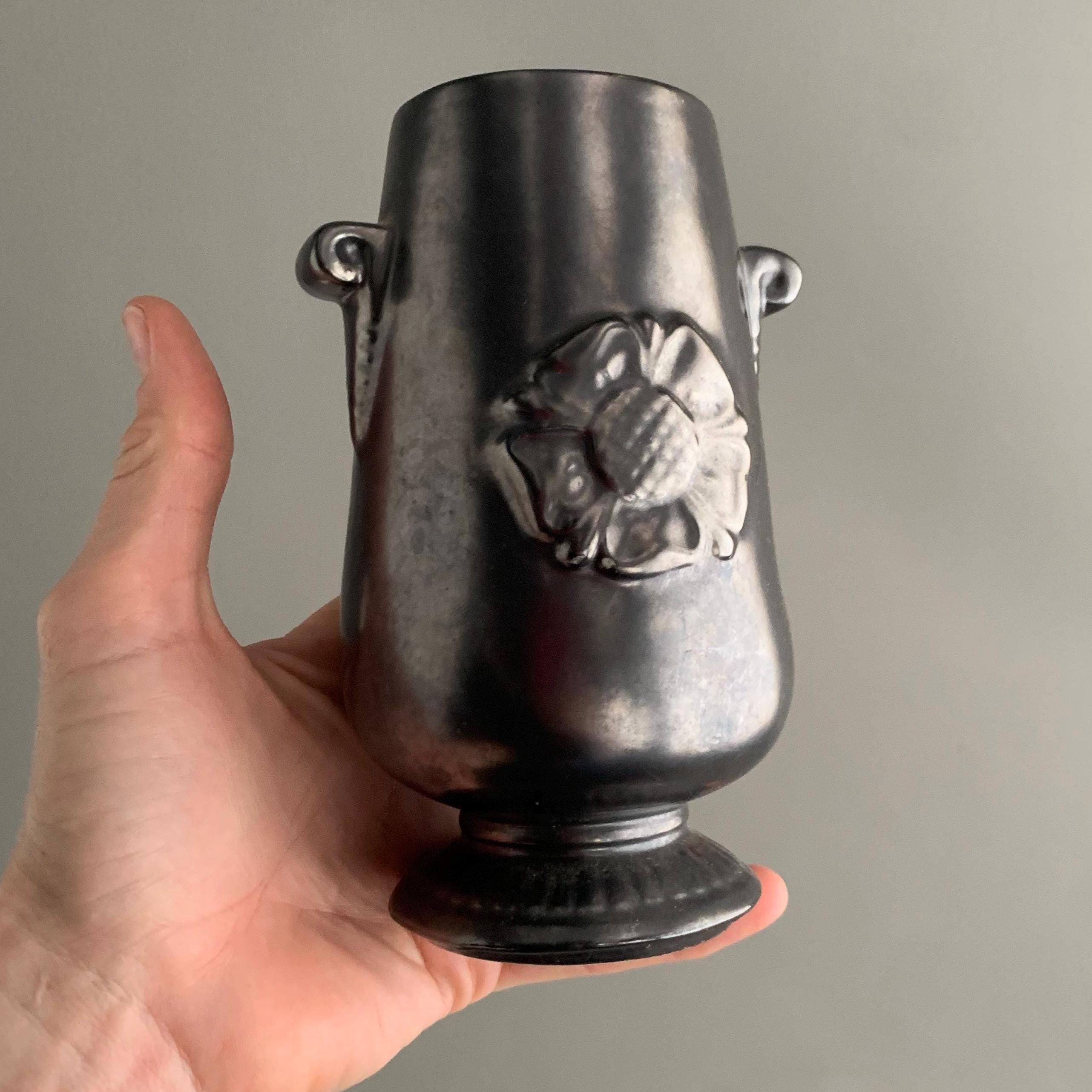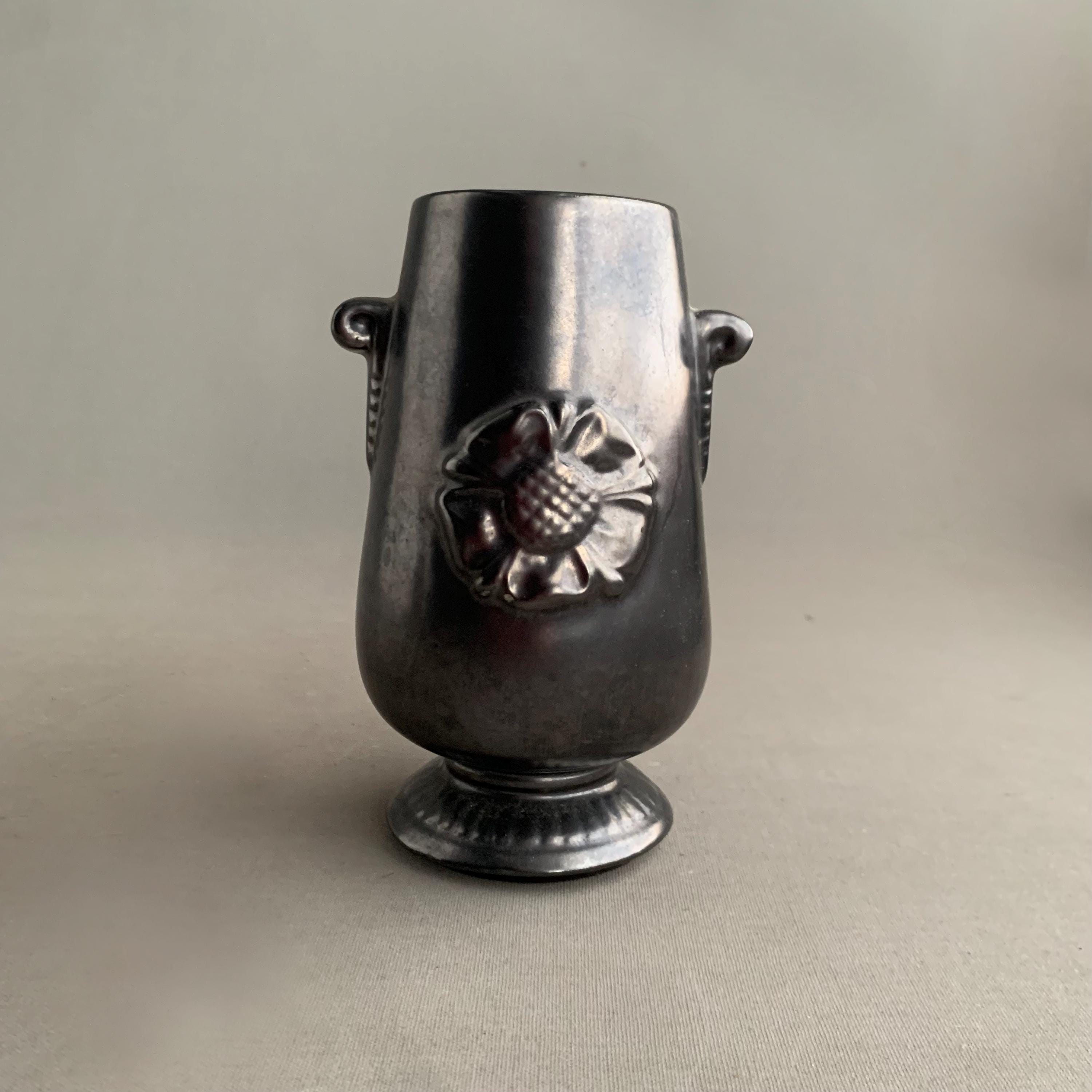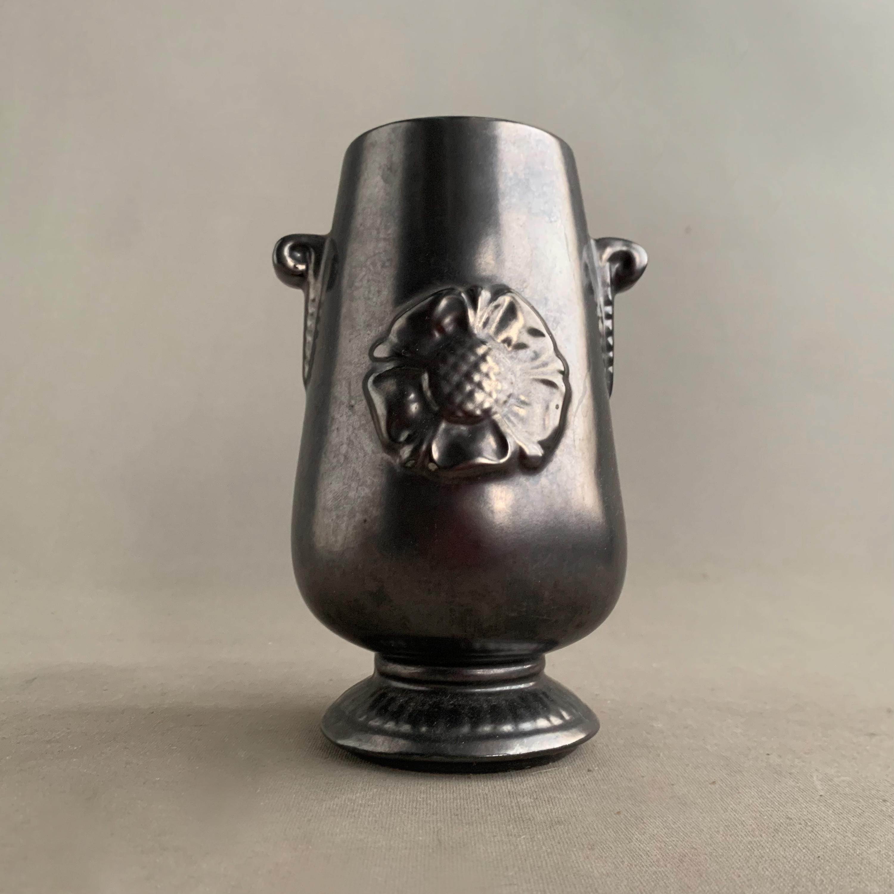 A Prinknash Abbey Pottery vase with a black lustre finish and two small handles. It features a raised rose motif on the front and a metallic black finish designed to resemble pewter.