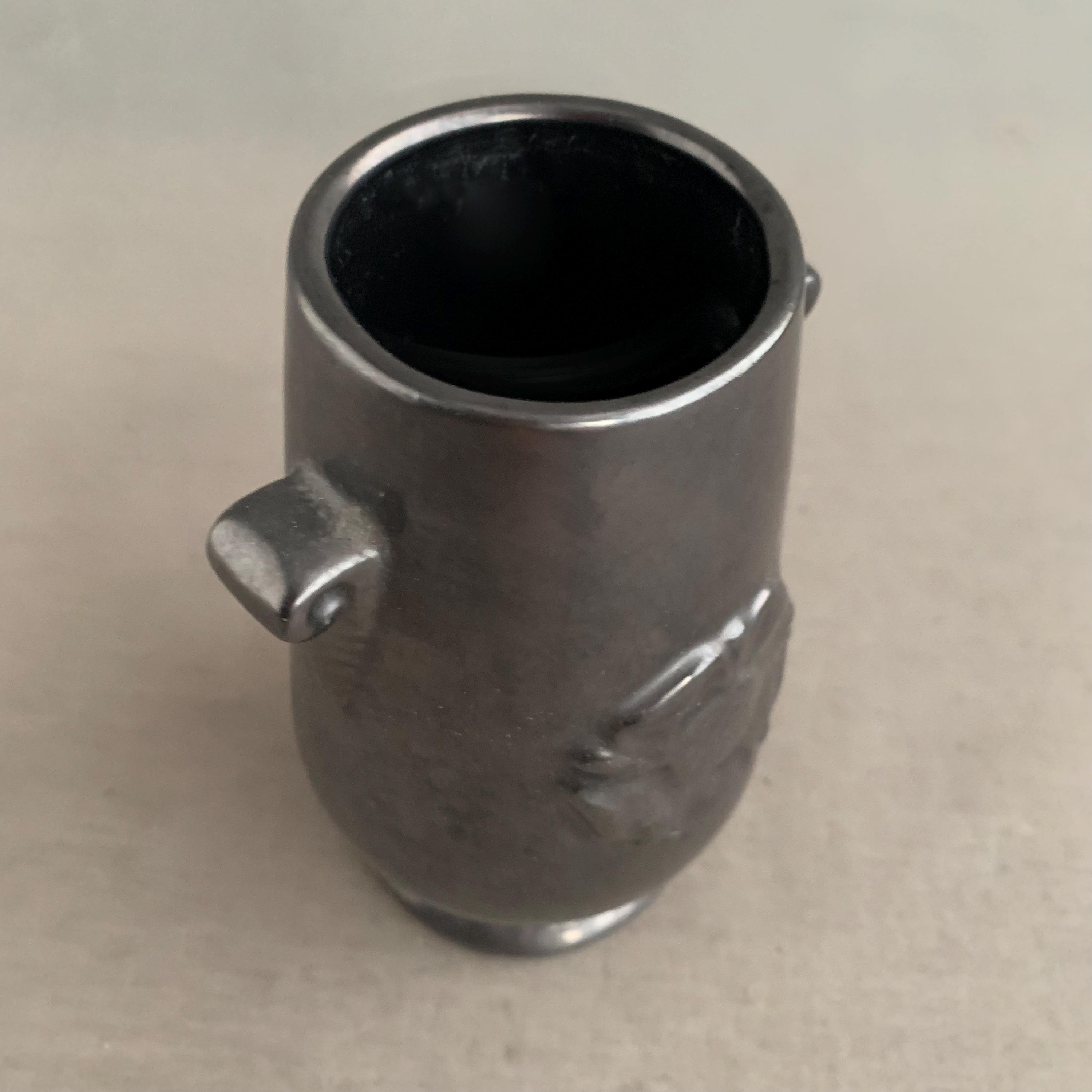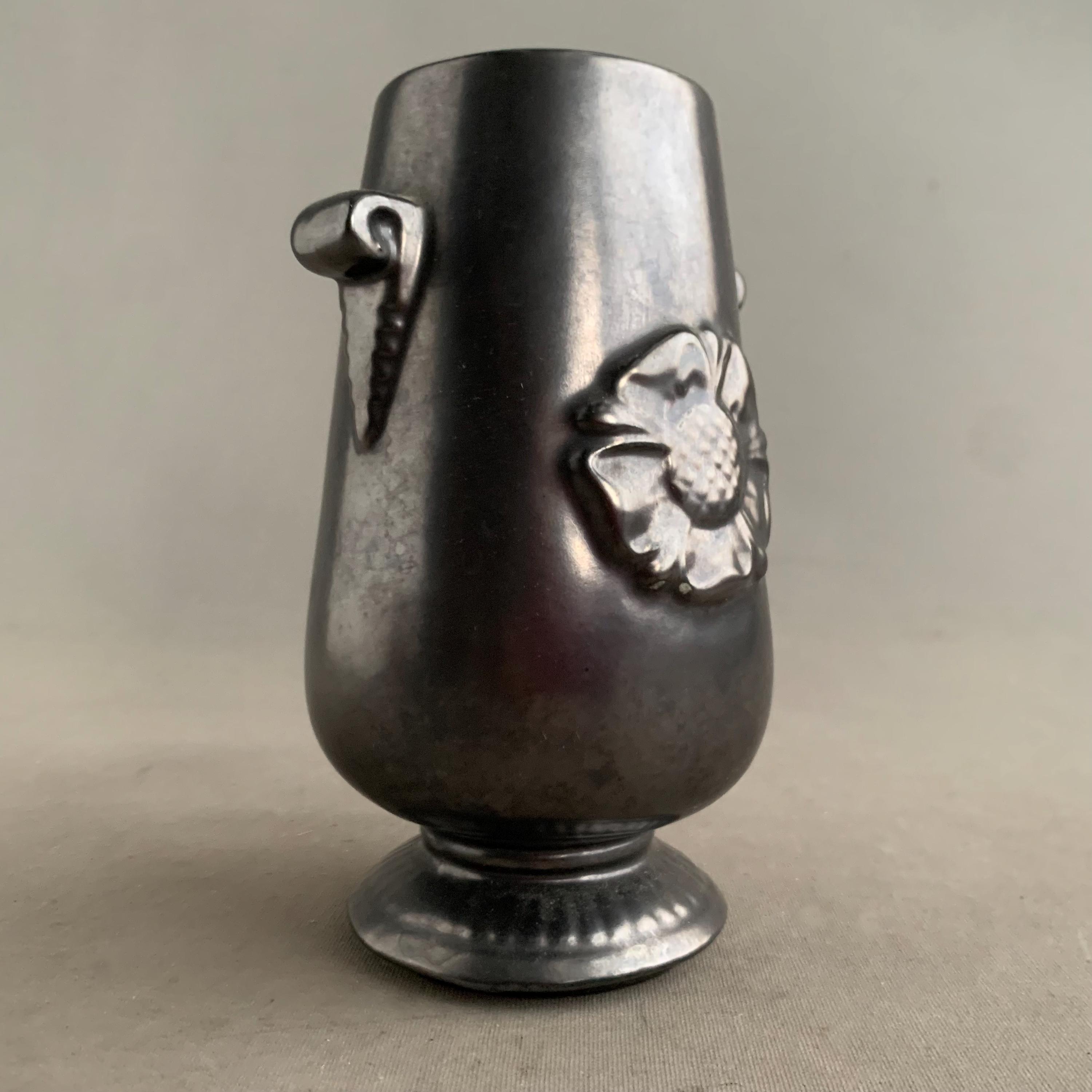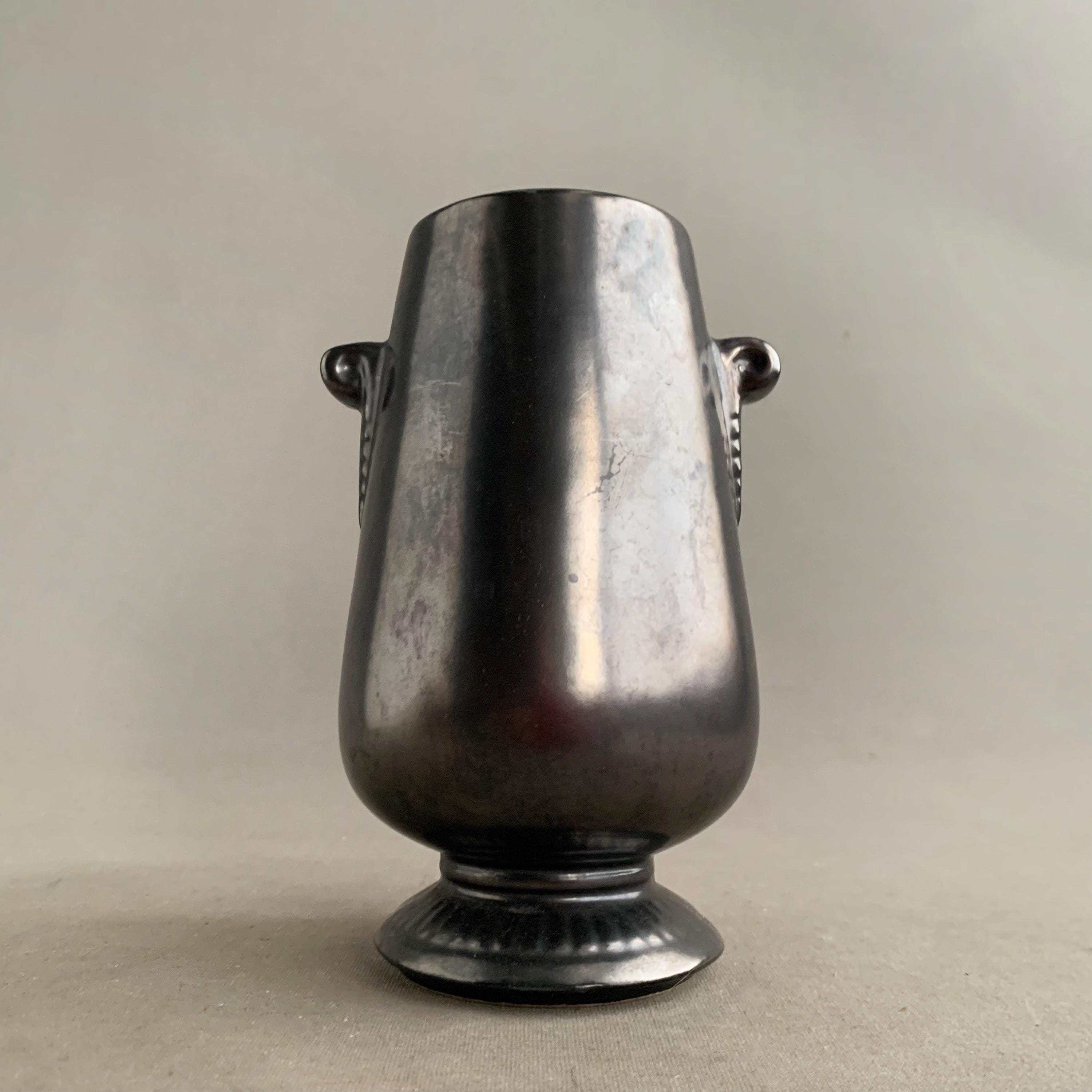 A Prinknash Abbey Pottery vase with a black lustre finish and two small handles. It features a raised rose motif on the front and a metallic black finish designed to resemble pewter.