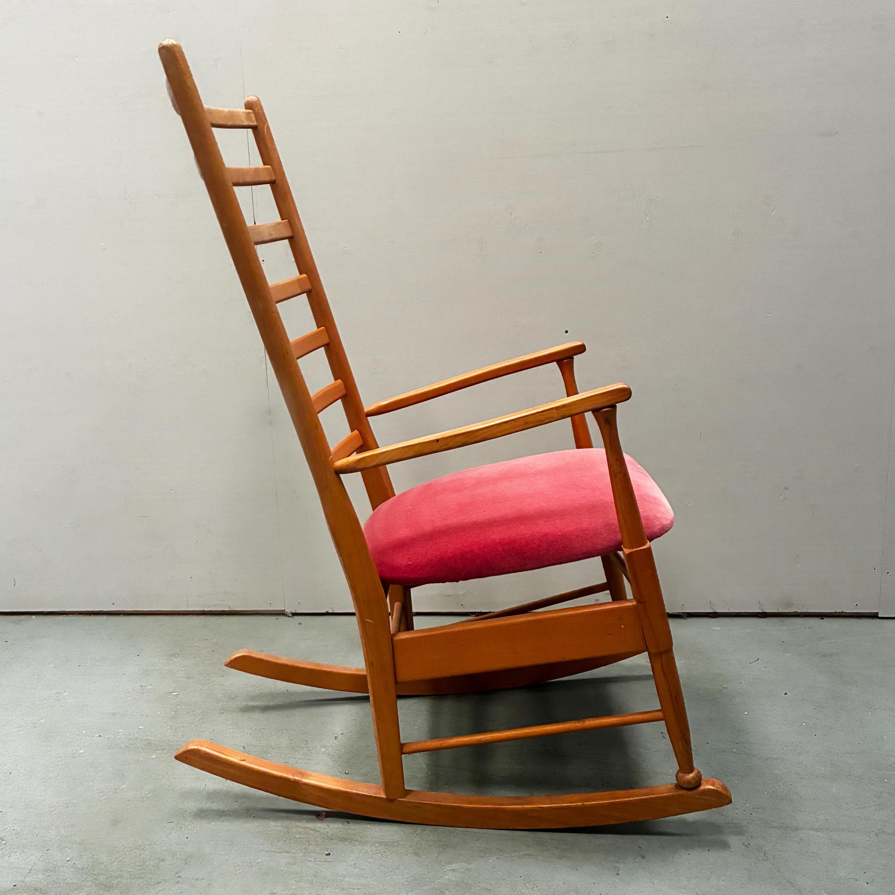 A mid-century vintage Scandart ladder back rocking chair Beech frame and pink velvet upholstered seat. Mid Century Danish rocking chair, with ladderback design, original upholstered seat.