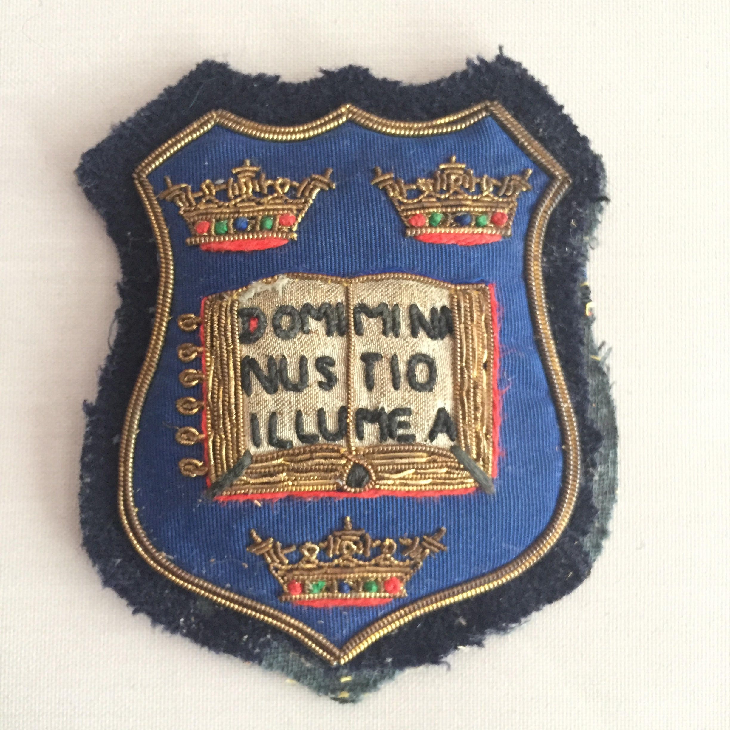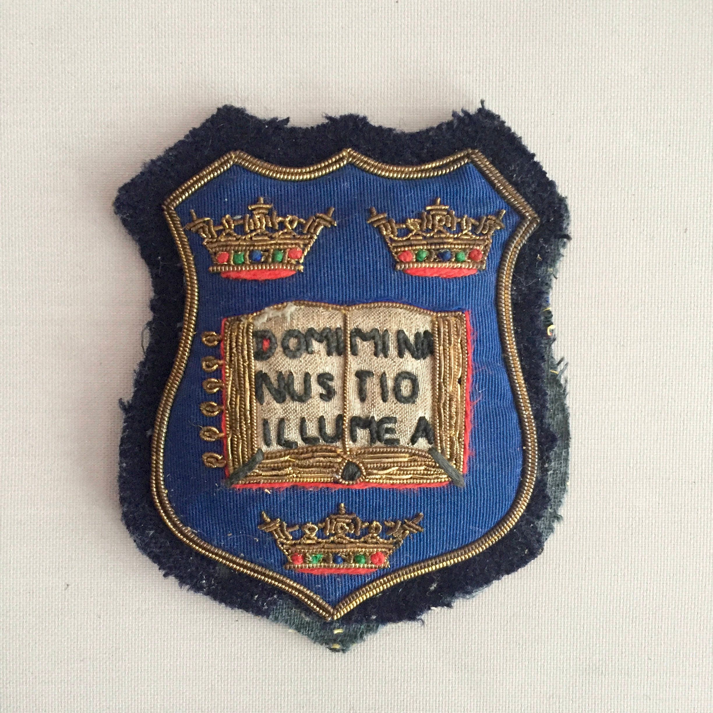 This is a Really beautiful embroidered Coat of arms for the university of Oxford U.K. It measures 9cm high x 7.5 cm. The gold thread is metallic and the detail of the stitching is wonderful . This would look great on a denim jacket. In great vintage condition