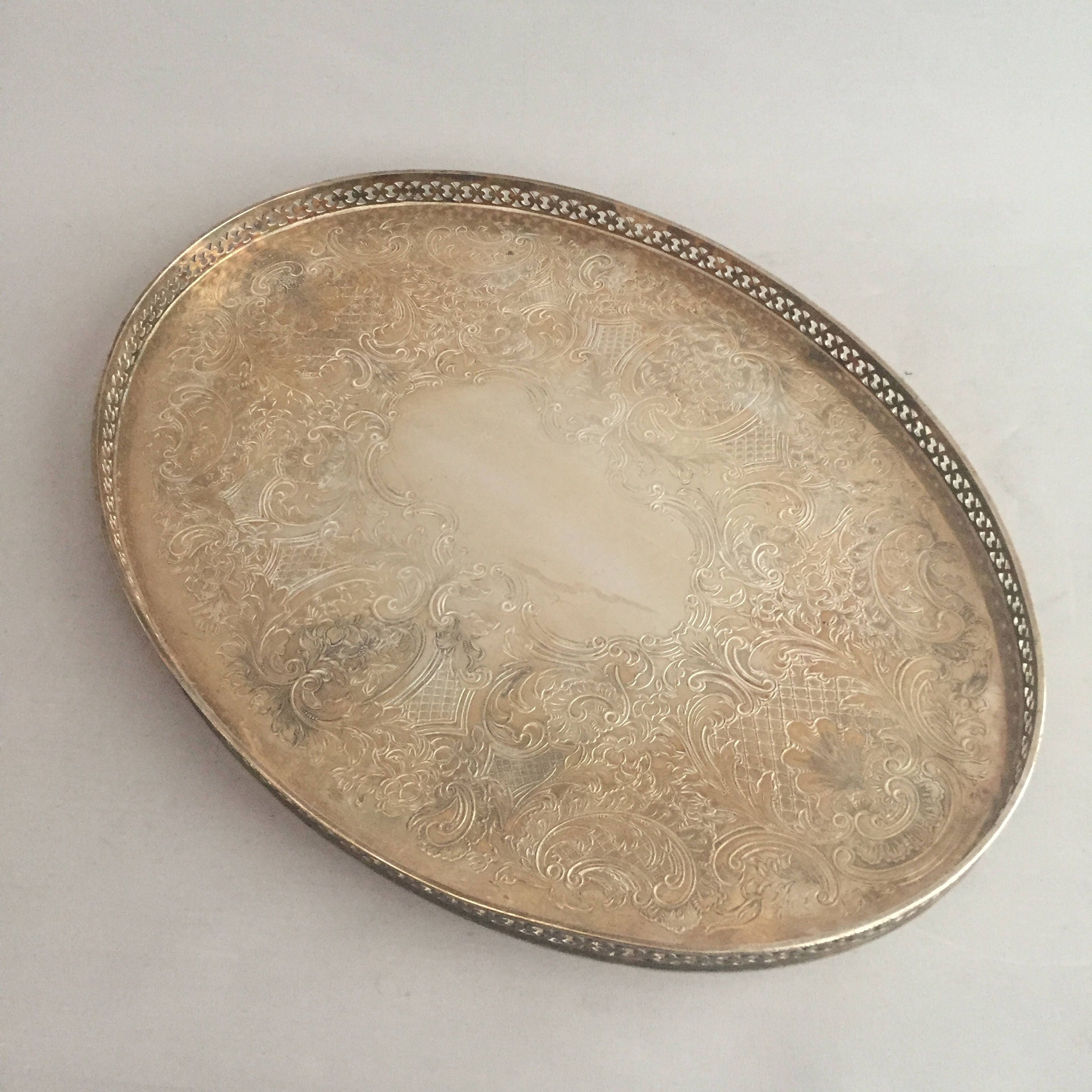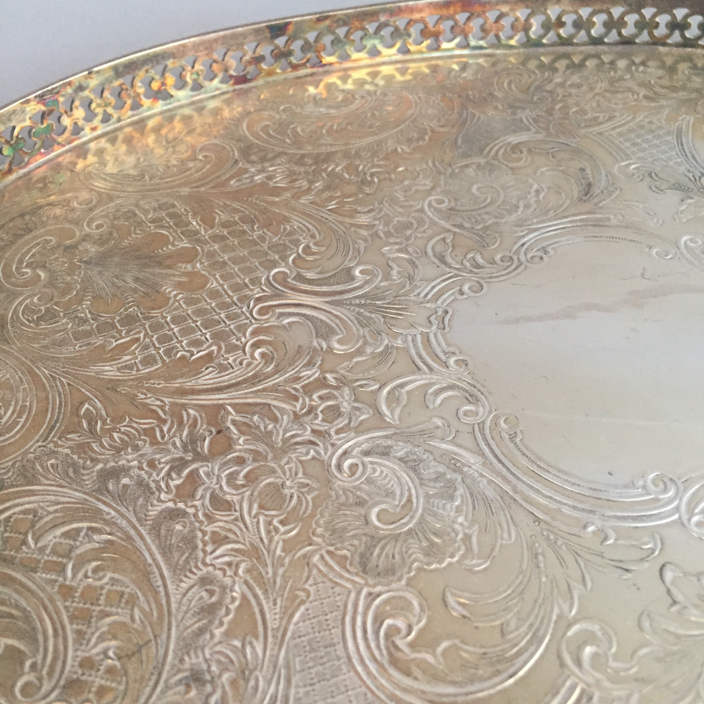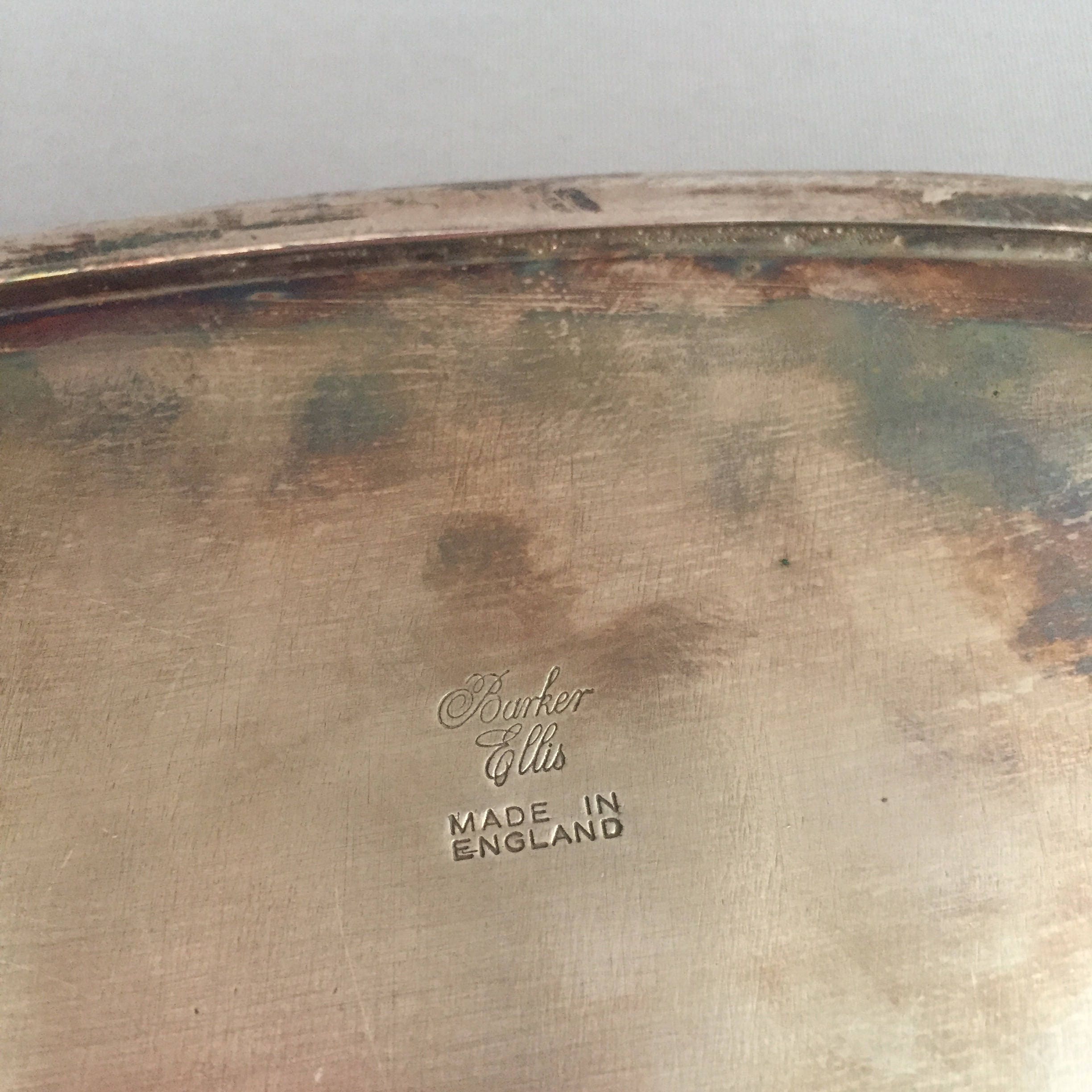 A vintage Barker Ellis silver plated on copper drinks tray, made in England. With a pierced gallery of approx. 2 cm and chased foliate decoration. Charmingly tarnished ( though I'm sure this would polish up nicely) Some scratches and minor plate loss from use but structurally sound with no nasty dents. Please take a good look at the photographs, these form an important part of the description. This would work as a drinks tray or a lovely way to display your perfume collection or your decanters