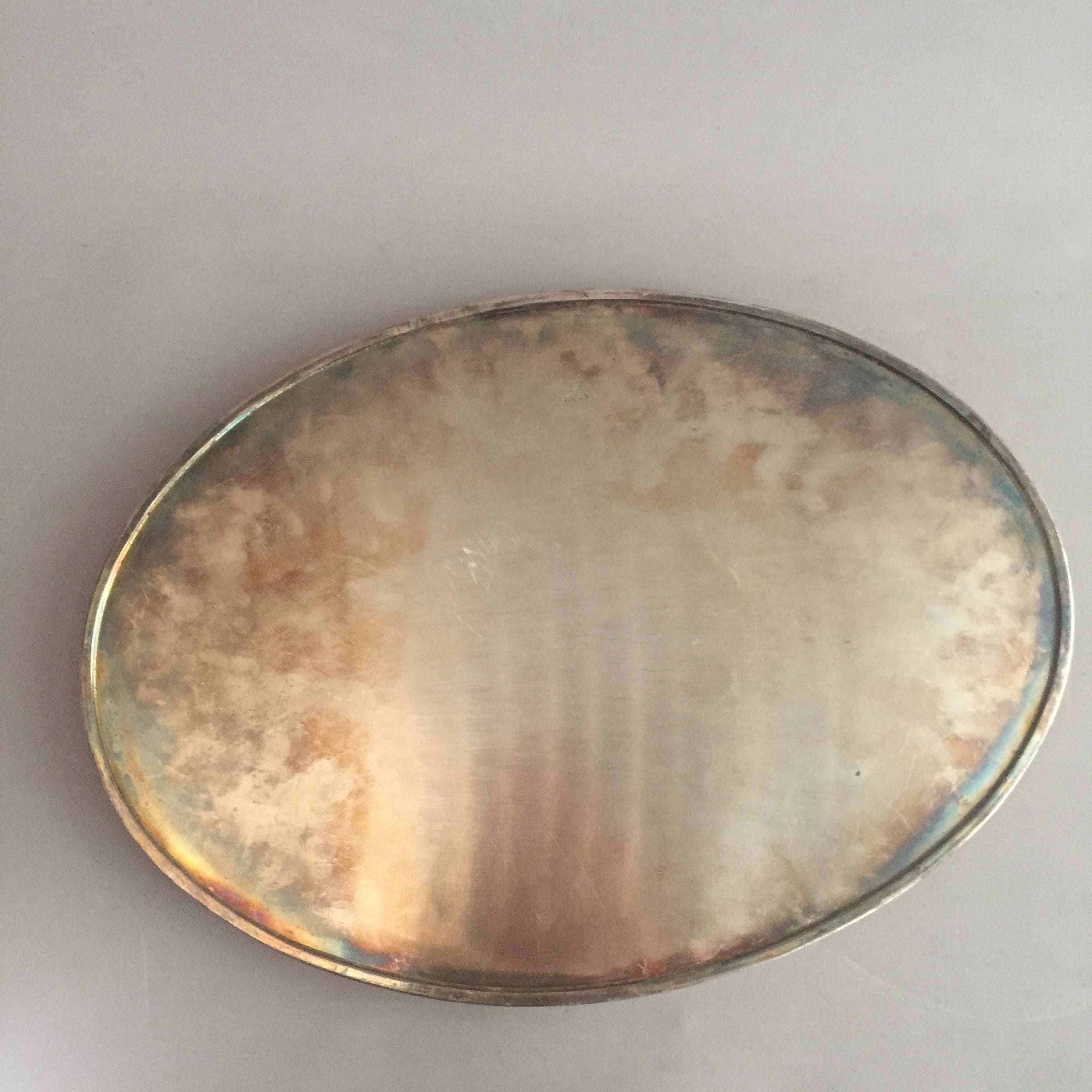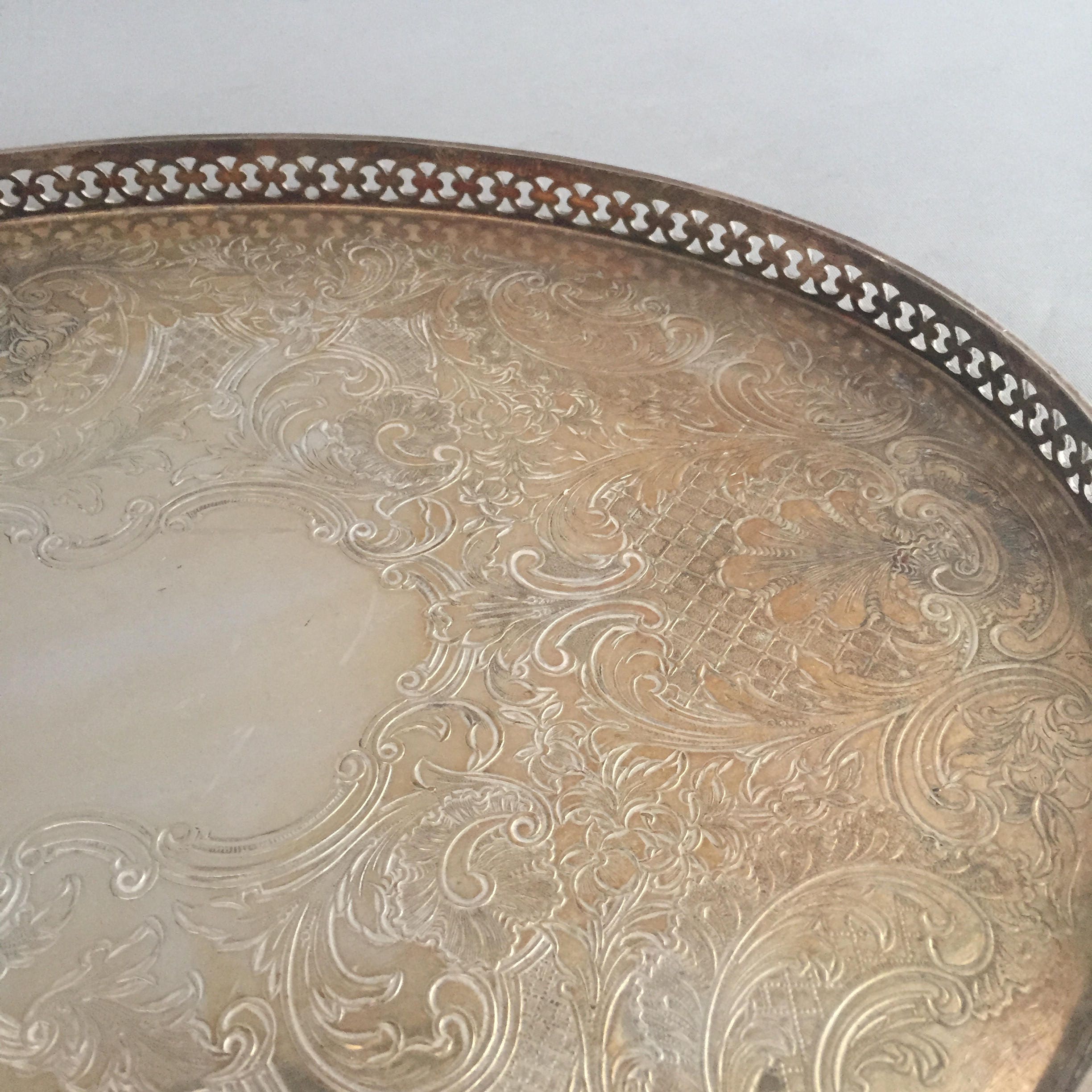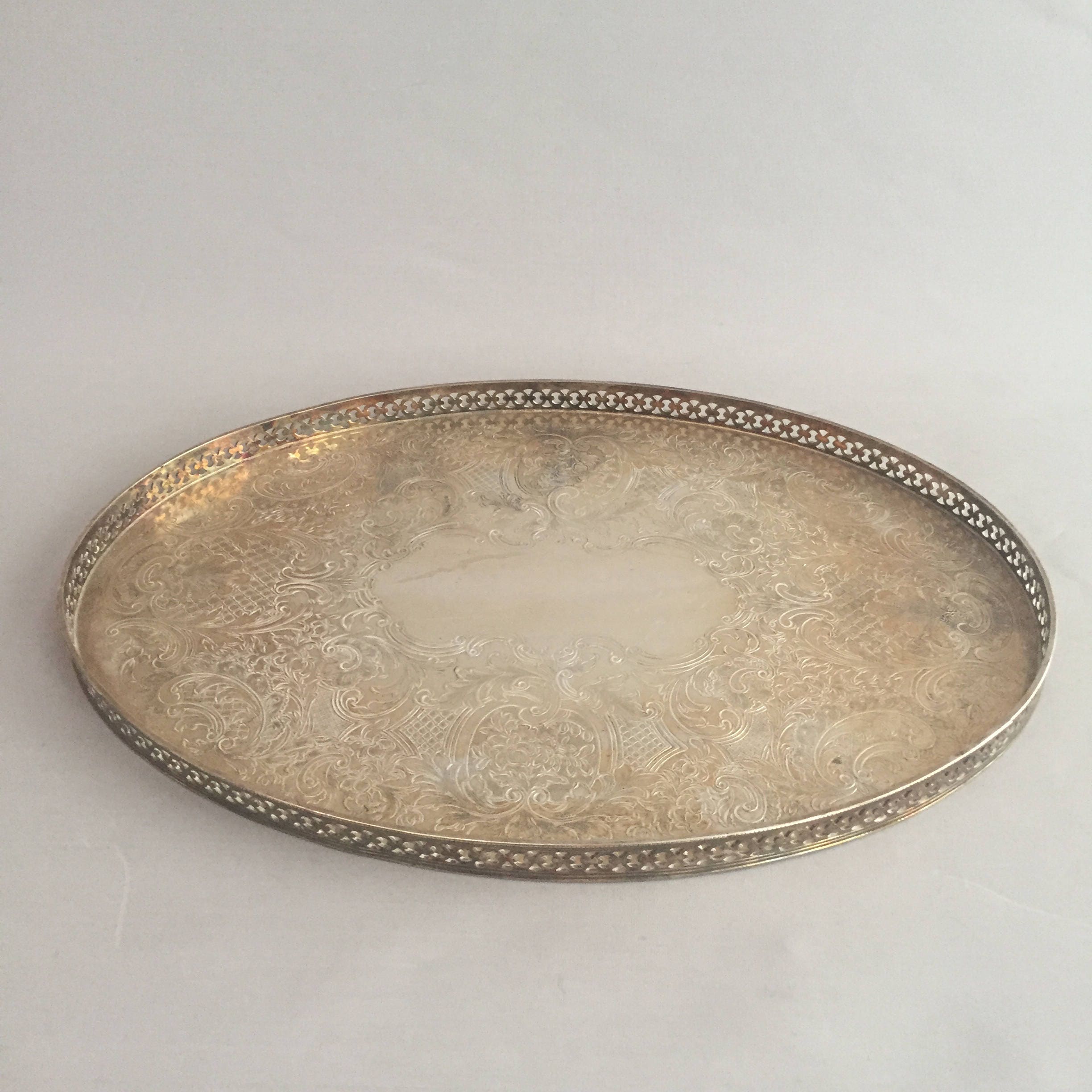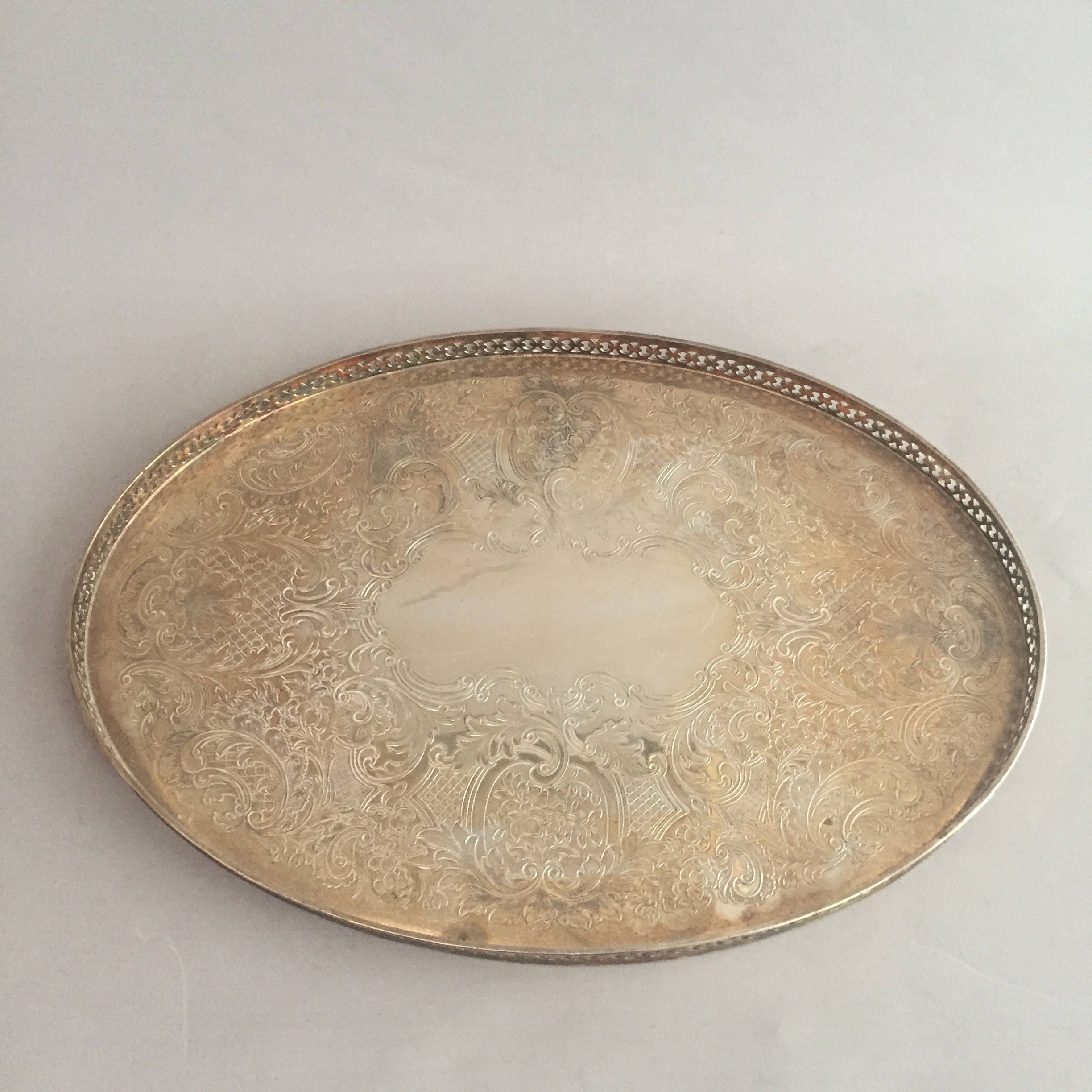 A vintage Barker Ellis silver plated on copper drinks tray, made in England. With a pierced gallery of approx. 2 cm and chased foliate decoration. Charmingly tarnished ( though I'm sure this would polish up nicely) Some scratches and minor plate loss from use but structurally sound with no nasty dents. Please take a good look at the photographs, these form an important part of the description. This would work as a drinks tray or a lovely way to display your perfume collection or your decanters