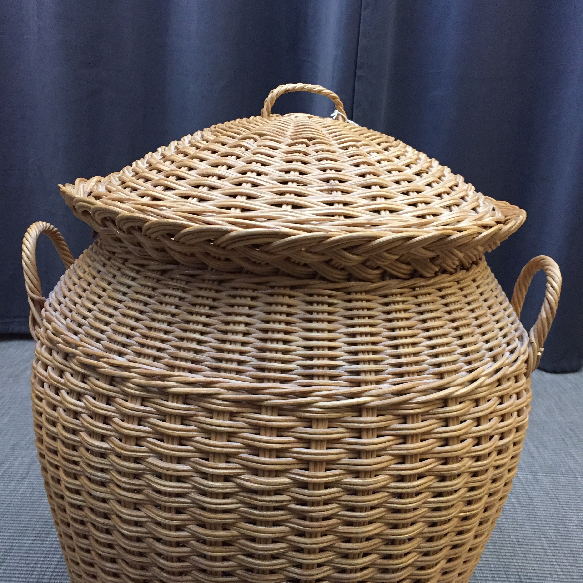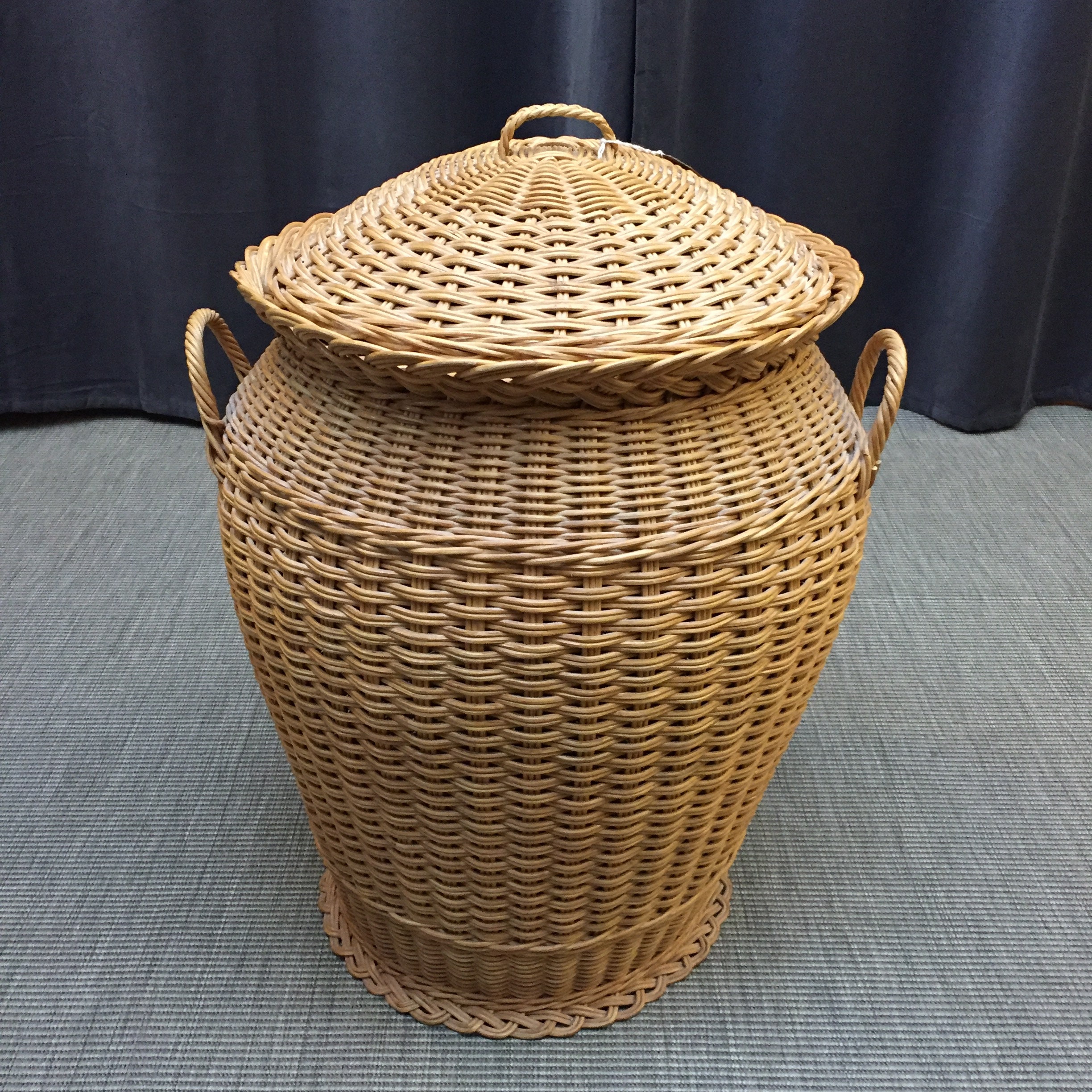 A classic 1970s Alibaba style laundry basket. Woven out of wicker ( cane ) the best way to store clothes gathering for the wash as it is a breathable woven basket. Measures 63 cm high x 49 cm wide . 150 cm diameter. Viewings and collection welcome at our North London shop in Muswell hill N10 3NP