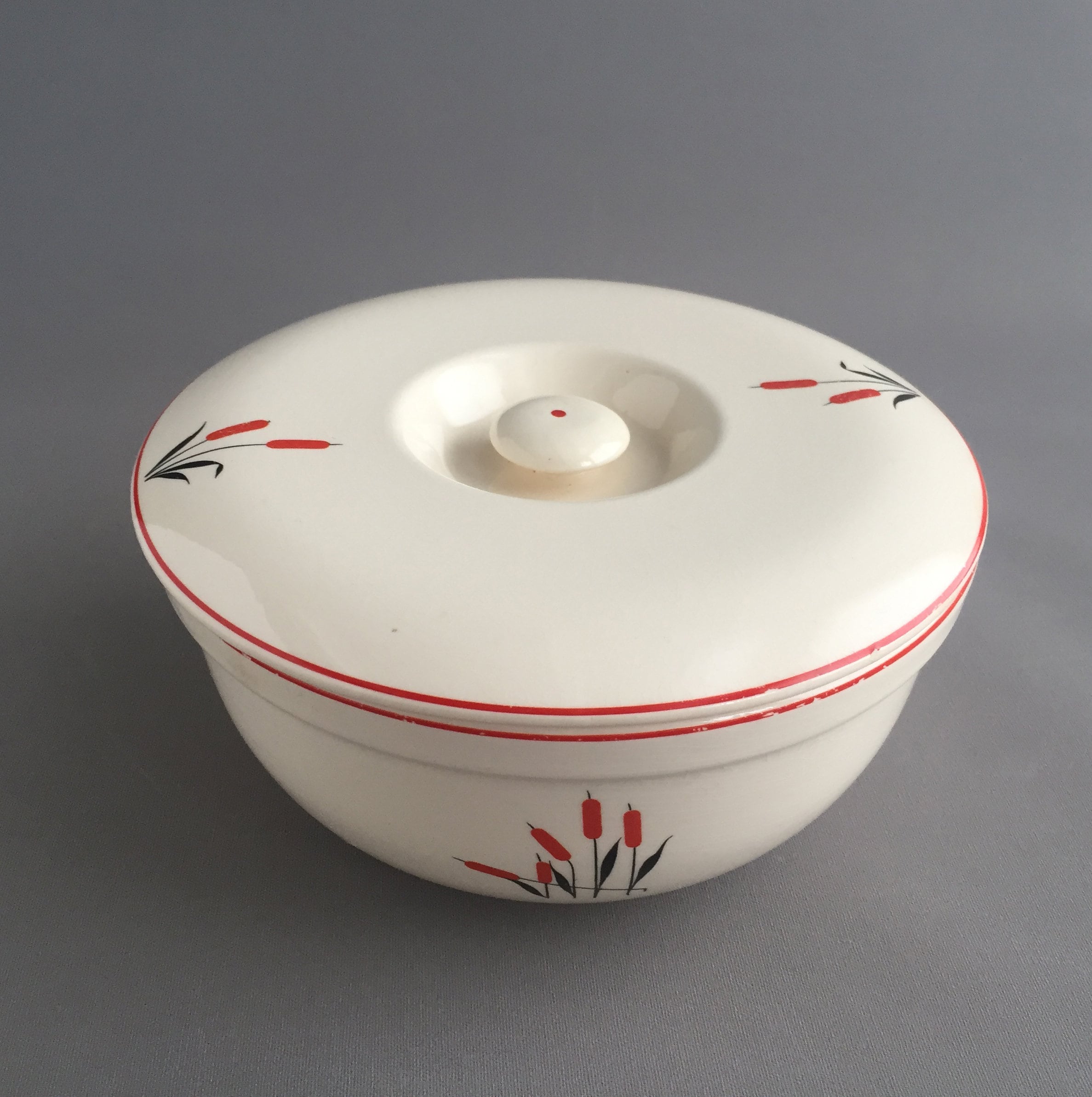 A ceramic oven proof lidded dish by Universal Cambridge. Cream /off white with red line detail and bull rush reed/ Cattails motive. Measures 21.5 cm wide x 21.5cm deep x 10 cm high