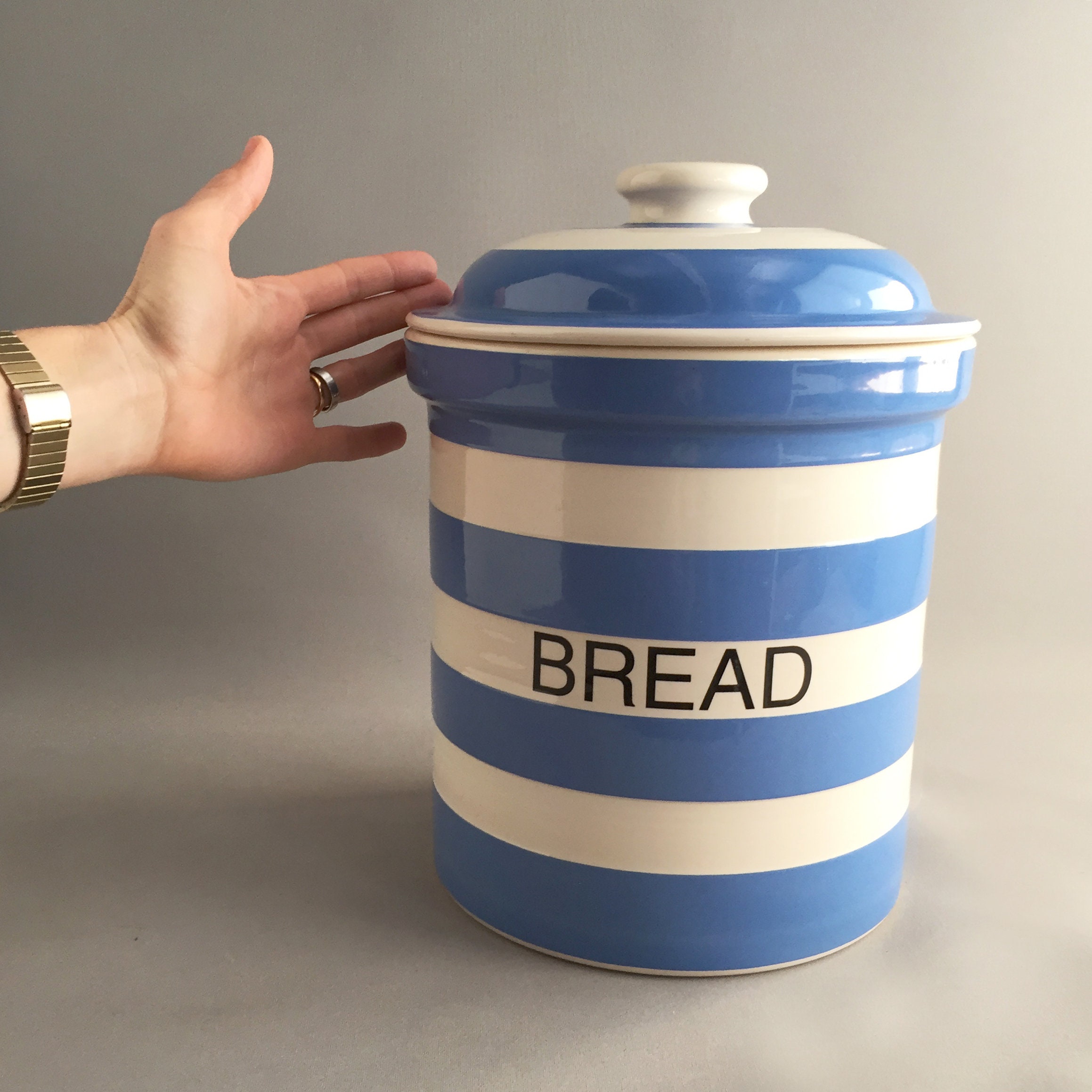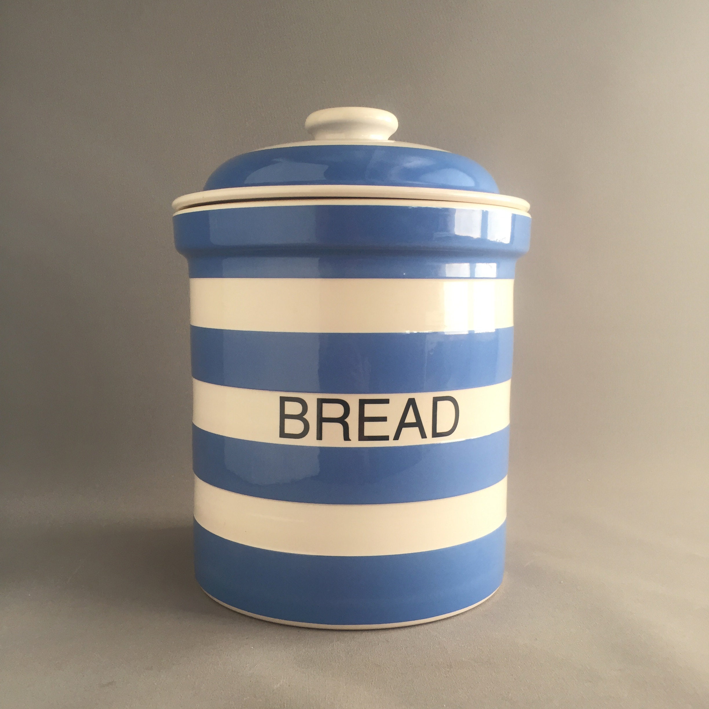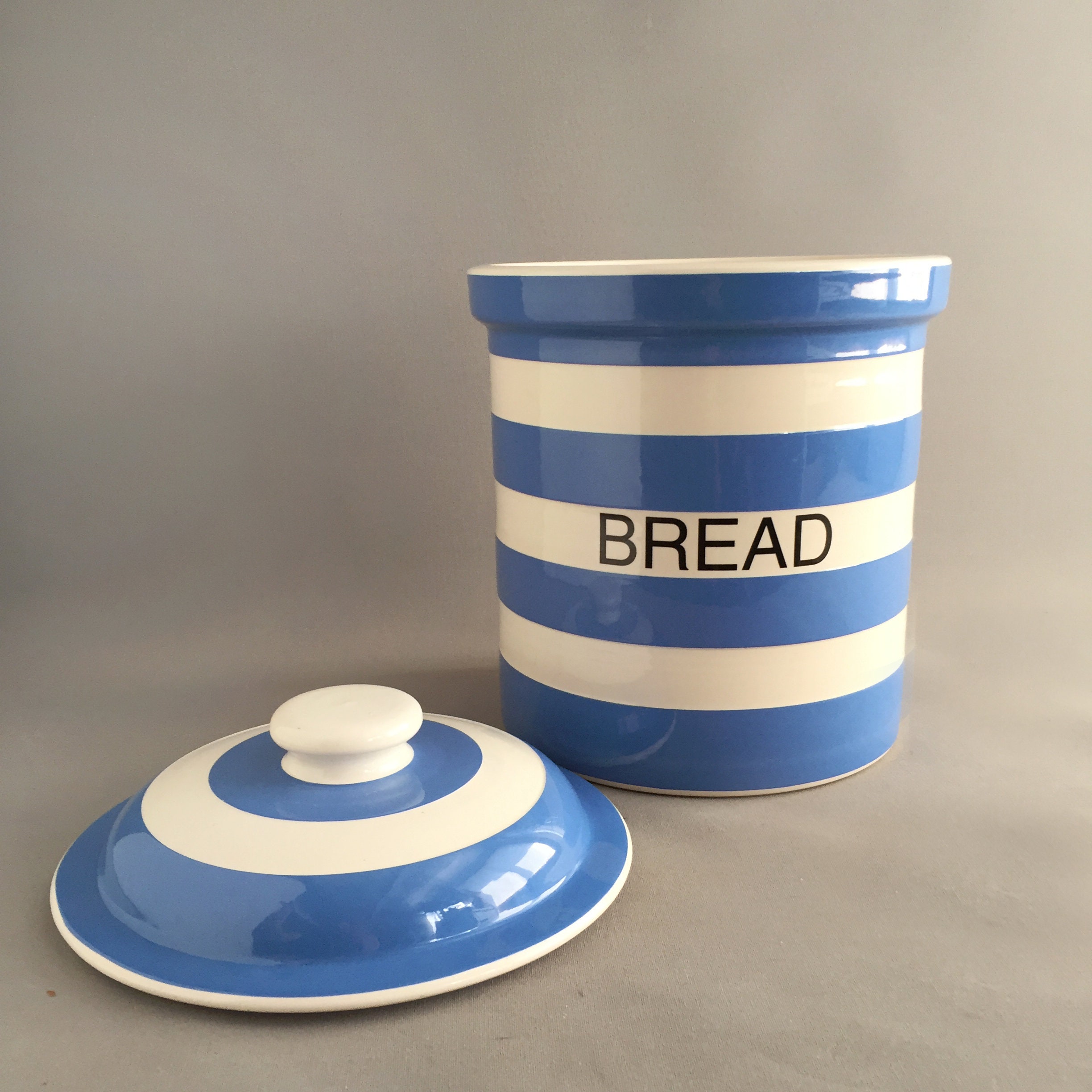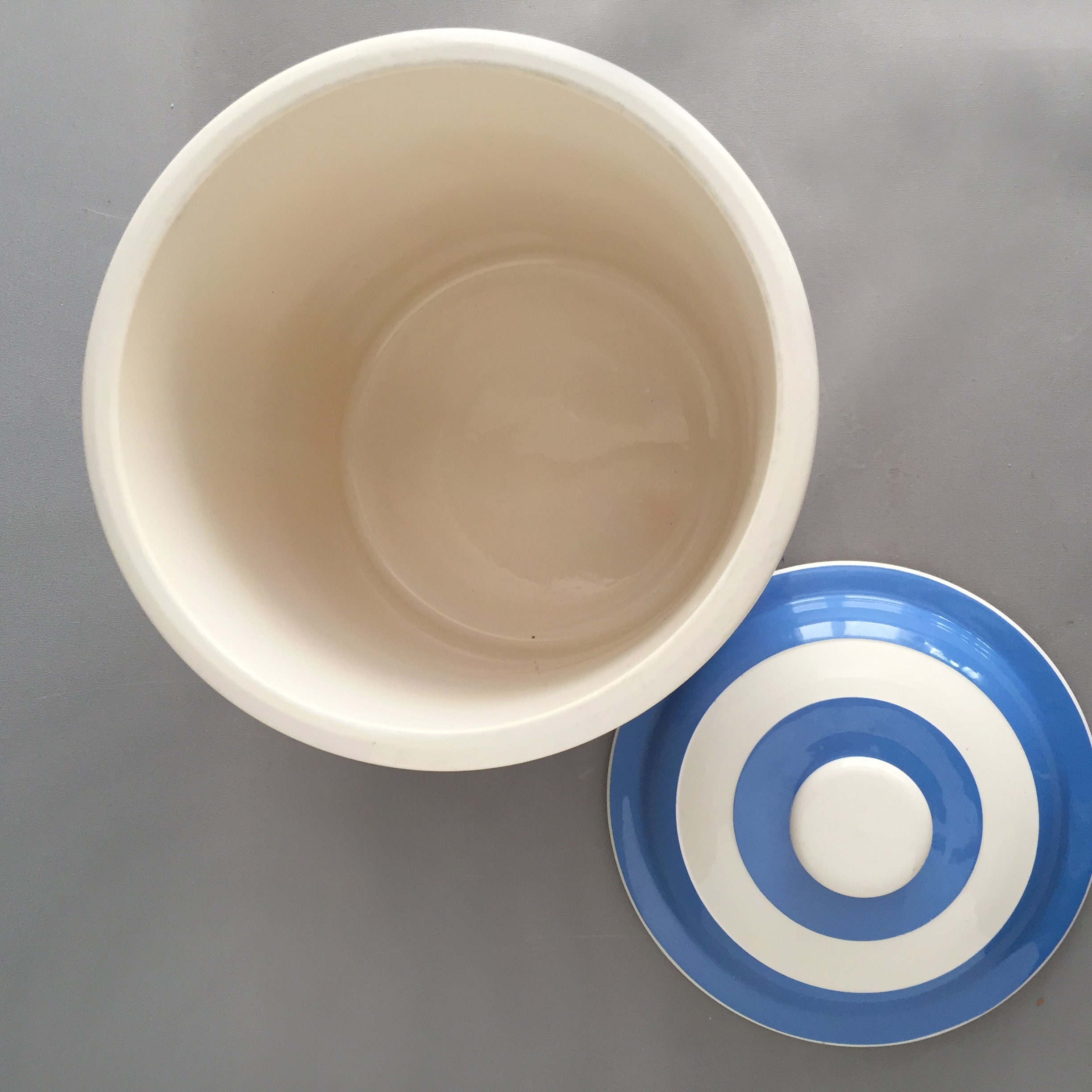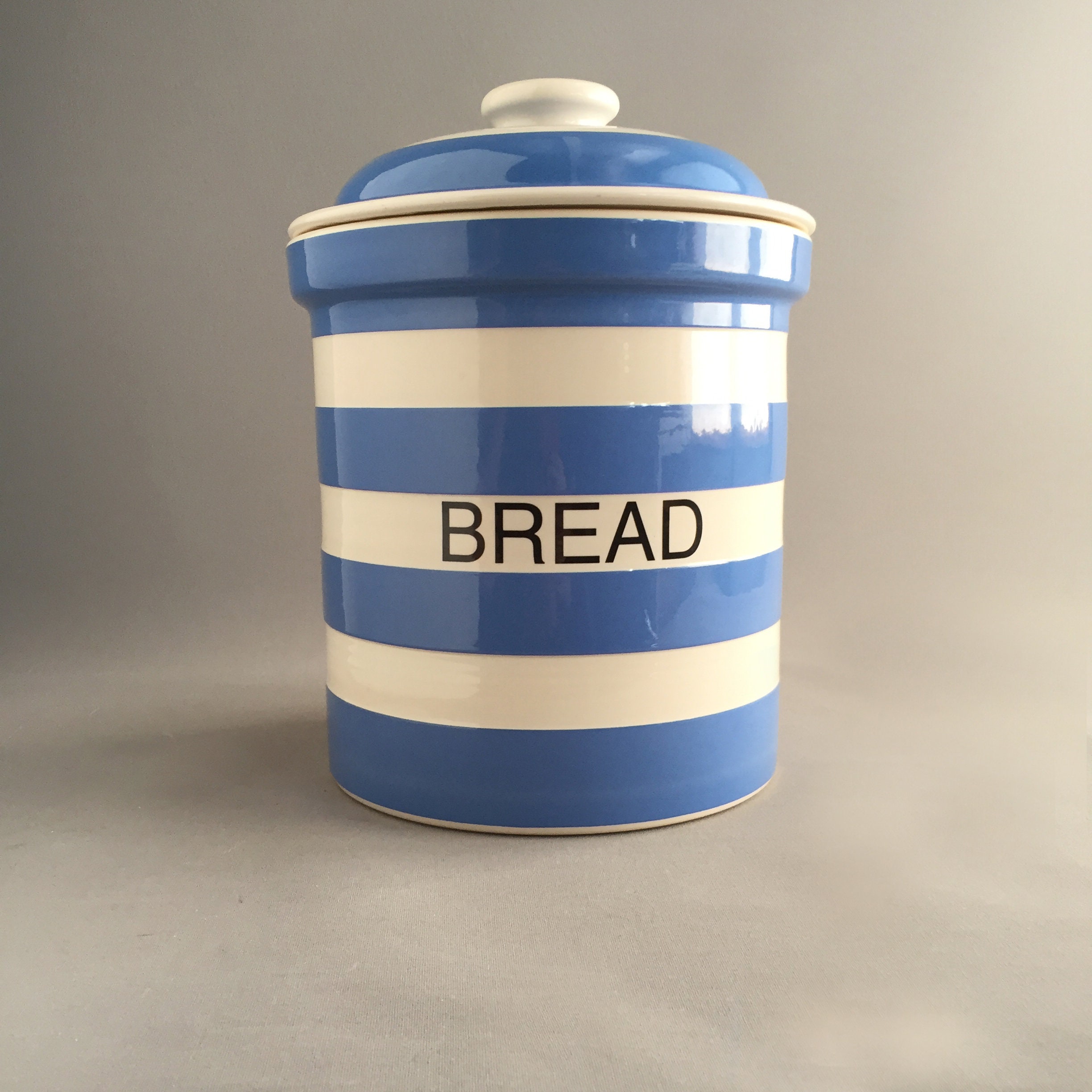 Beautiful T G Green Cornishware bread bin with lid. You can see from the photos it is in perfect condition. You can fit ample bread in this Crock. Measures 32cm tall with the lid and 25cm wide. It weighs over 4.5kg. Marked on the underneath with the Cornish ware emblem ( pictures to follow ) First produced in 1924 cornishware was created by using a lathe-turning technique that scraped blue slip away from its beautiful ceramics to reveal white bands of clay beneath. Those stripes reminded an employee of the blue skies and white-crested waves of Cornwall – which is how Cornishware got its name. Postage is high on this item because it is really heavy and breakable, but i will refund any postage over charge once I know exactly where it is going and what it will cost to send.