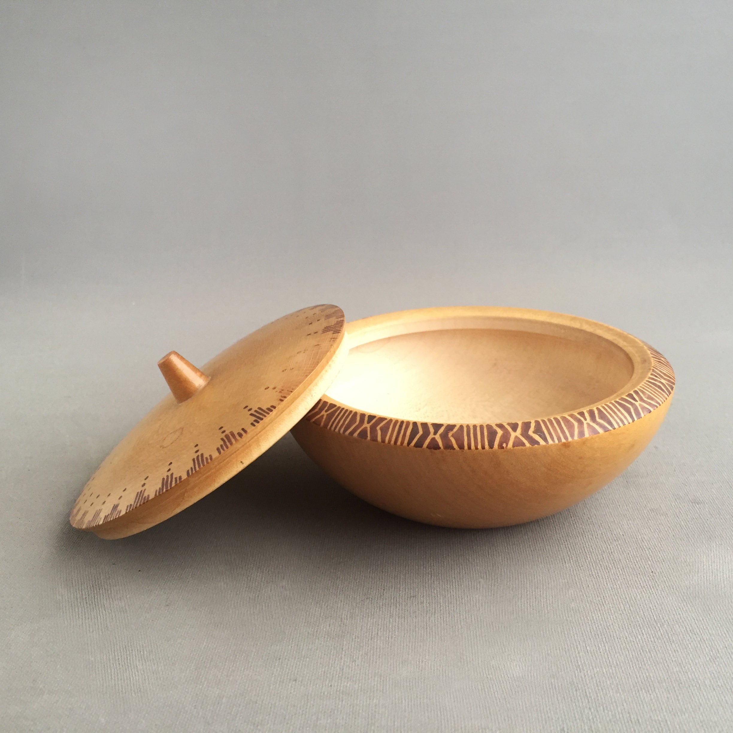A hand turned and crafted lidded wooden dish. Hand painted with a tribal pattern. Who ever made this beautiful little dish knew what they were doing- the elegant shape, the beautiful painted decoration the overall finish . A little dish to hide clutter or store rings and things in. Display where you can look upon its beauty.