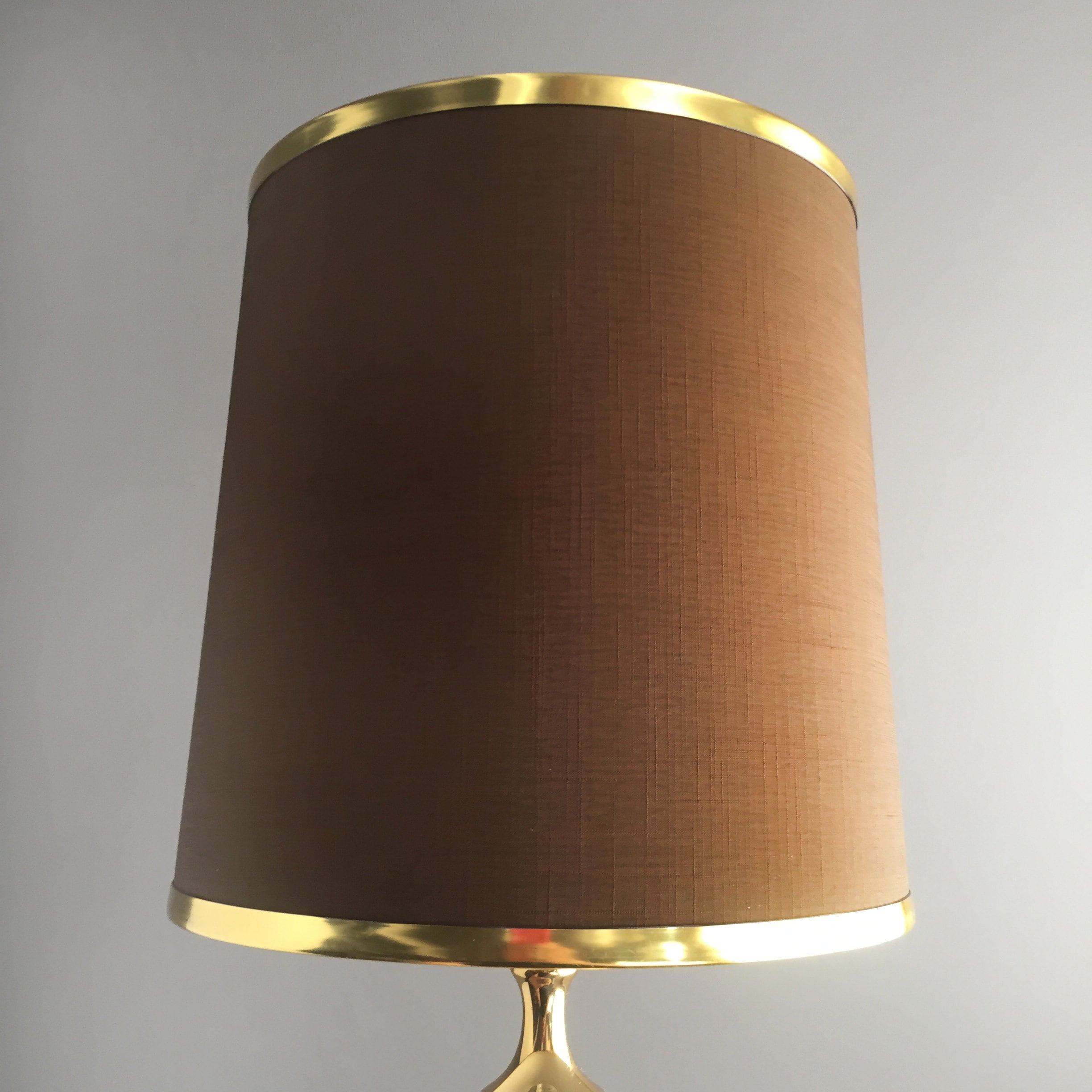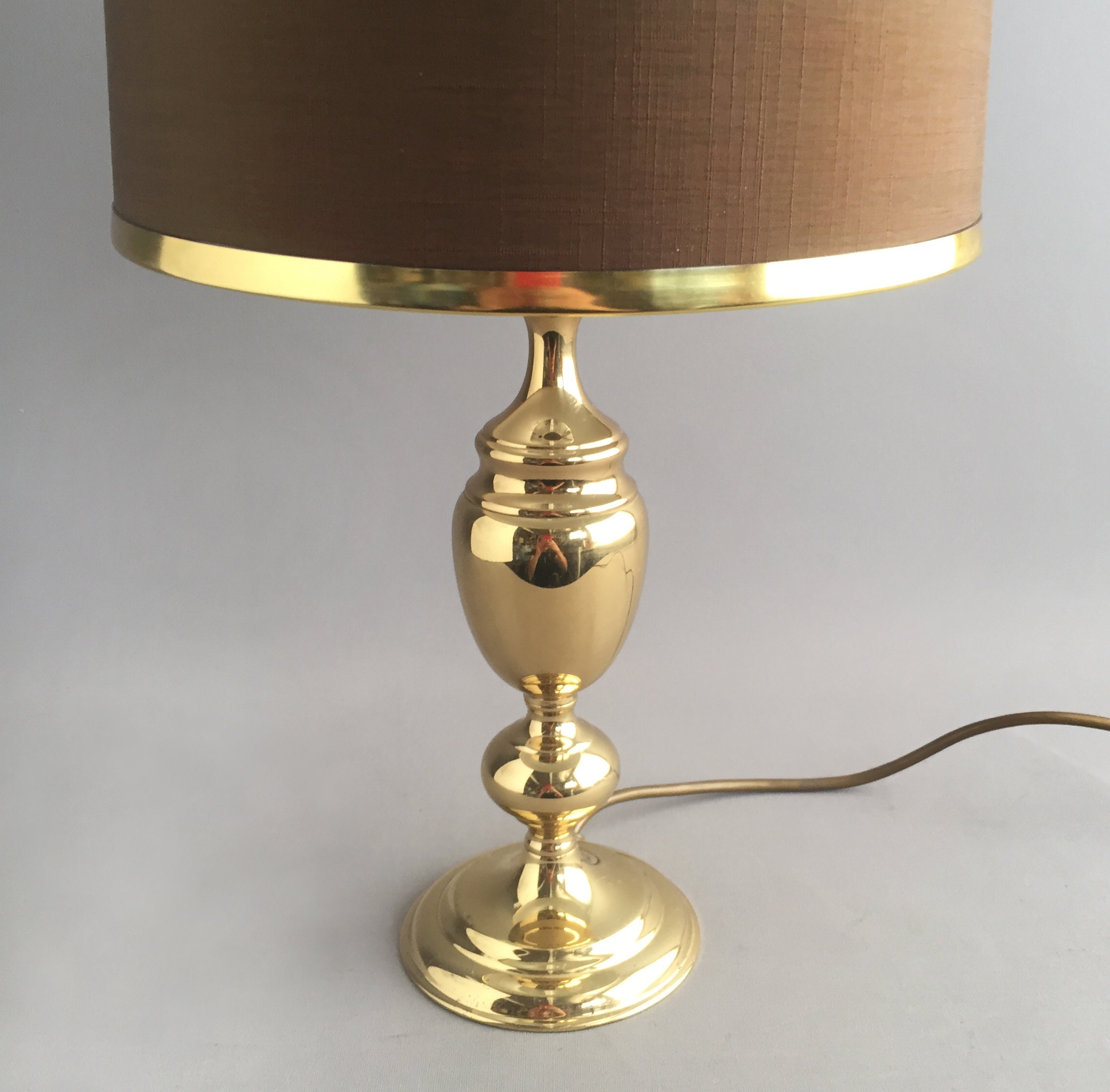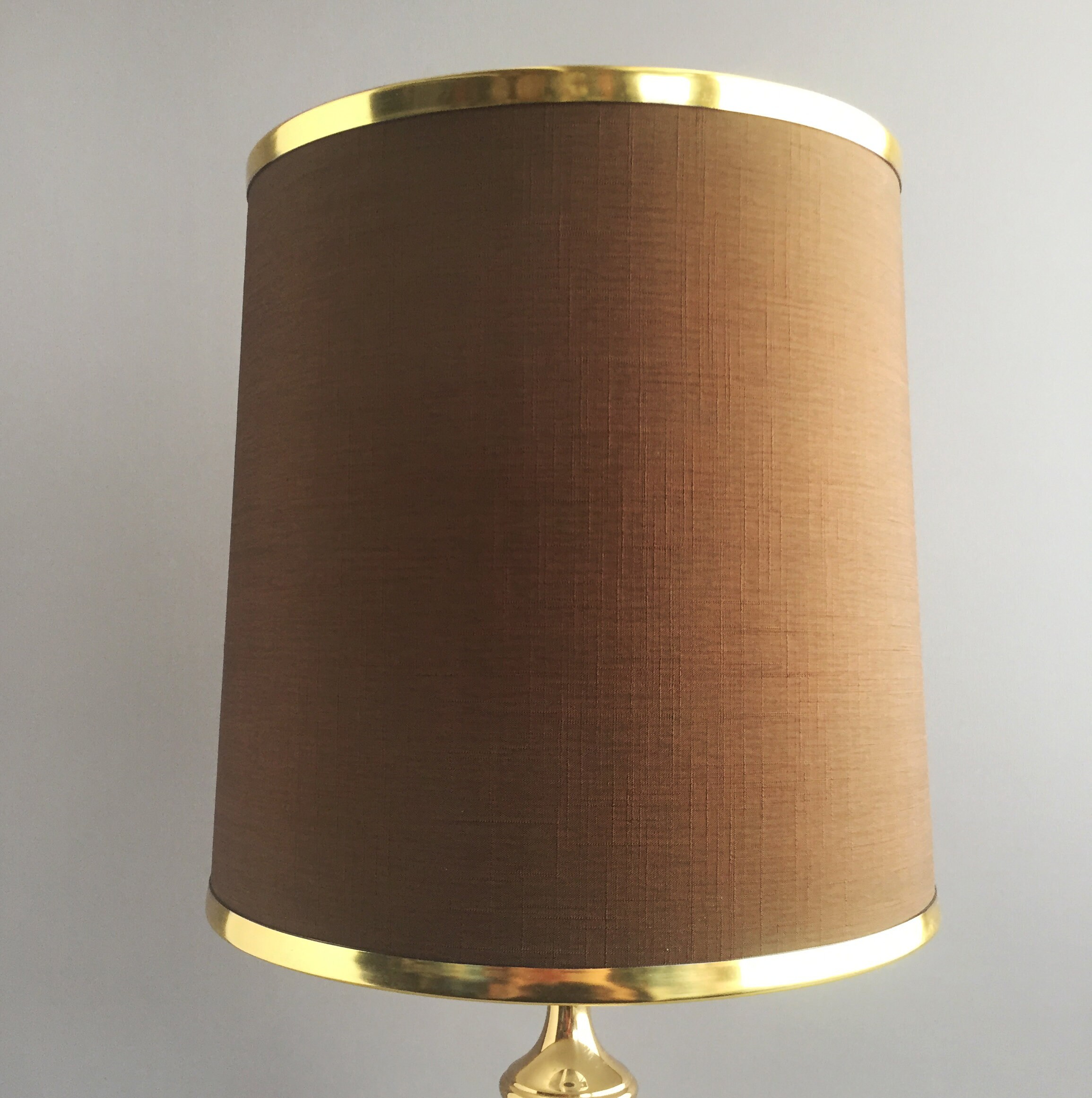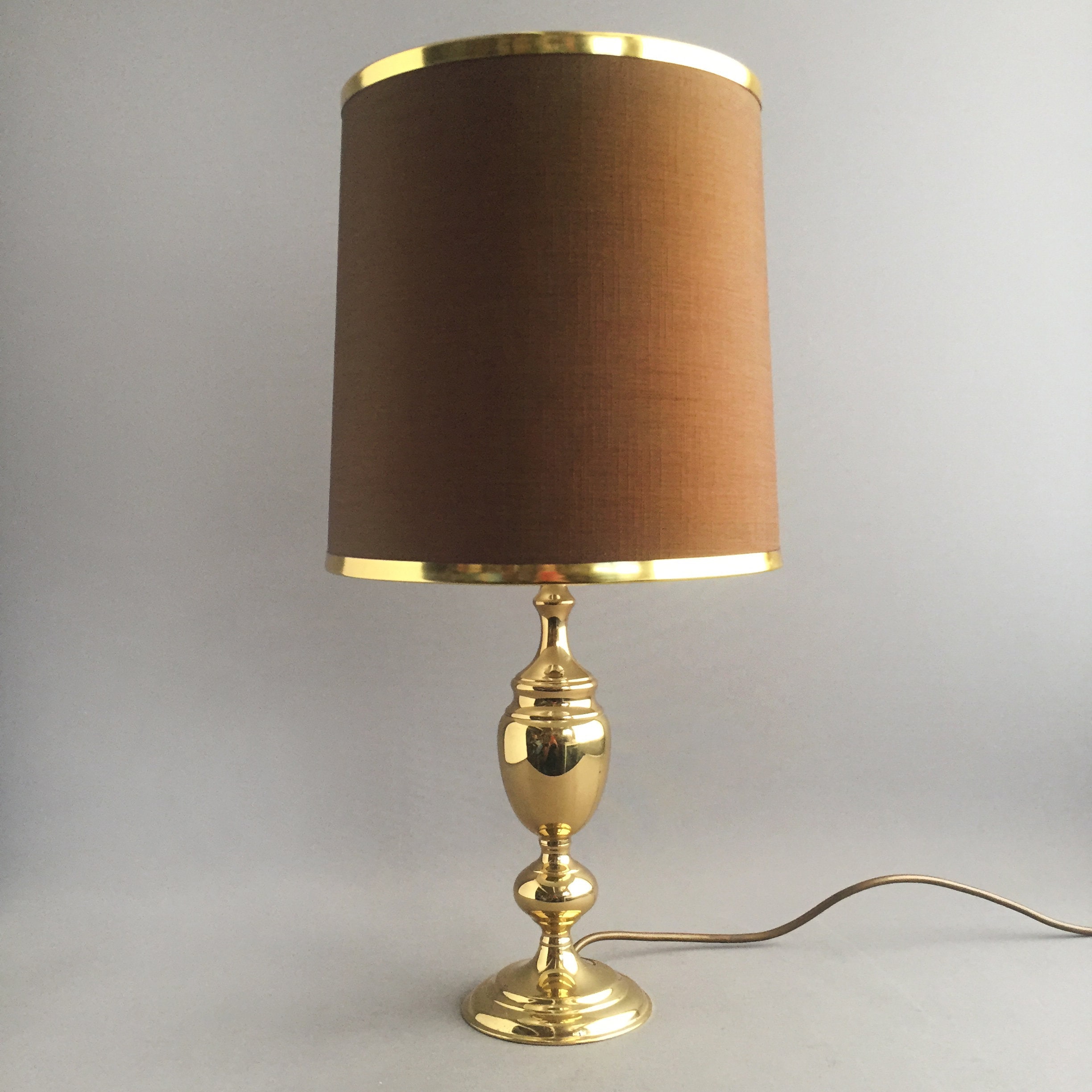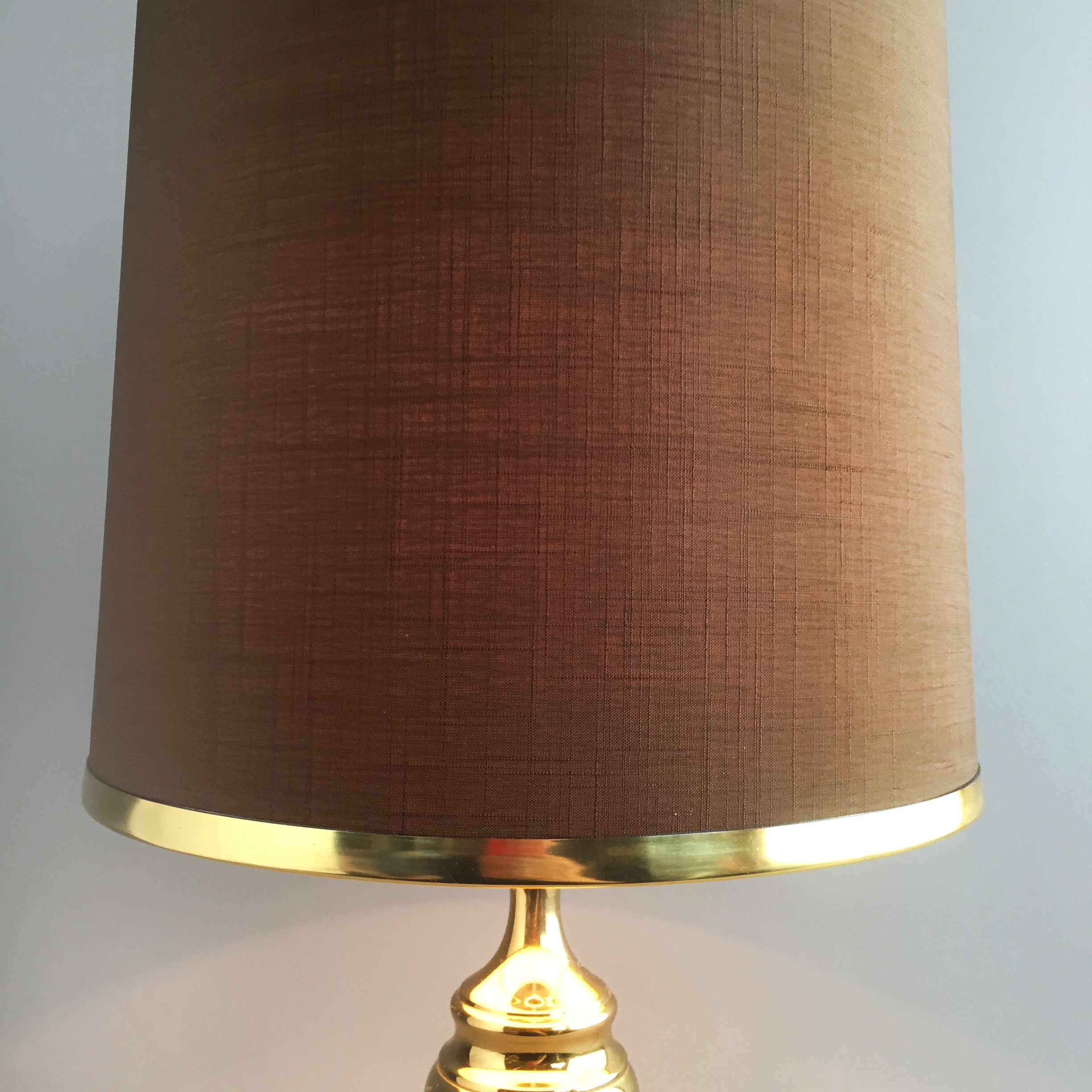 A stunning 1970s brass lamp with brown linen like fabric shade and brass coloured metal rim detail. wired for uk use
