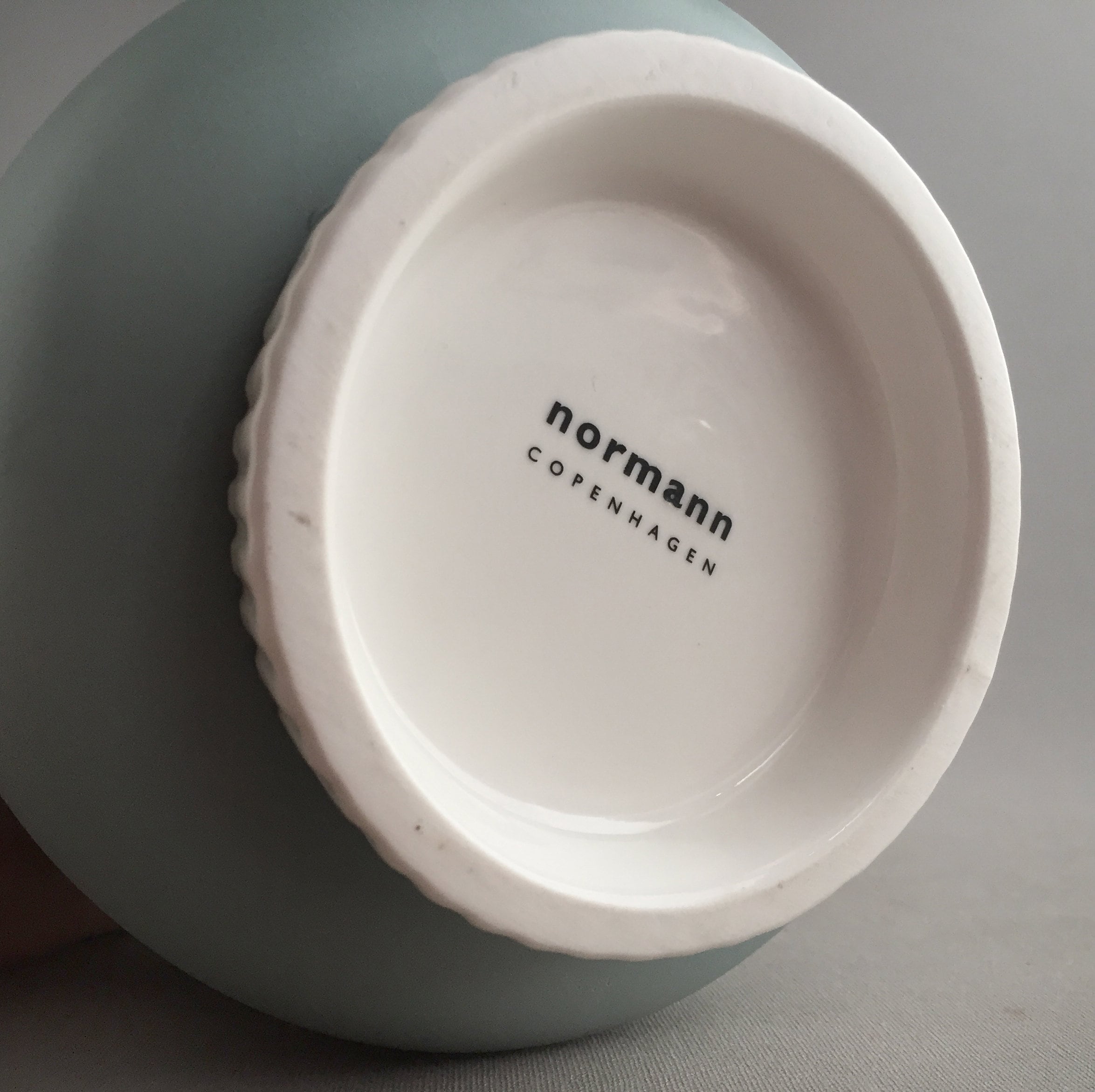 A highly Collectible Normann Copenhagen Nyhavn vase. Made of Porcelain with a glossy white neck and foot with relief. Contrasted by a matt coloured body, The vases are hand painted , this one is a grey-blue- green , what I would call duck egg blue