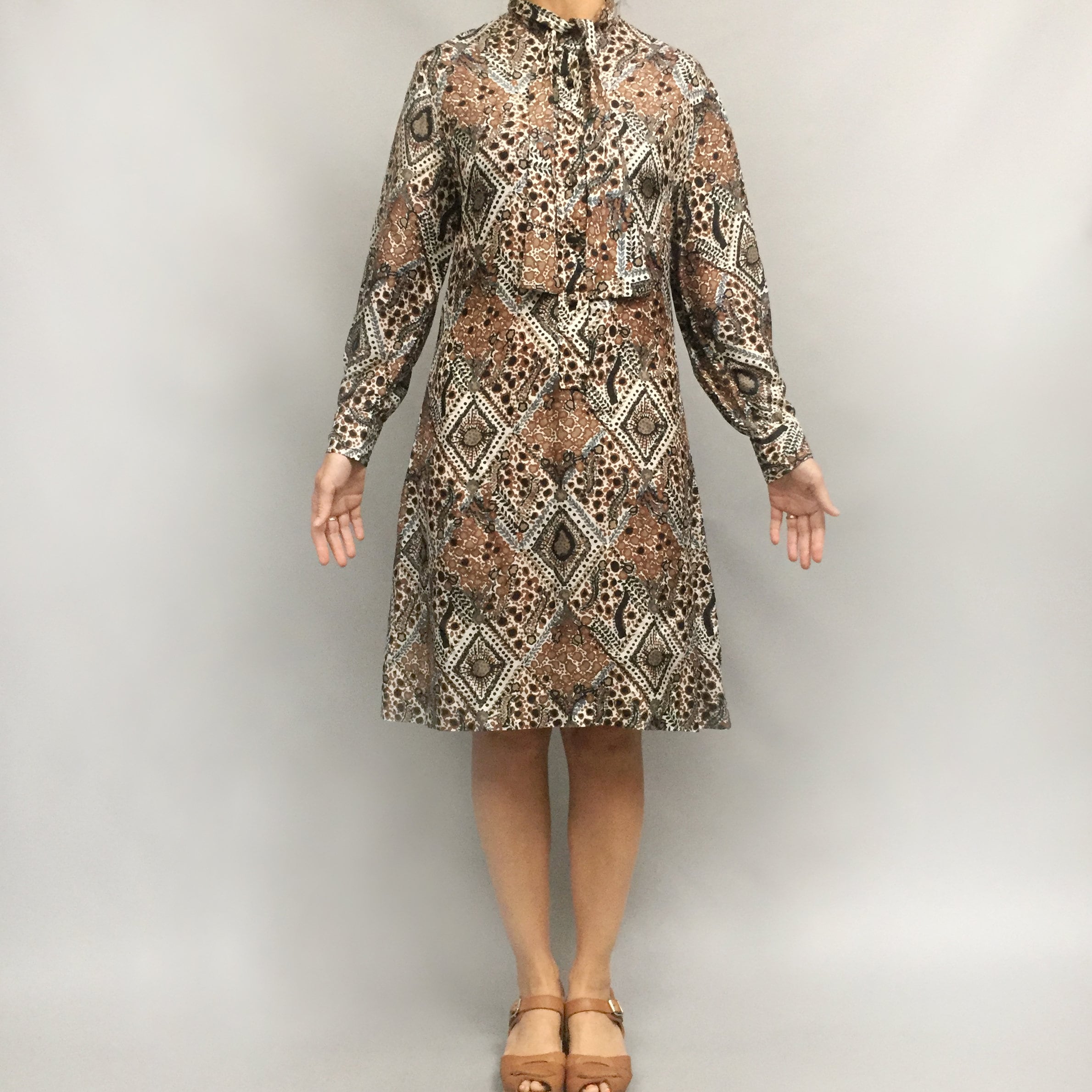 This is a pure silk , mint condition 1970s dress. The fabric is super sheer and the colour pallet is brown, black , taupe and dusty grey -blue on a off white background. Flowers and vines in a geometric pattern. Long sleeves that are cuffed and slightly billowy . Ties at the neck - wear it bowed or just tied- in a high crew neck. hem is just above the knee. wear with clogs for the 1970s look. This would fit a uk 10- 12